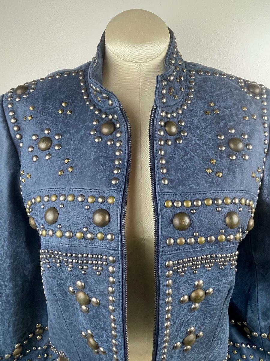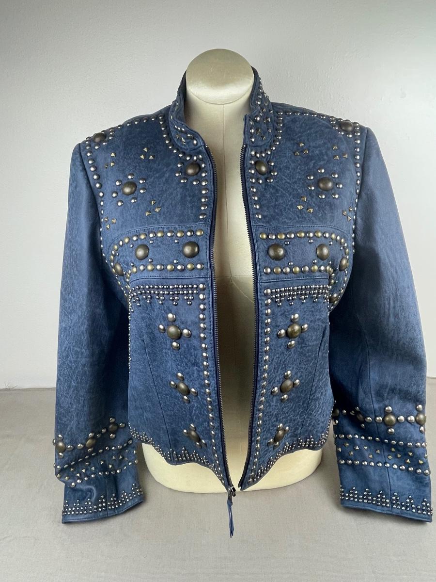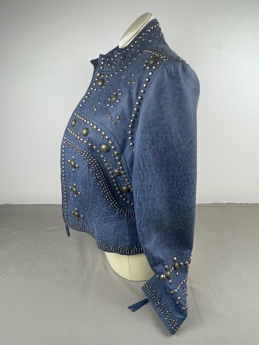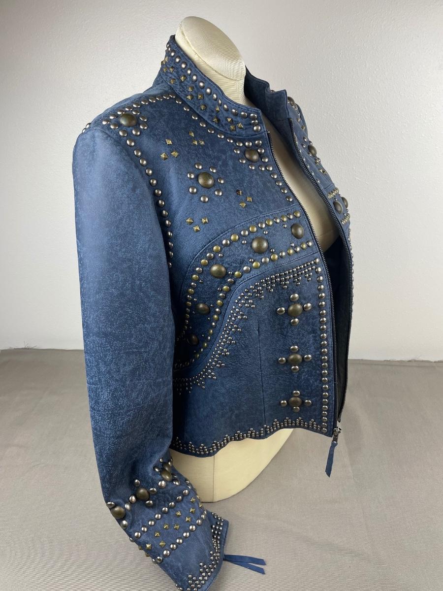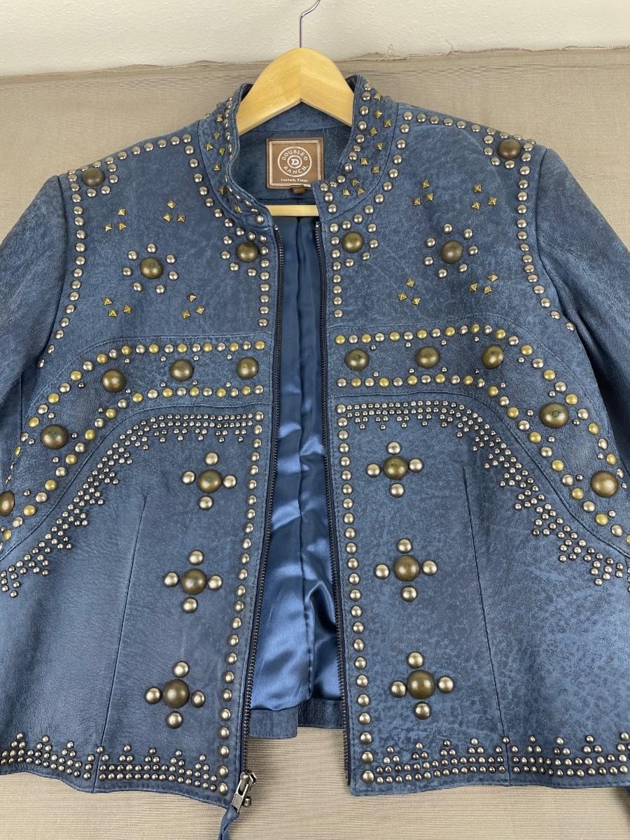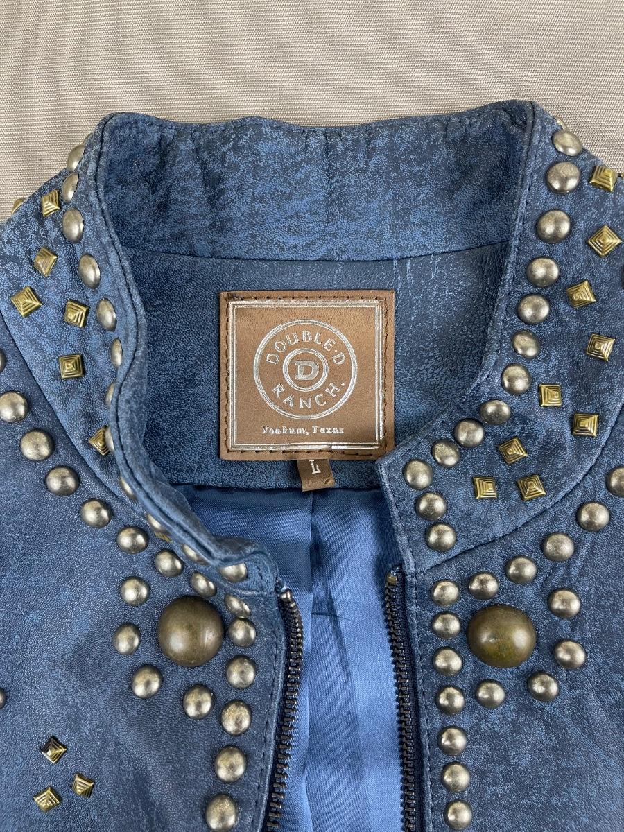 New without tags genuine leather jacket with antique gold tone studs. From Double D Ranch Youkum Texas. 100% leather in a denim blue color fully lined. The jacket measures approximately 21 inches across the bust, 23” long down the center back, and sleeve length is 25”. The poly lining is in excellent condition and the leather is in clean condition. No studs appear to missing, however there is some oxidation on the largest studs.