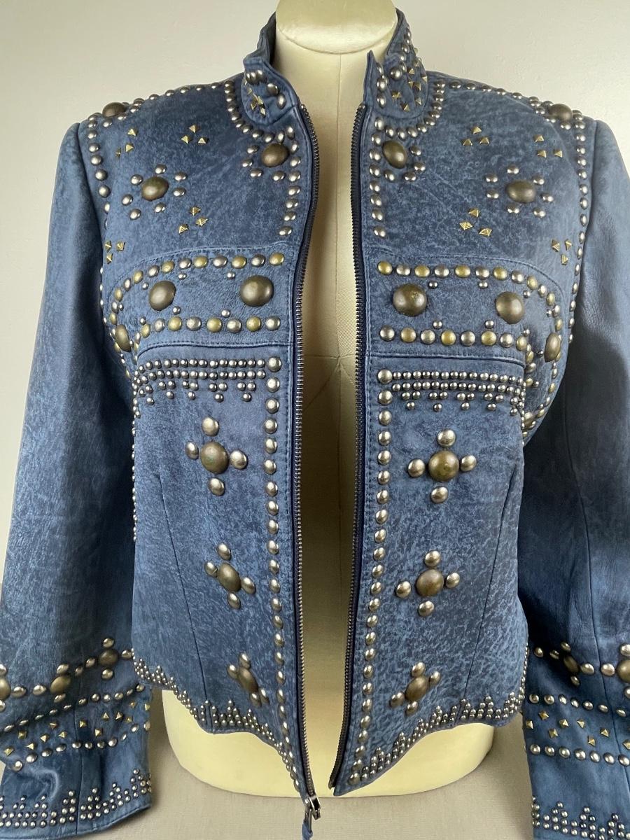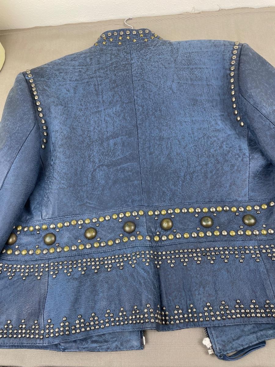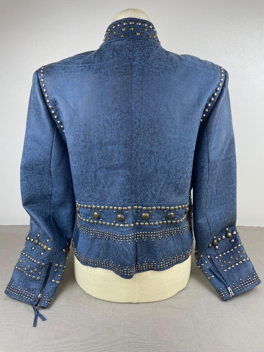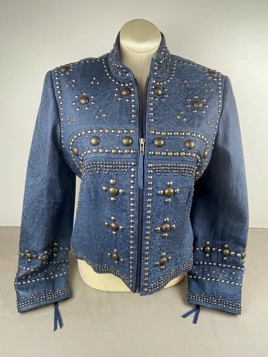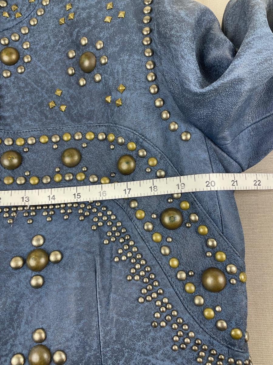 New without tags genuine leather jacket with antique gold tone studs. From Double D Ranch Youkum Texas. 100% leather in a denim blue color fully lined. The jacket measures approximately 21 inches across the bust, 23” long down the center back, and sleeve length is 25”. The poly lining is in excellent condition and the leather is in clean condition. No studs appear to missing, however there is some oxidation on the largest studs.