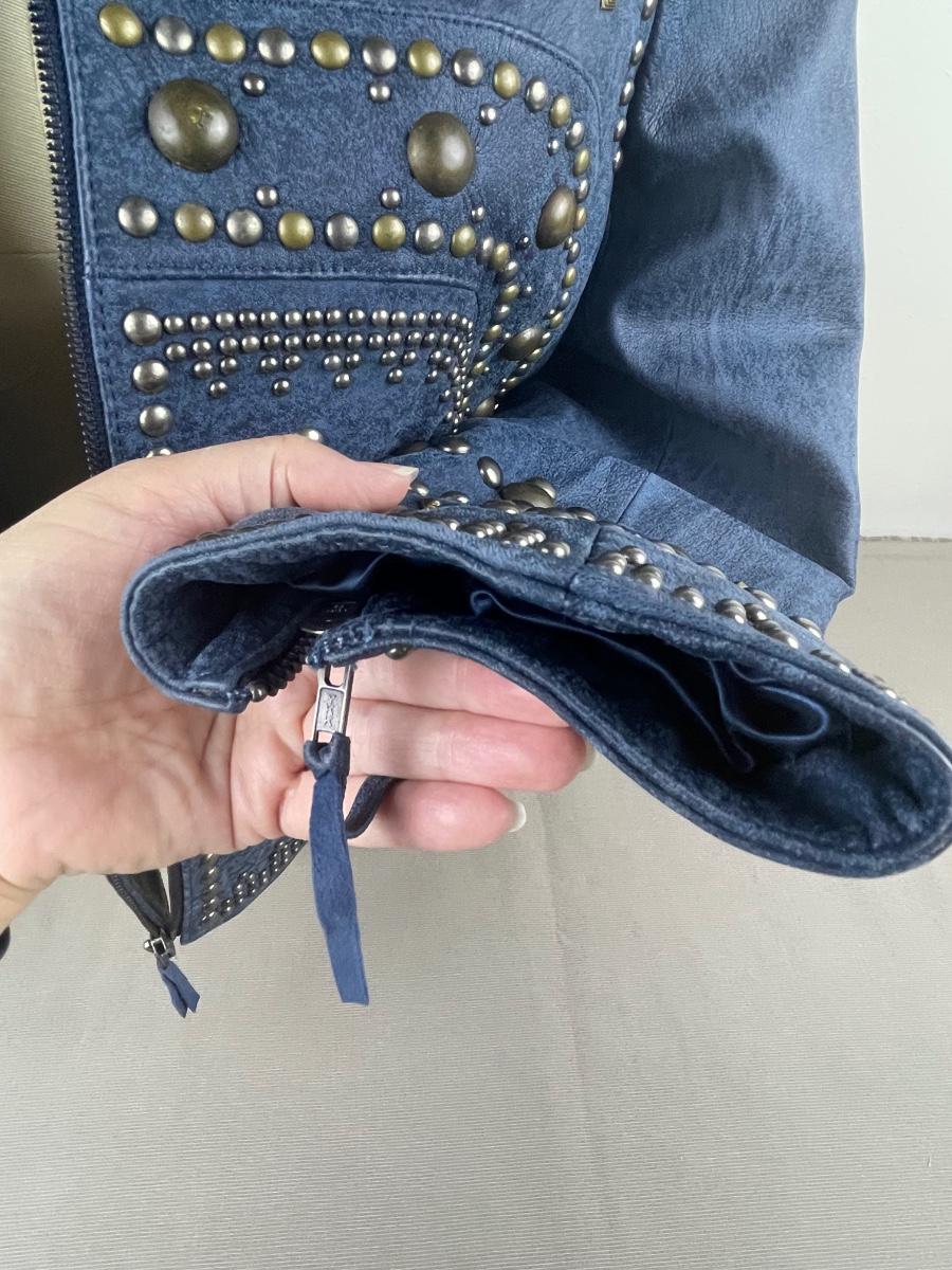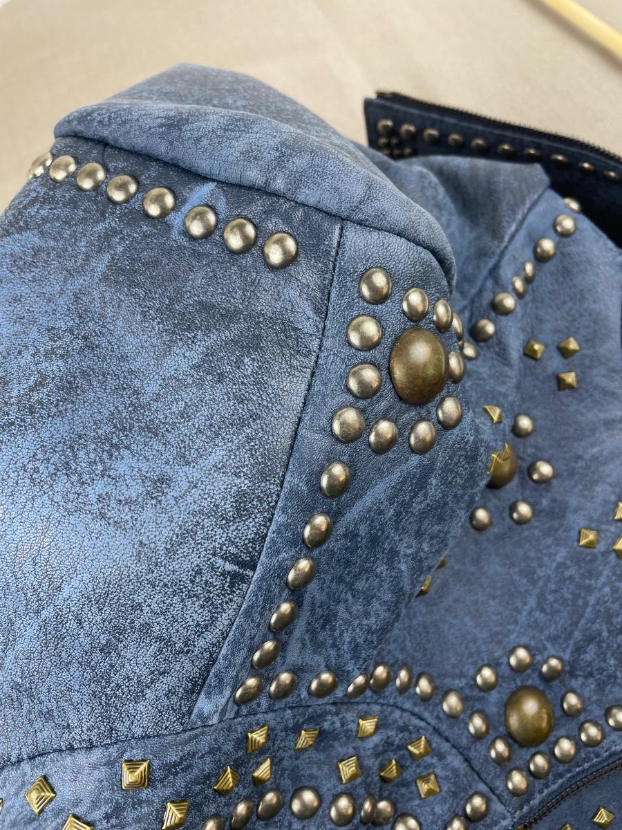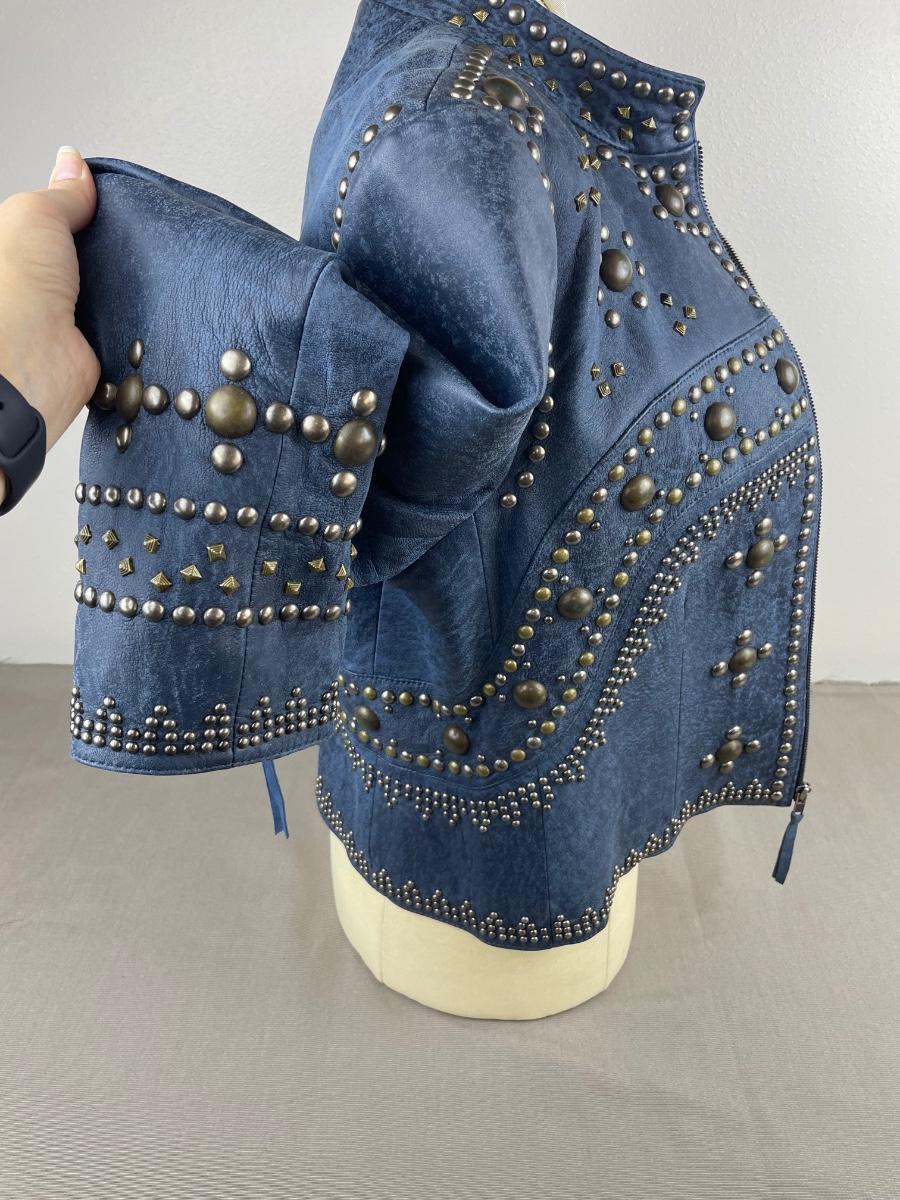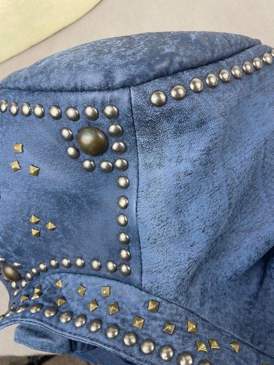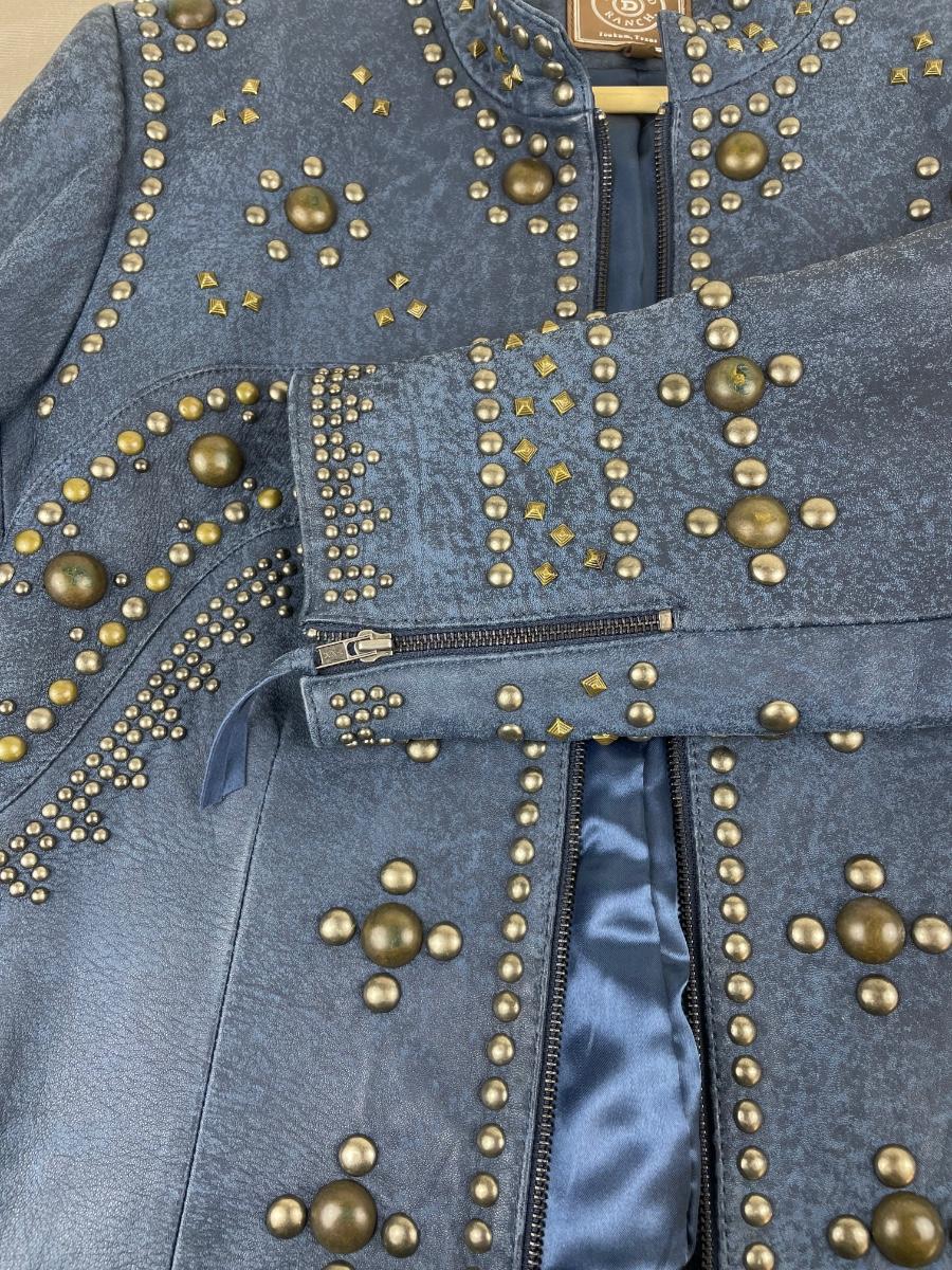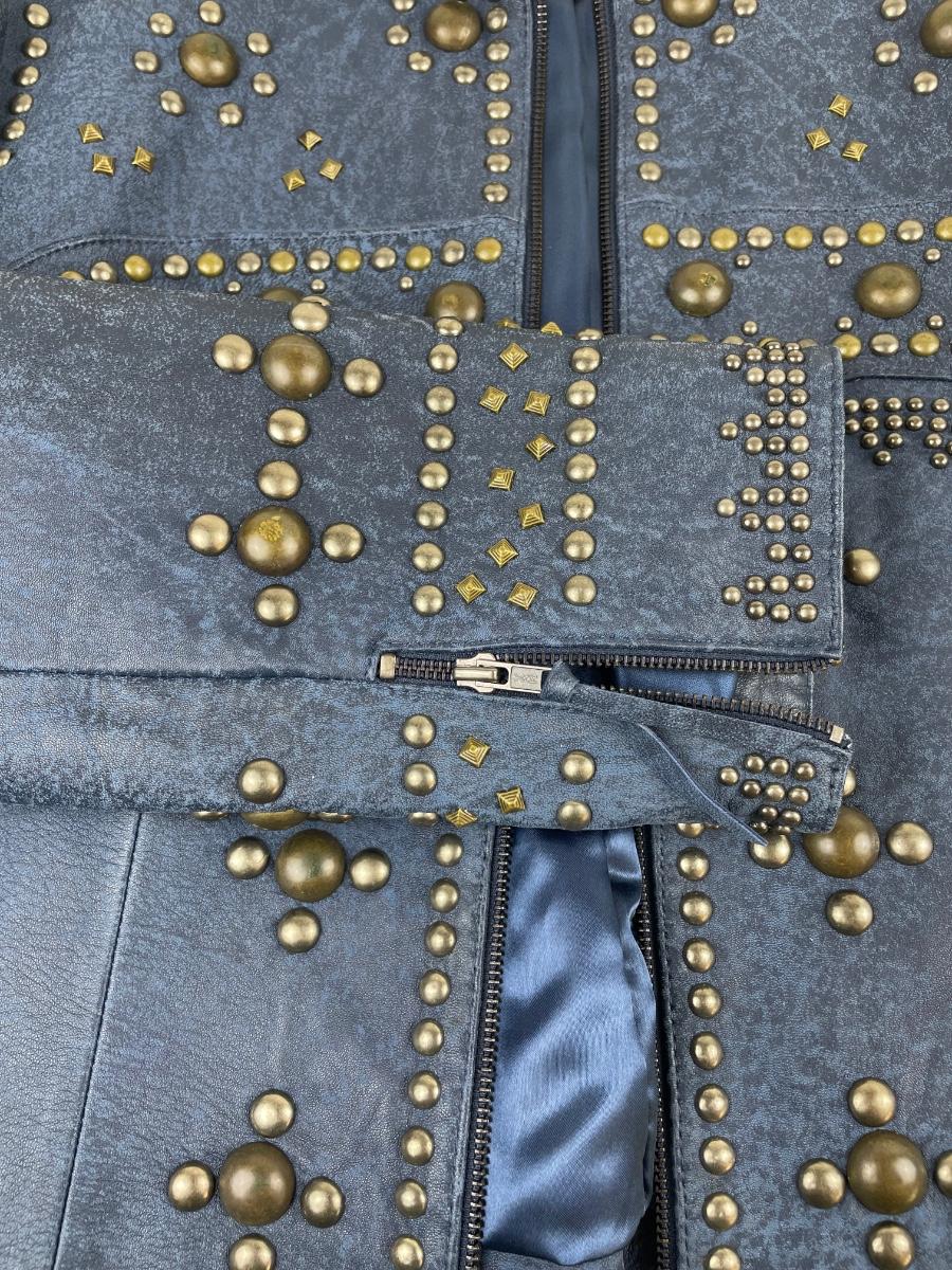 New without tags genuine leather jacket with antique gold tone studs. From Double D Ranch Youkum Texas. 100% leather in a denim blue color fully lined. The jacket measures approximately 21 inches across the bust, 23” long down the center back, and sleeve length is 25”. The poly lining is in excellent condition and the leather is in clean condition. No studs appear to missing, however there is some oxidation on the largest studs.