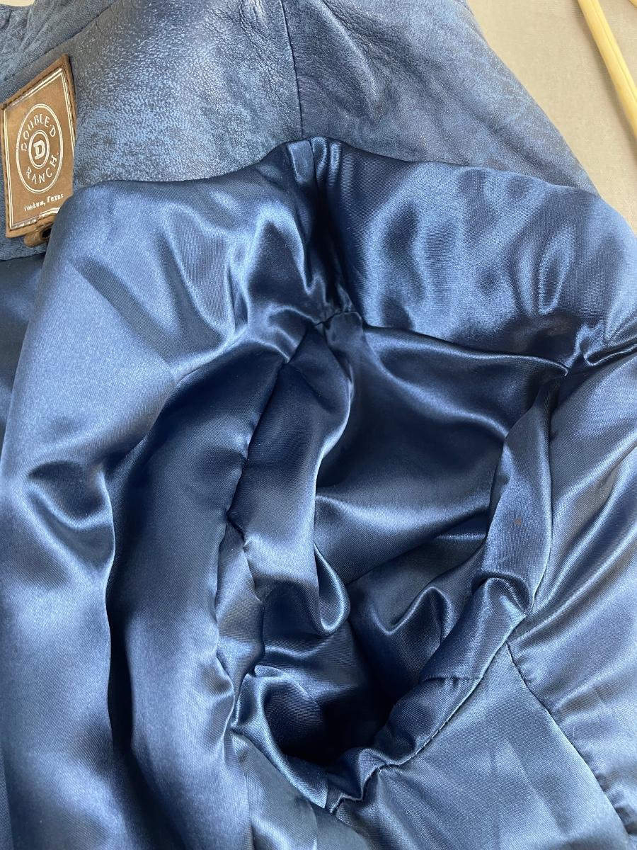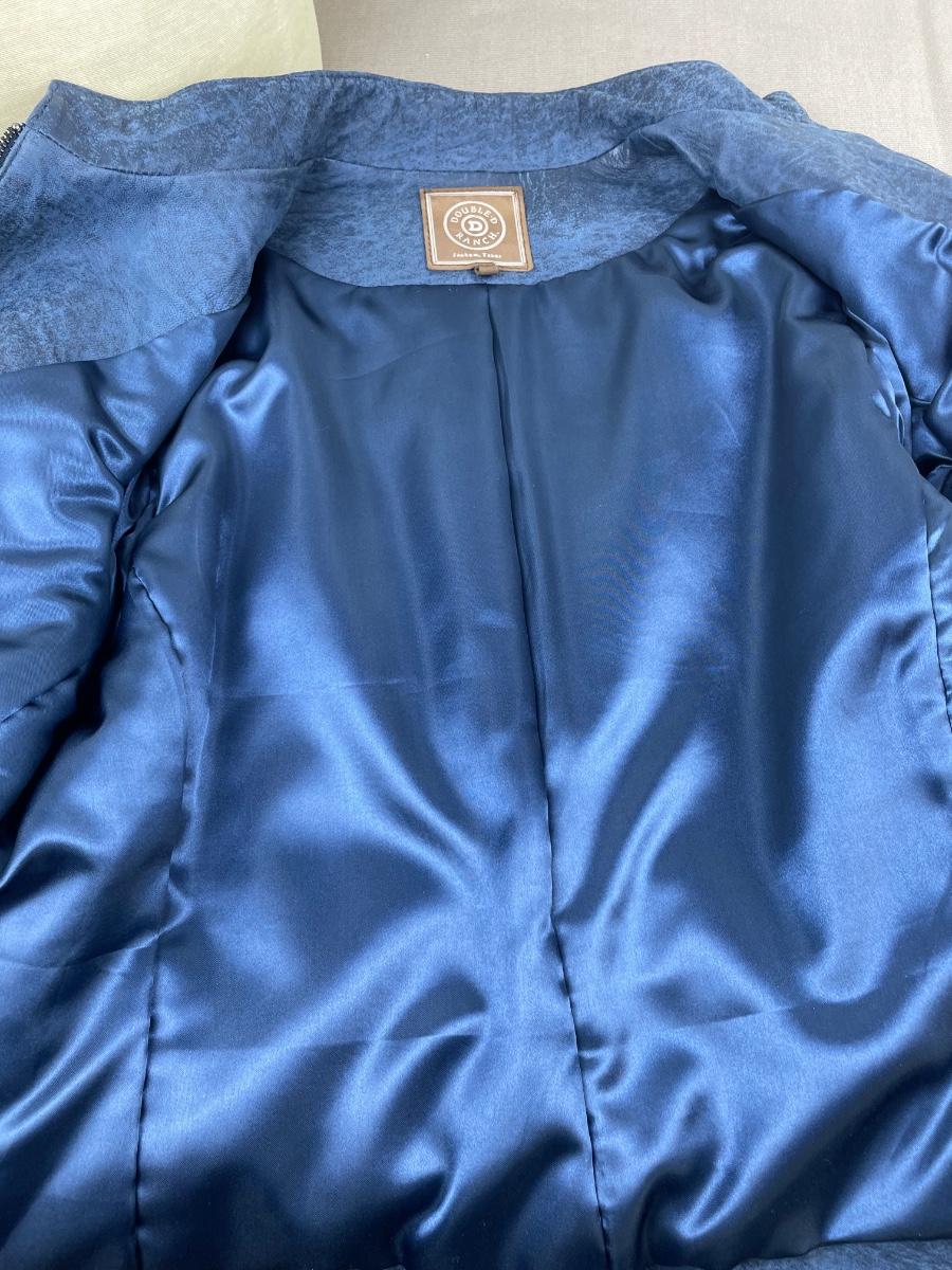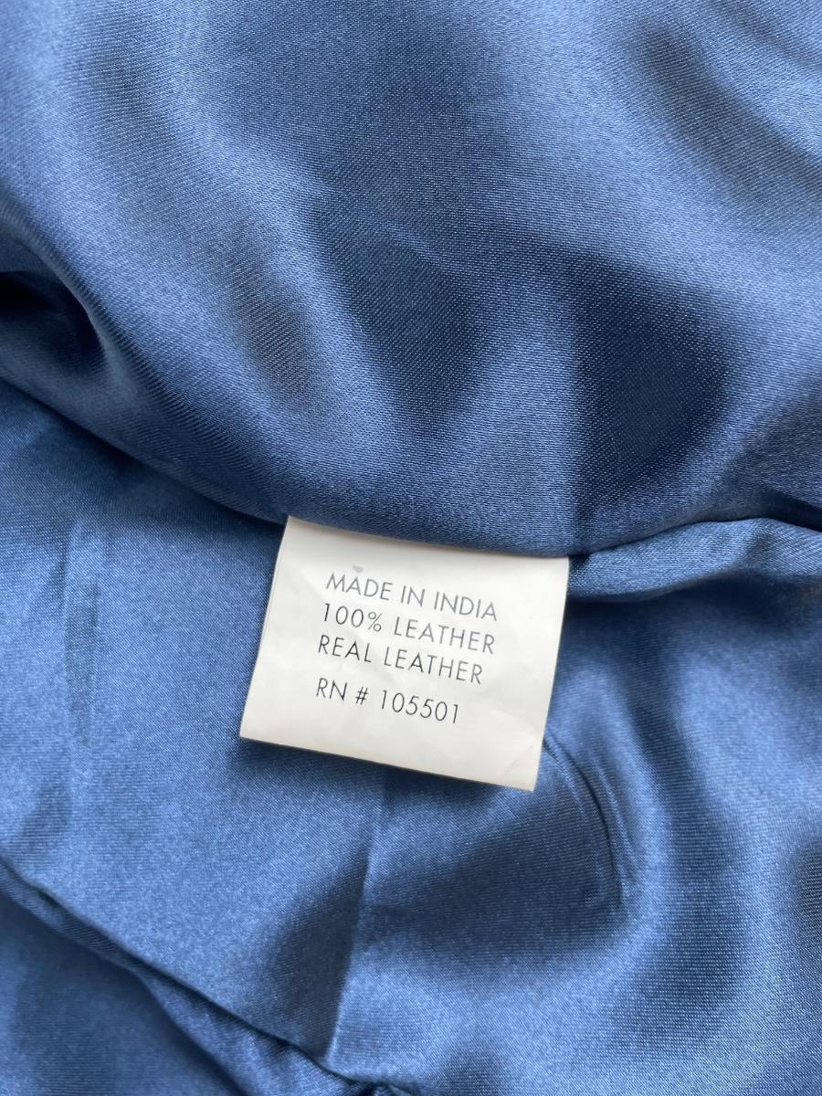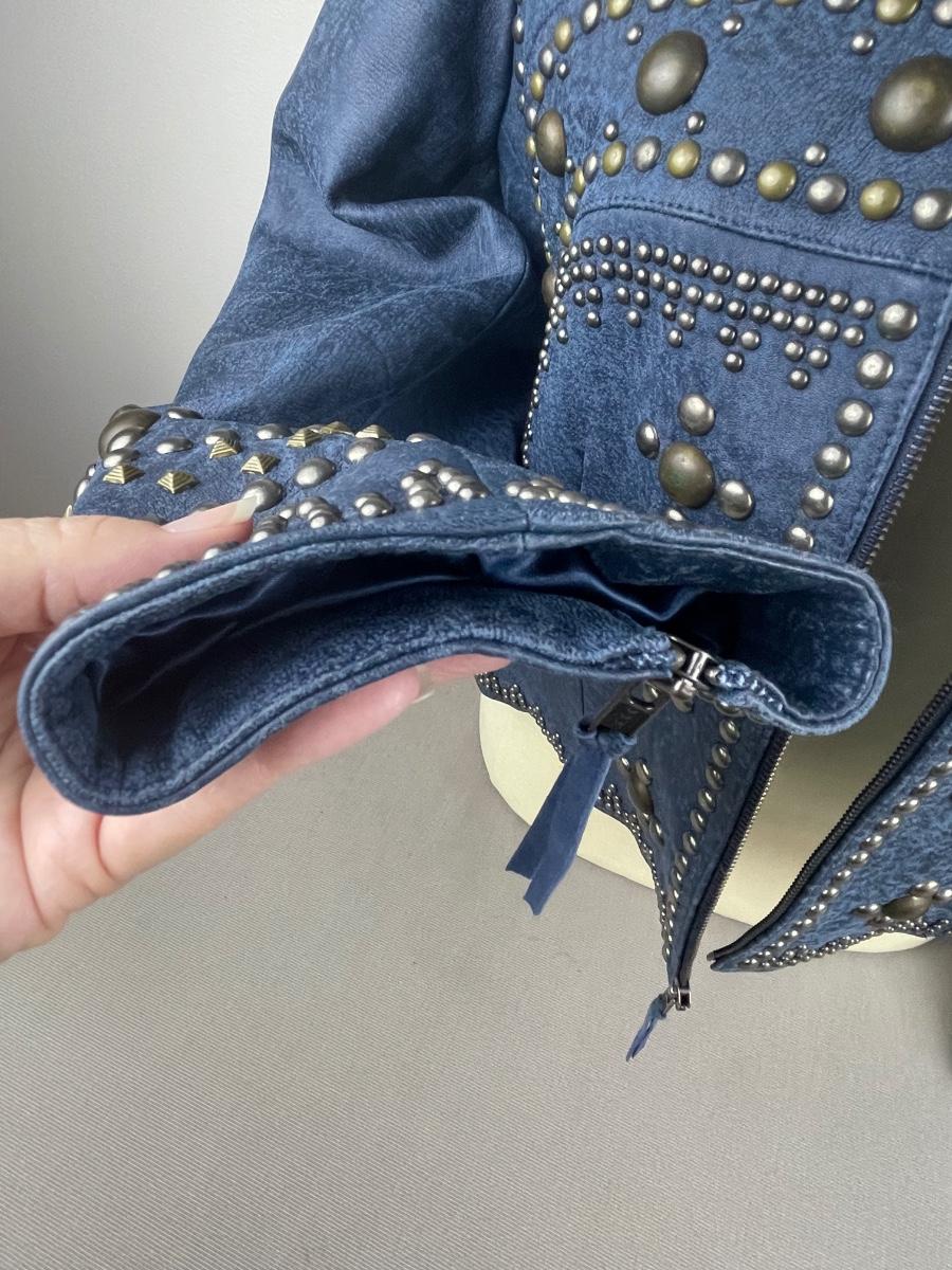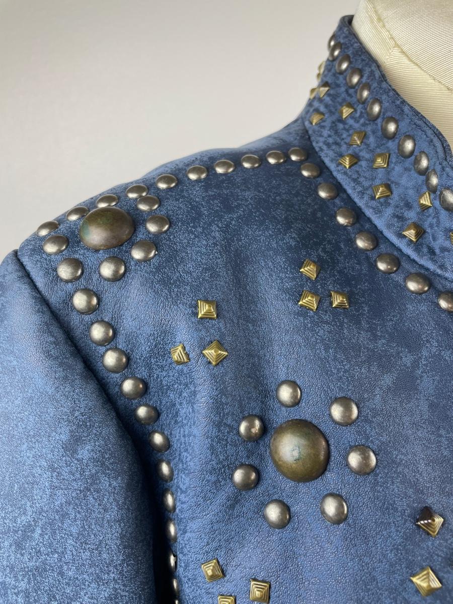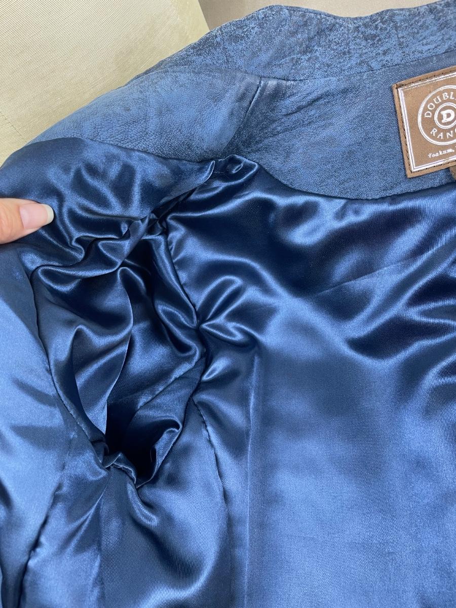 New without tags genuine leather jacket with antique gold tone studs. From Double D Ranch Youkum Texas. 100% leather in a denim blue color fully lined. The jacket measures approximately 21 inches across the bust, 23” long down the center back, and sleeve length is 25”. The poly lining is in excellent condition and the leather is in clean condition. No studs appear to missing, however there is some oxidation on the largest studs.