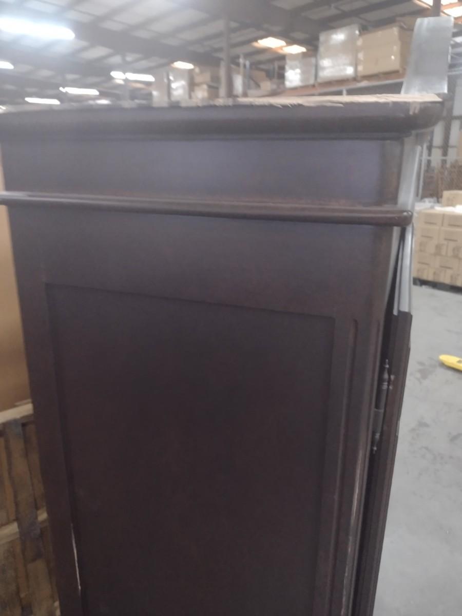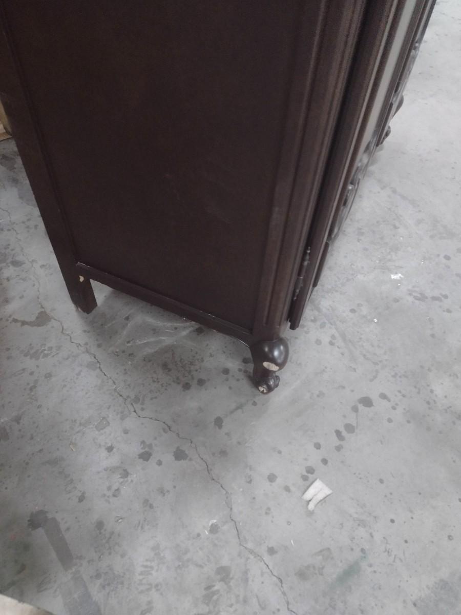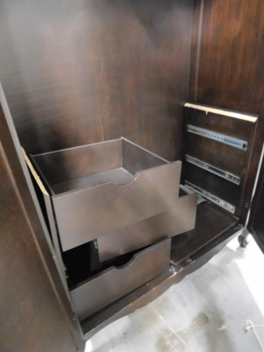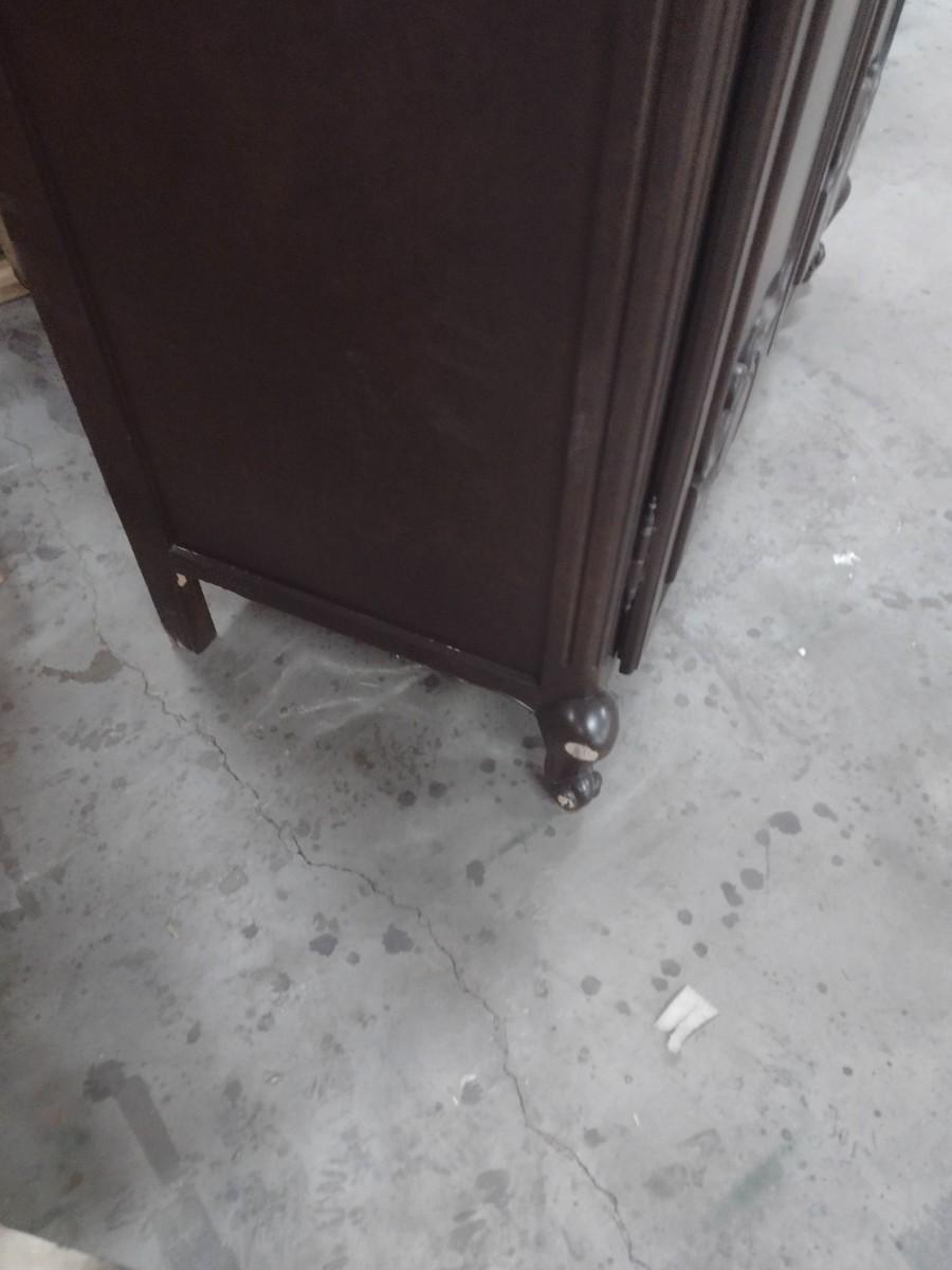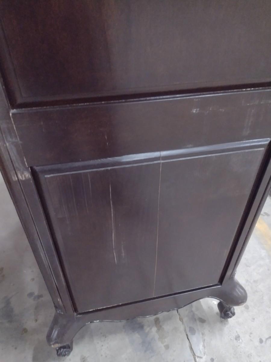 Double Door French Regency Design Armoire Media Center Mahogany Finish Choice B. Has some scrapes one side panel. Sweater drawers are damaged as shown. Expect some wear or scratches to the finish. Shipping option available via freight or local mover at Buyer's expense. Buyer must have all shipping scheduled within the stated dates and times of pickup. Recommended local mover is Beaty Bros. Moving 828-201-2982