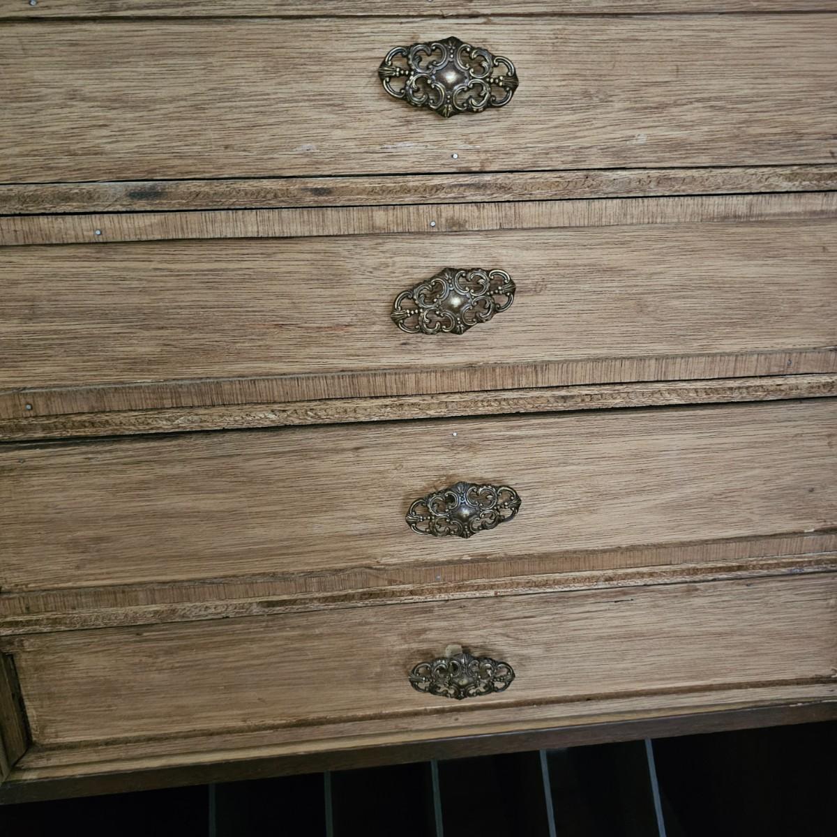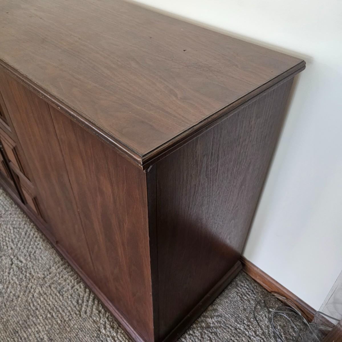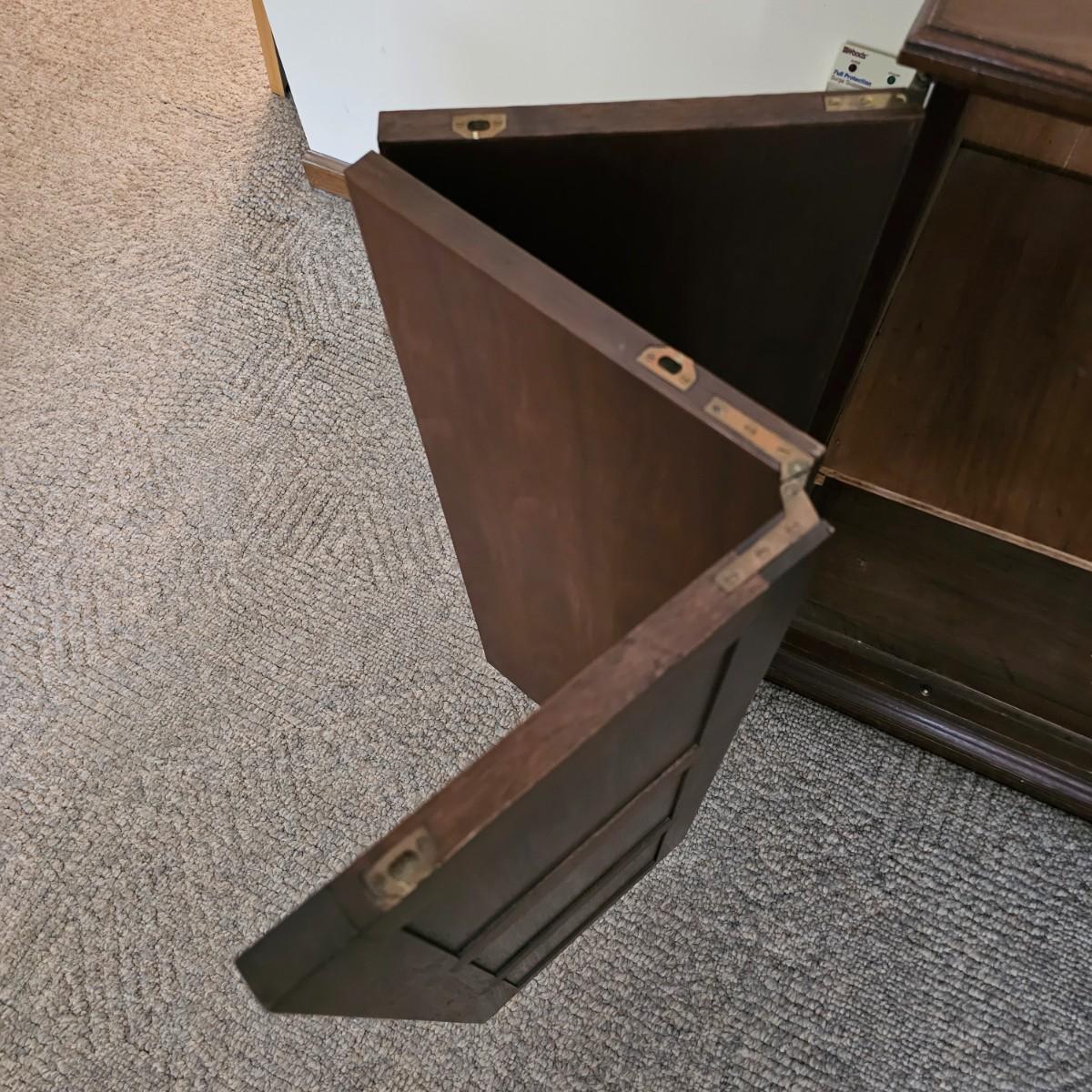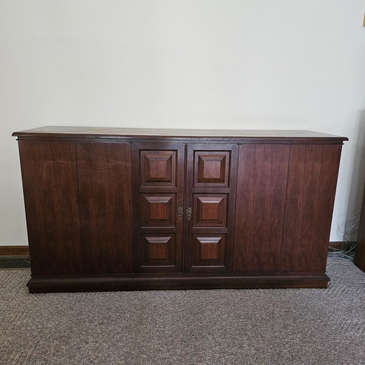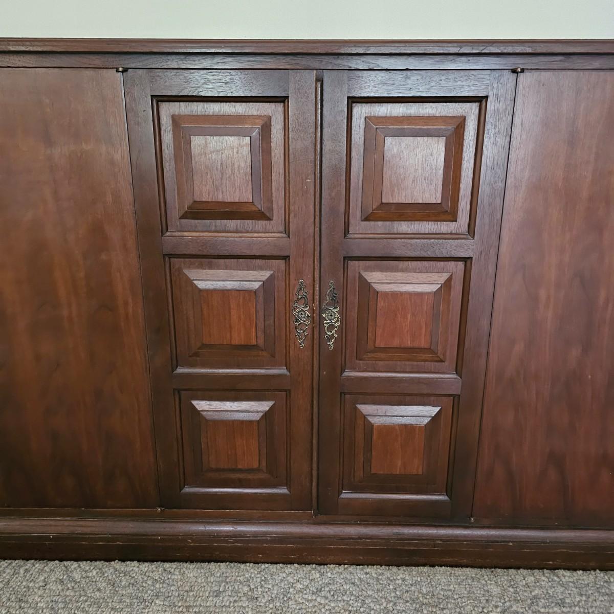 Media storage cabinet with double hinged doors that fold flat against the sides of the cabinet. Three open storage spots for albums, CDs, DVDs or other. Also, two slotted areas to hold vinyl as well. Set of four drawers with handles, may have been added after original purchase. Cabinet measures 67" x 18.5" x 35"H. Some moderate wear and tear on surfaces. See photos for details. This item is located on the ground floor with three steps down from the porch to the driveway. Local pickup only. Winning bidder must bring assistance to help move and load this item due to its weight and/or size.