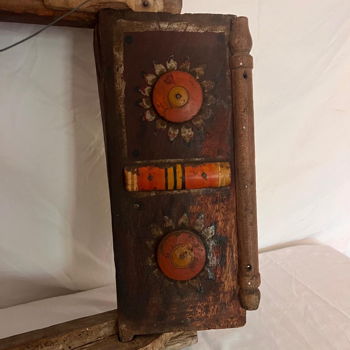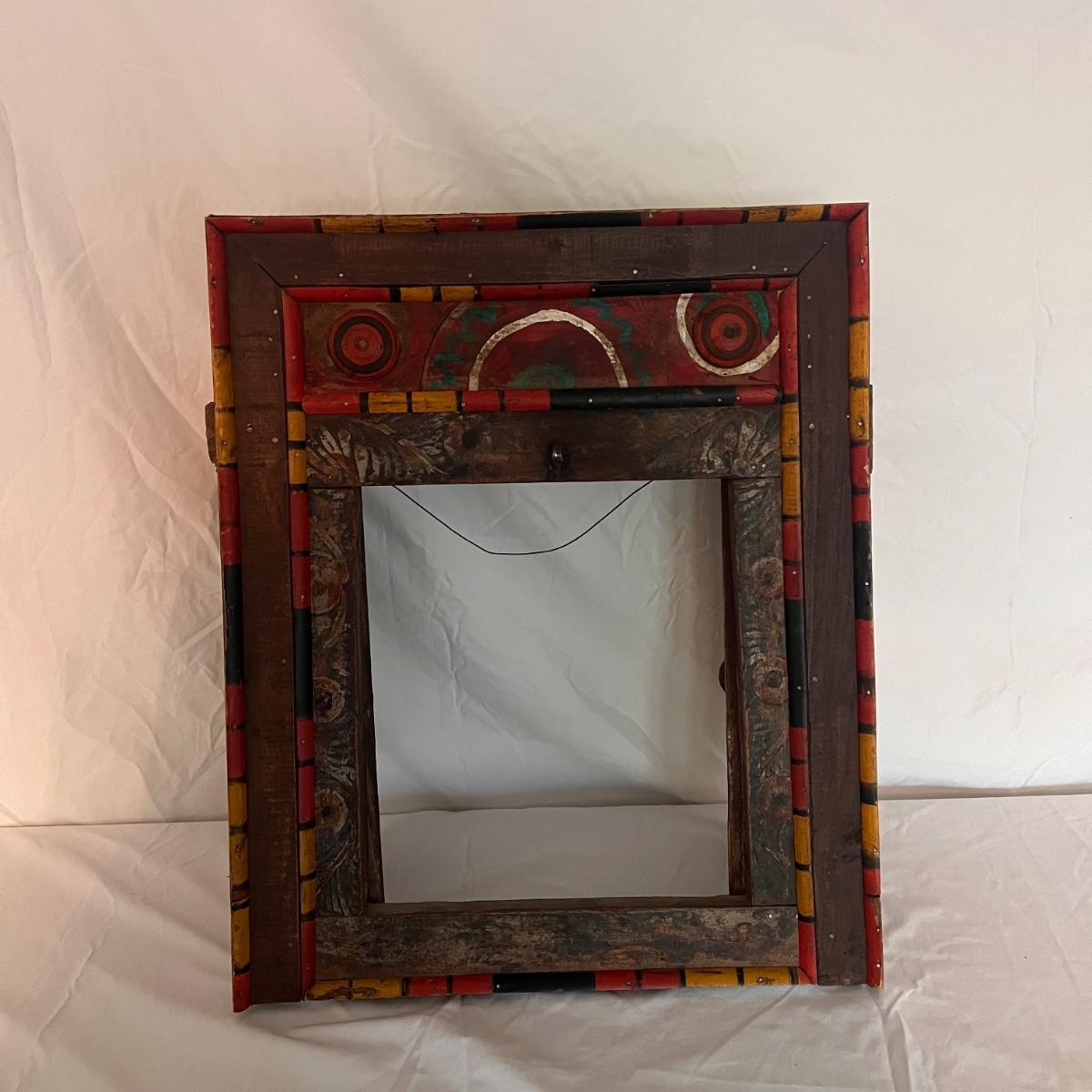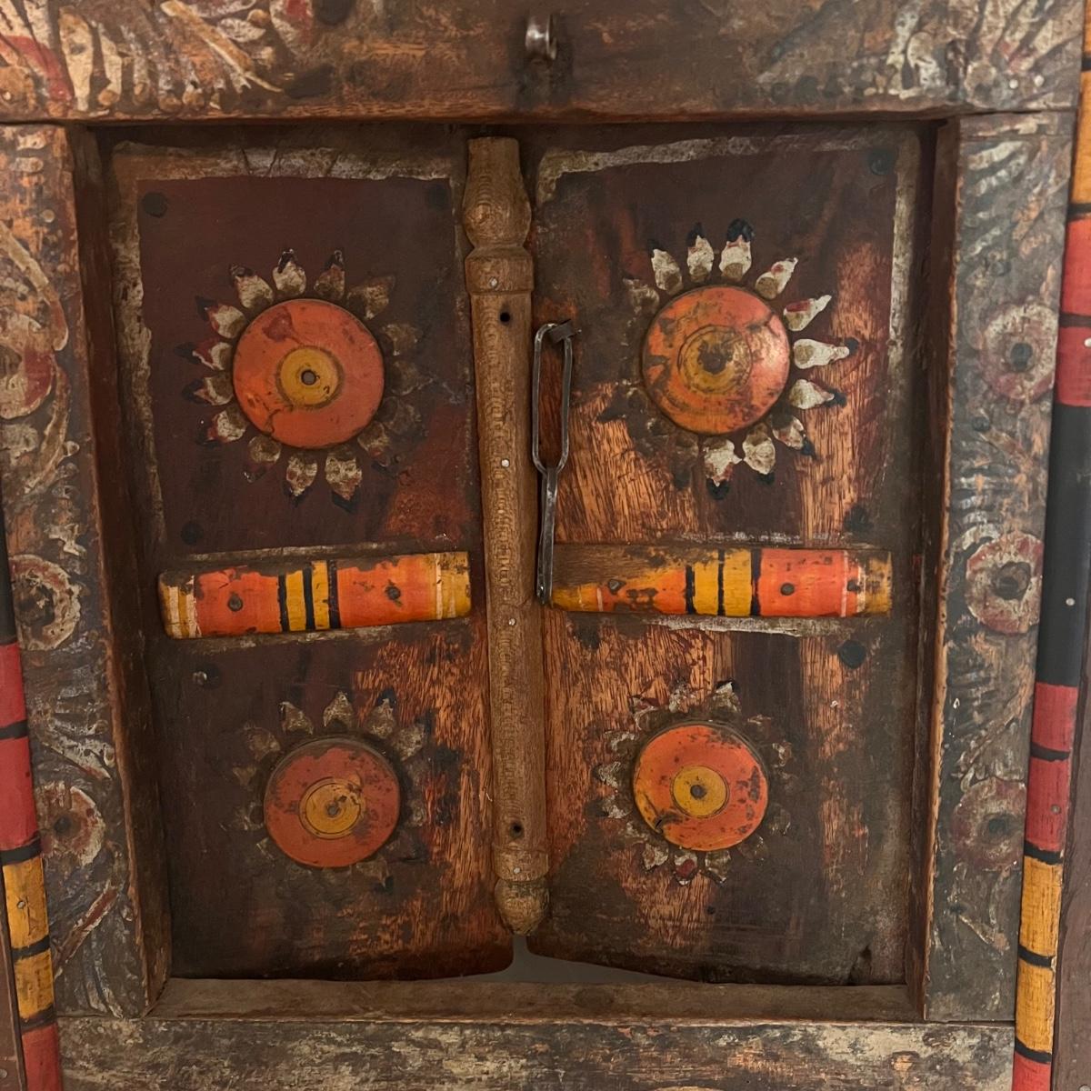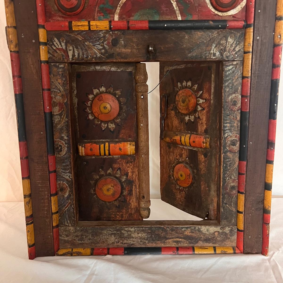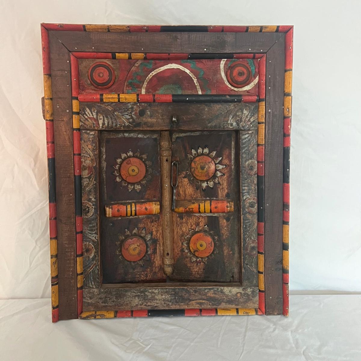 This art piece is made out of wood with two double doors that open and close in the middle. The entire piece measures 18.5" x 3" x 22"H. Shipping available. Shipping can be costly. We suggest contacting our preferred local shipping provider, Postage Express, with dimensions and getting an estimate before bidding: (828) 255-9250 or shipping@postageexpressnc.com.