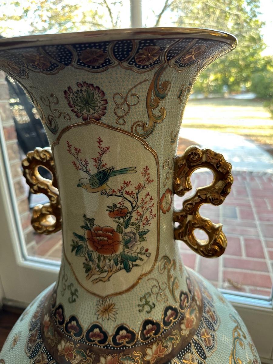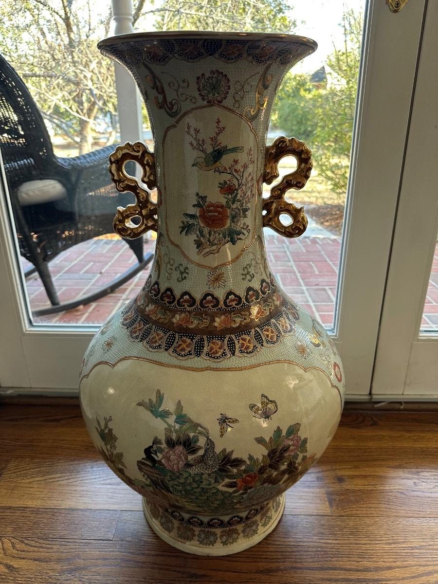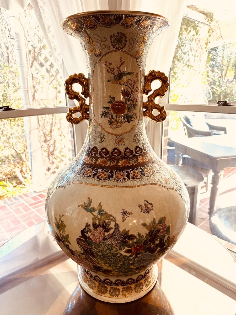 DOUBLE DRAGON HANDLE OVERSIZED ASIAN VASE BIRD DECORATED 28 1/2" TALL