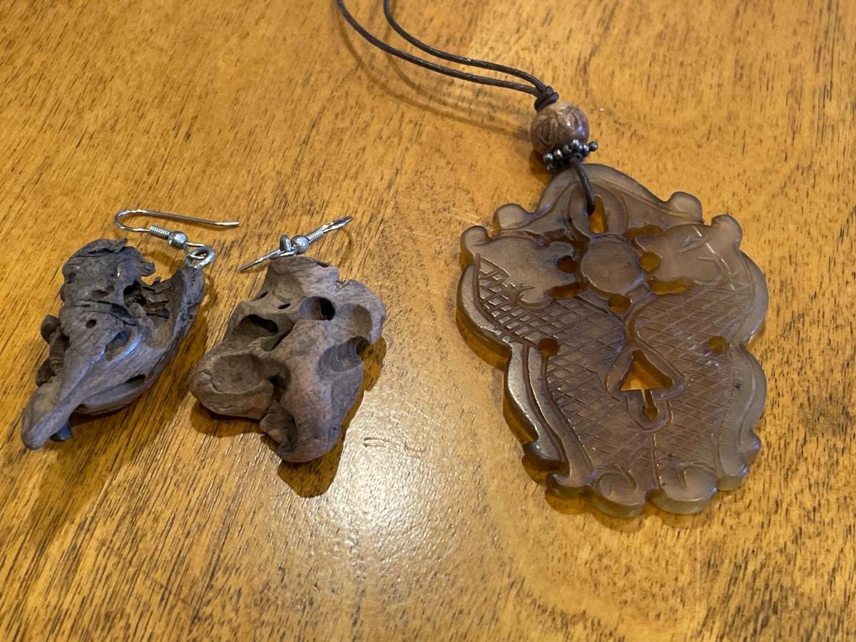Double Dragon necklace and wood earrings