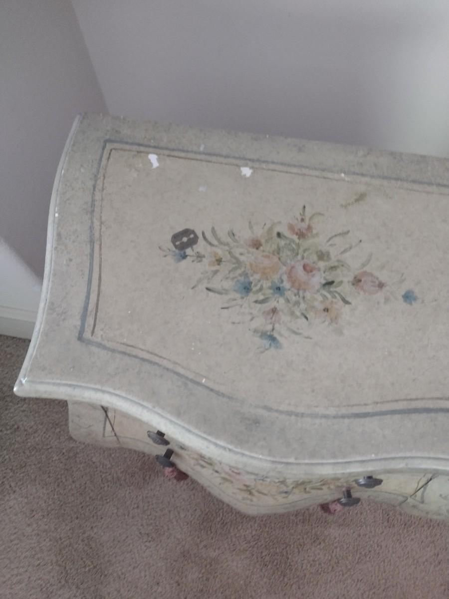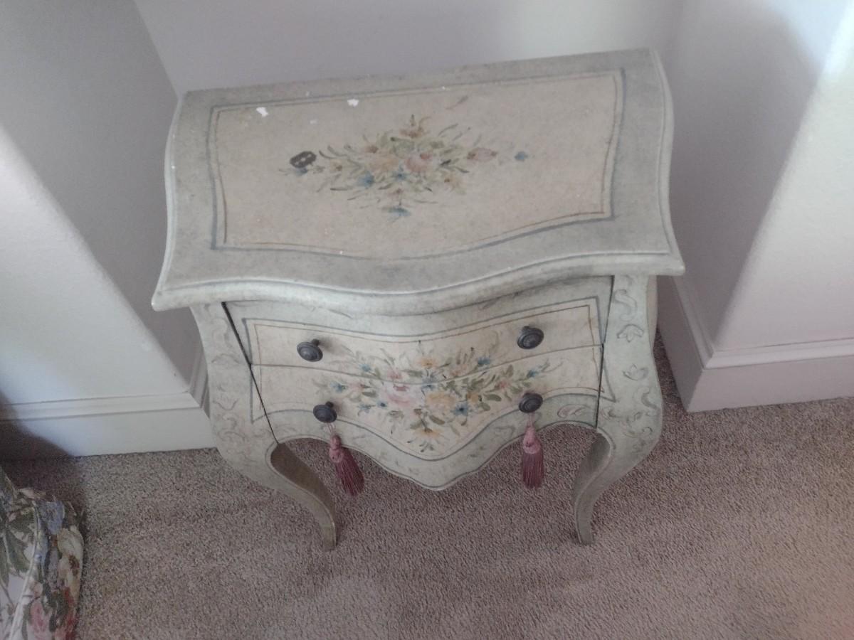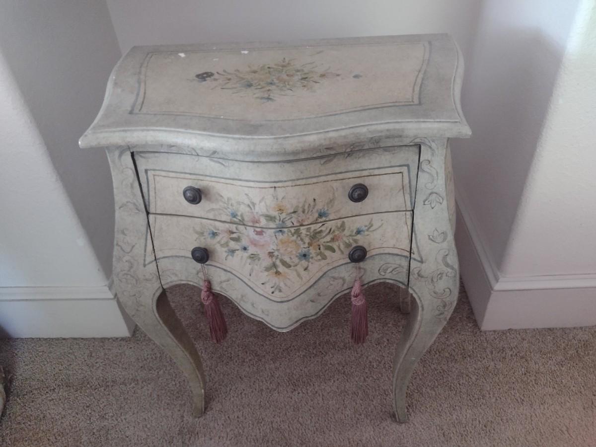 Double Drawer Bombay Painted Chest. Has a few places with loose paint as shown. Upstairs item