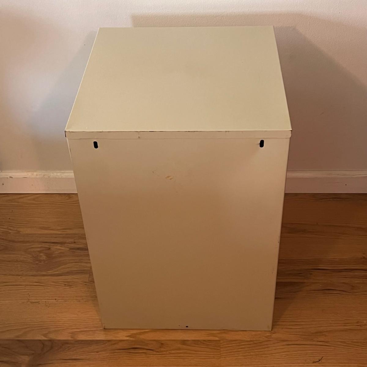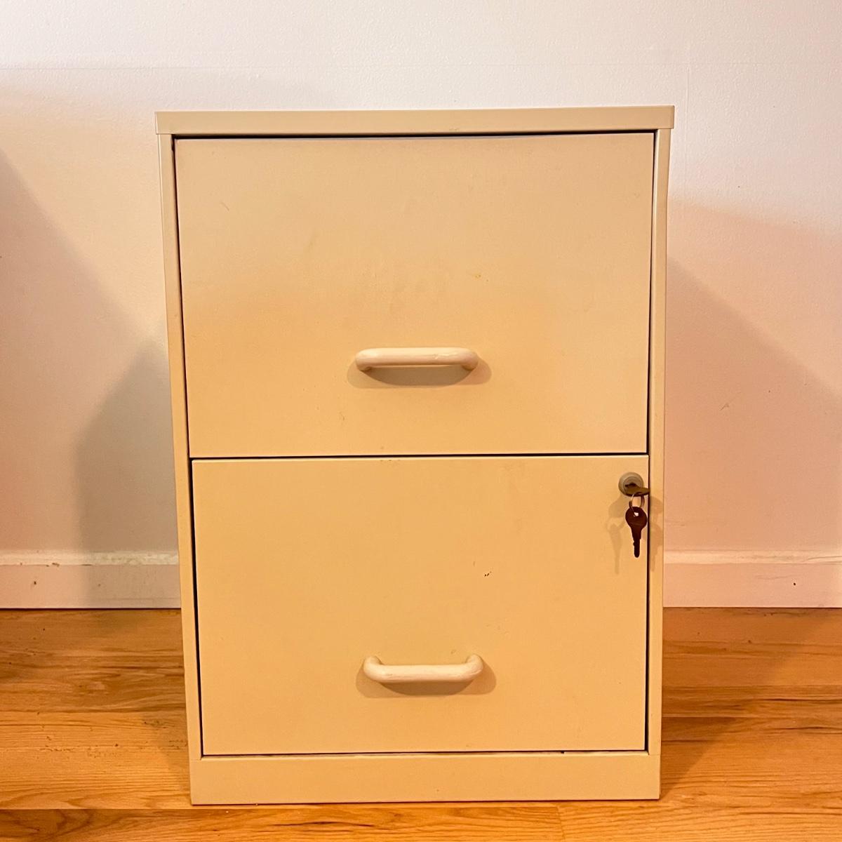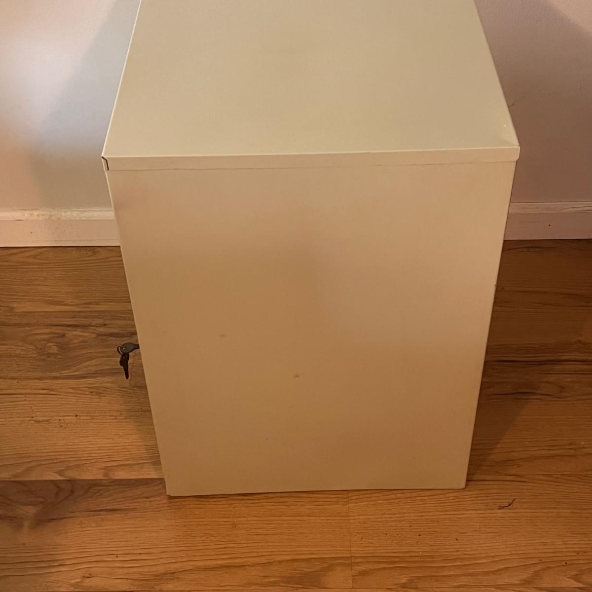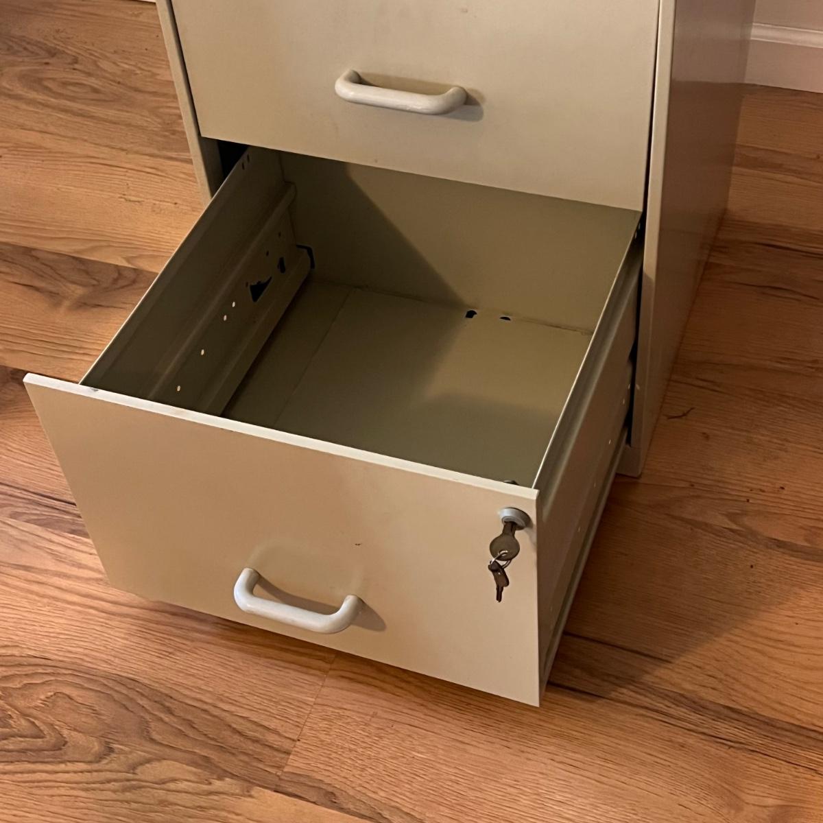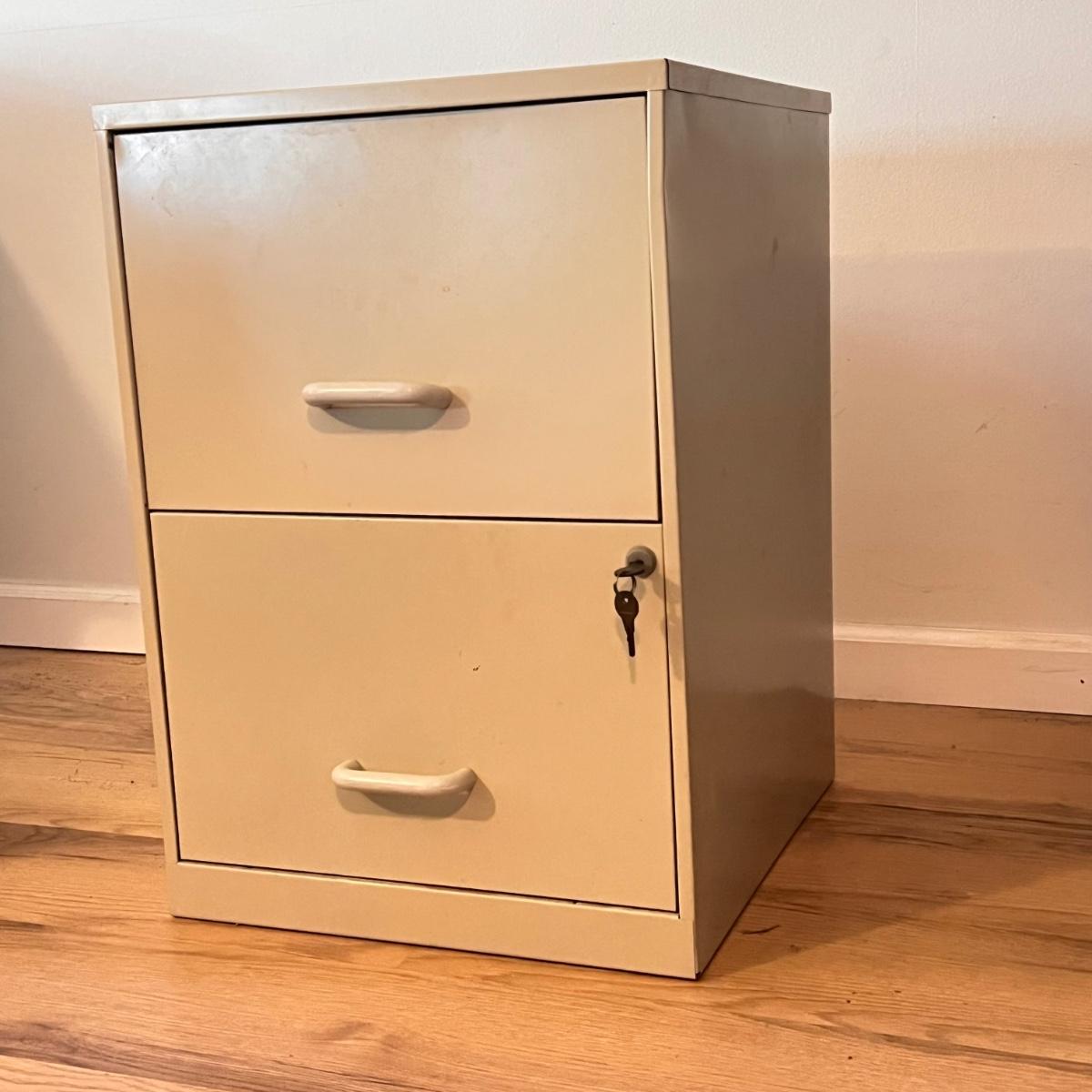 This metal cabinet measures 17.25” x 18” x 24.75”H. It has two drawers with sturdy handles and a functioning lock and key for the bottom drawer - see pictures included. Local pickup only.