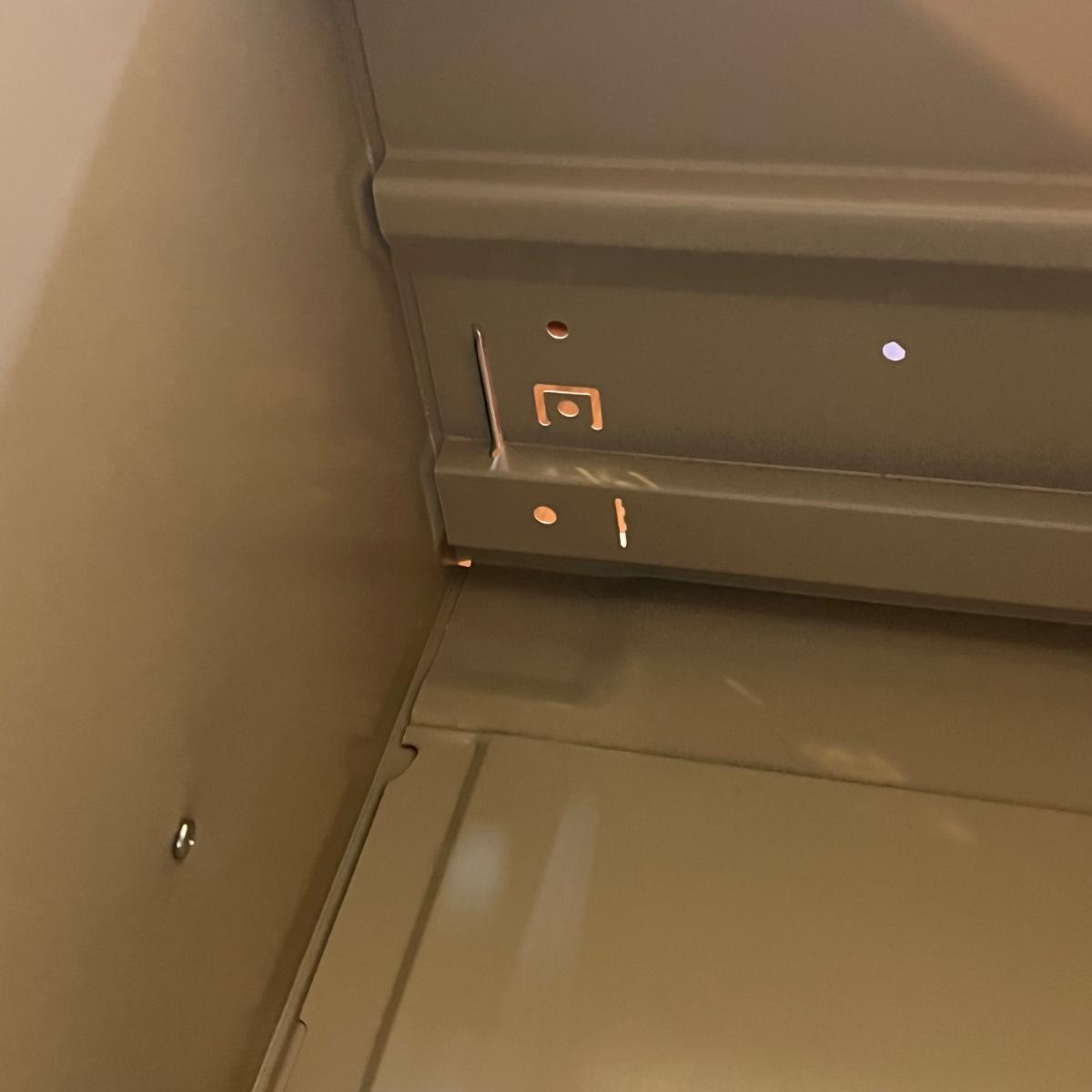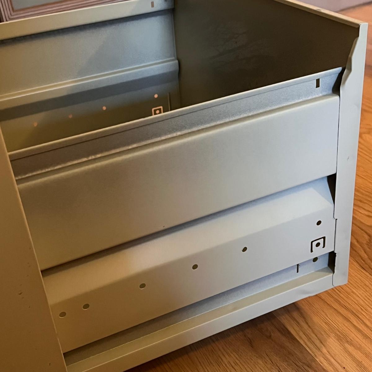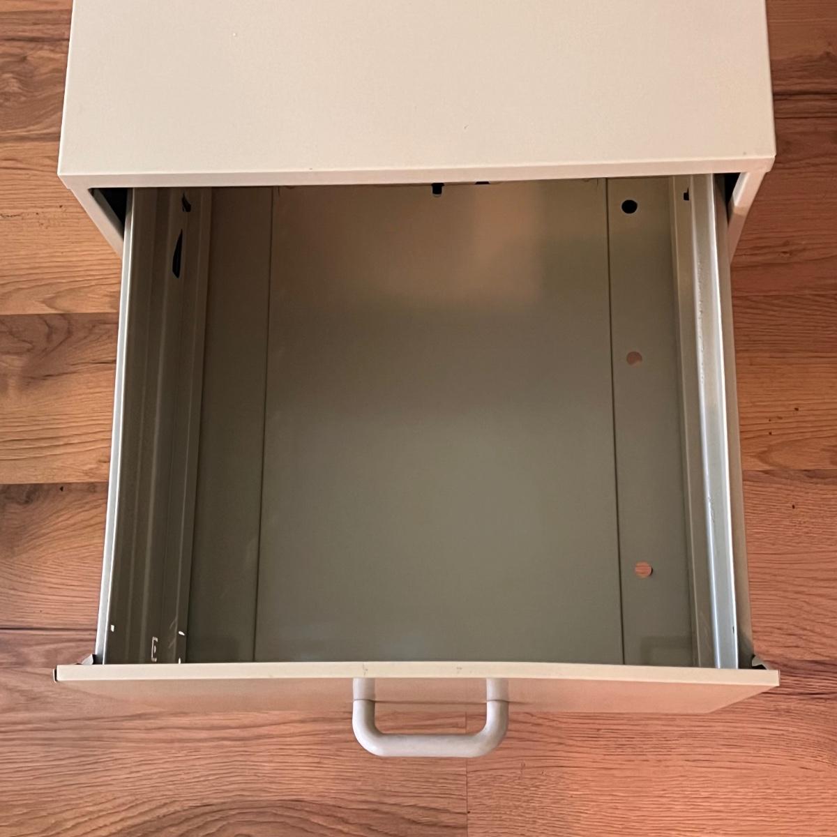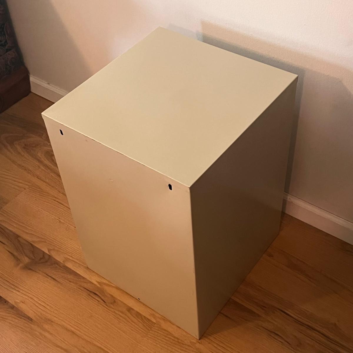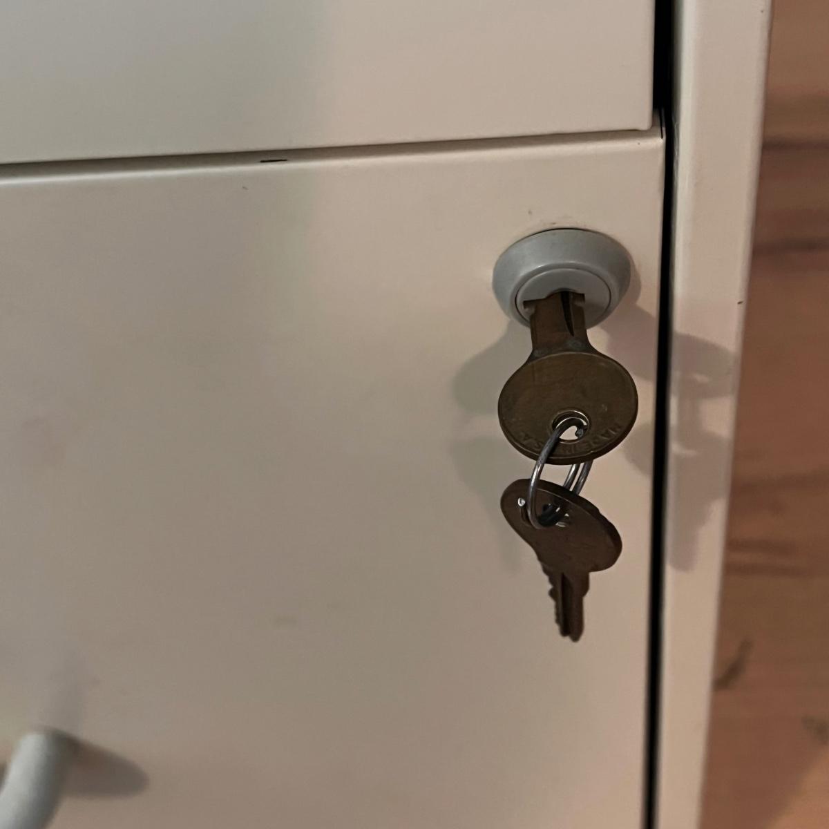 This metal cabinet measures 17.25” x 18” x 24.75”H. It has two drawers with sturdy handles and a functioning lock and key for the bottom drawer - see pictures included. Local pickup only.
