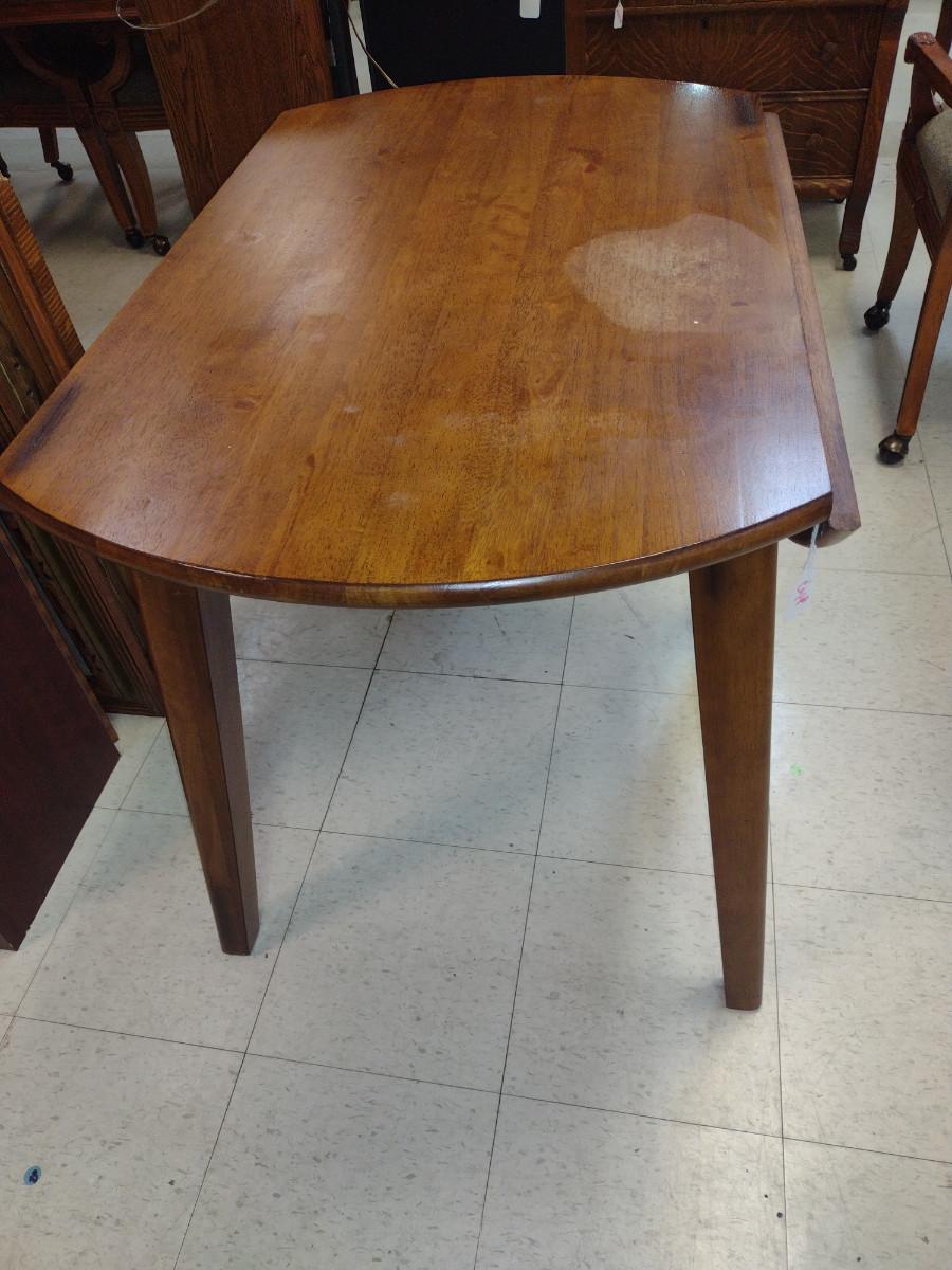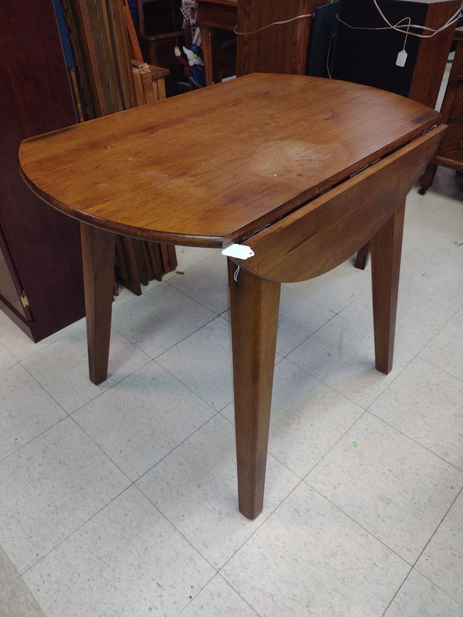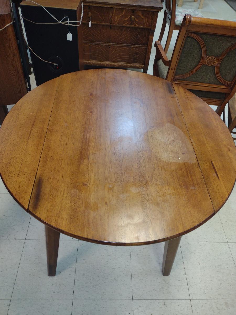 Double Drop Leaf Table. Both leaves up= table is round with approx 35 3/4" diameter. Both leaves down= table is approx 23" x 35 3/4". Item has some wear to finish- please see all pictures for condition.