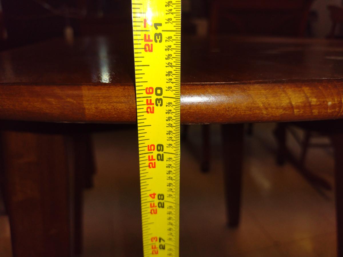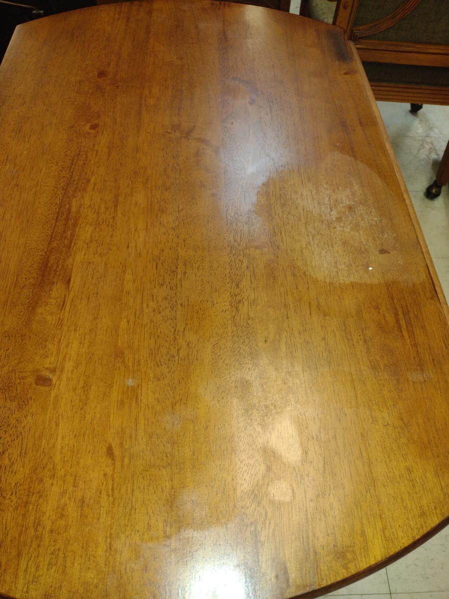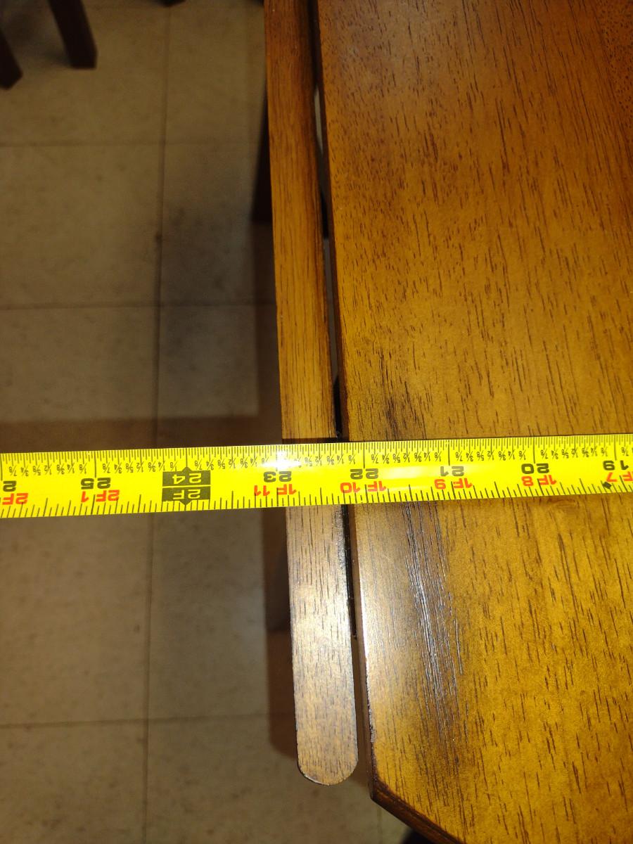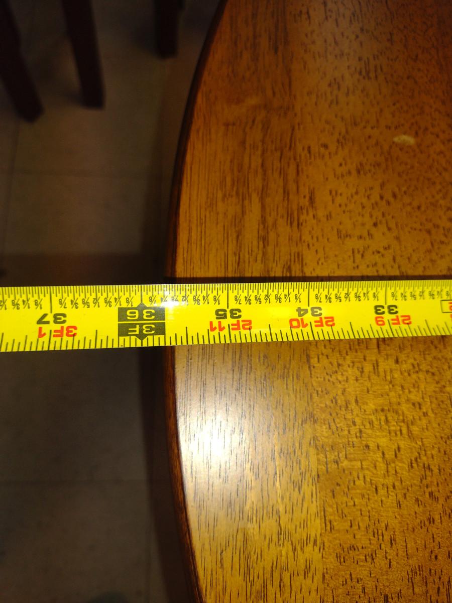 Double Drop Leaf Table. Both leaves up= table is round with approx 35 3/4" diameter. Both leaves down= table is approx 23" x 35 3/4". Item has some wear to finish- please see all pictures for condition.