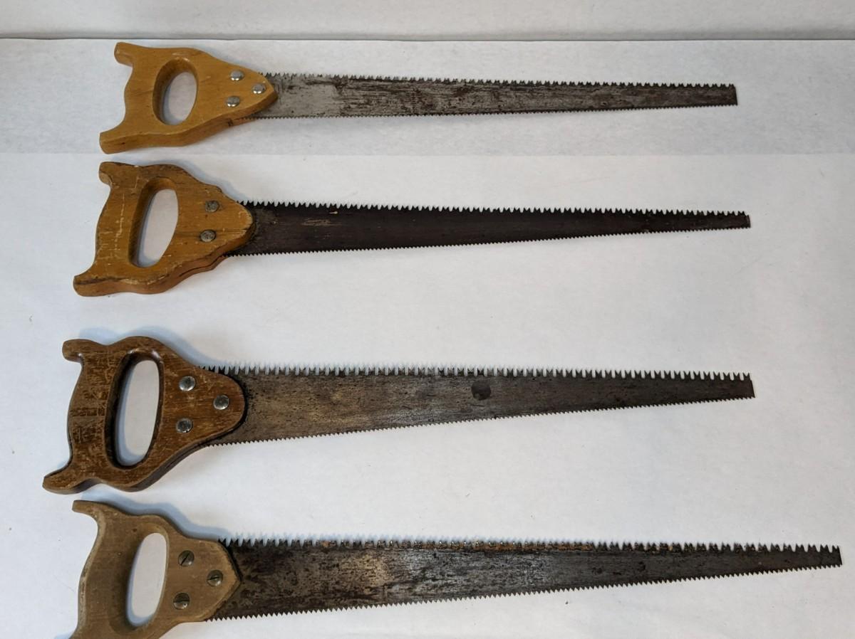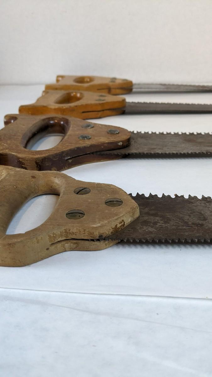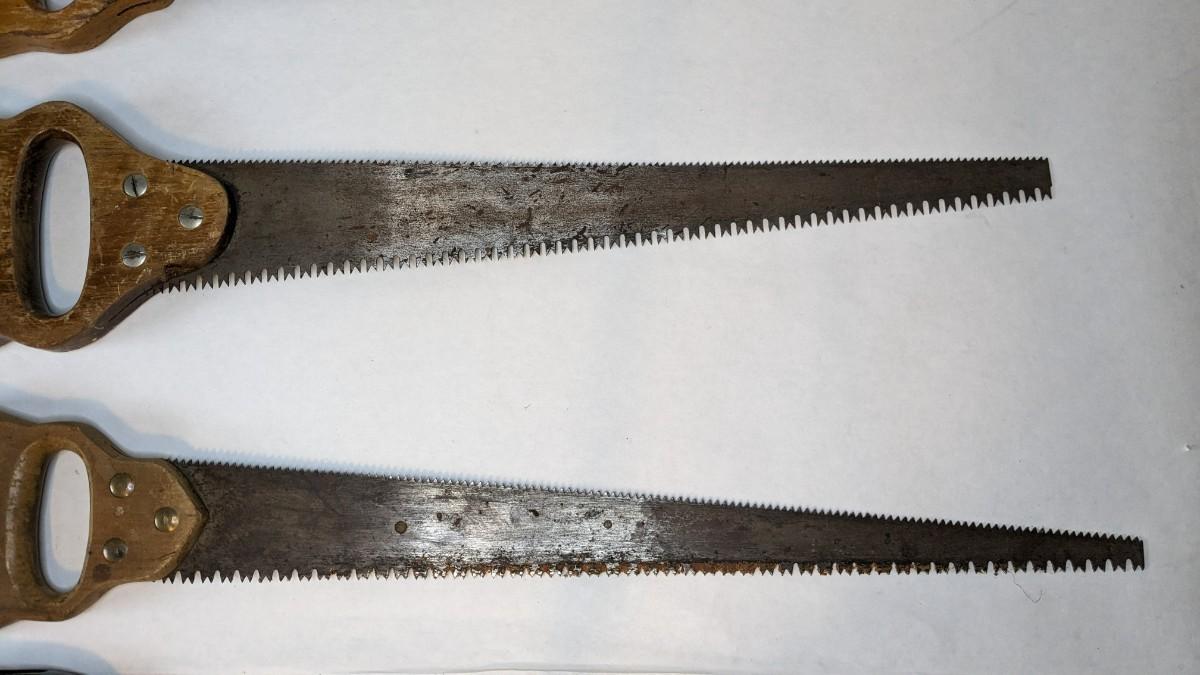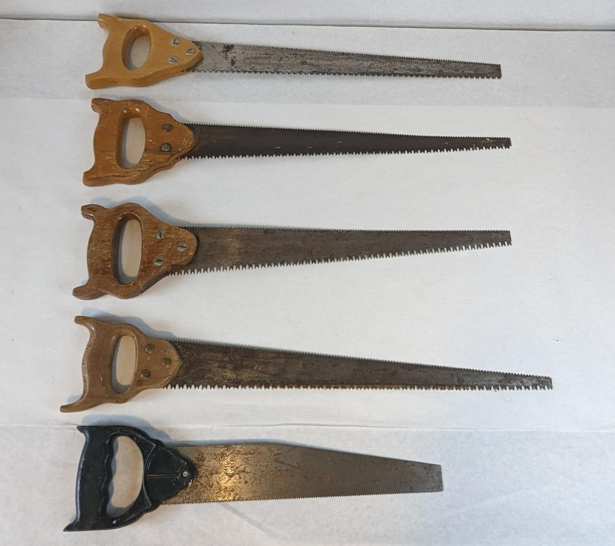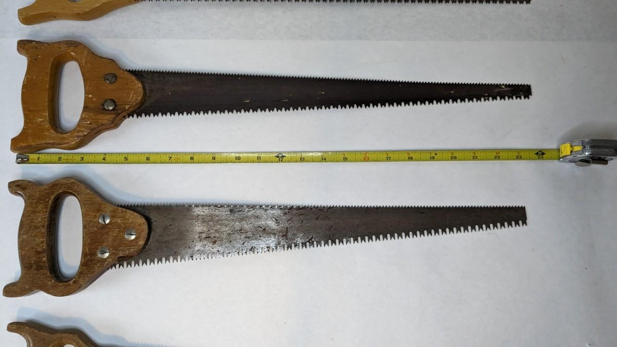 (5) approx. 24" double edged hand saws with 1 plastic handle saw. Each blade and handle show wear, but are neat pieces and still sharp!