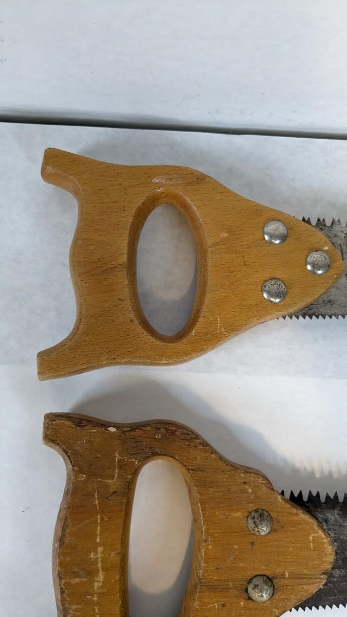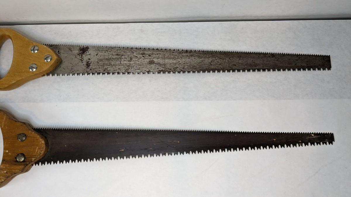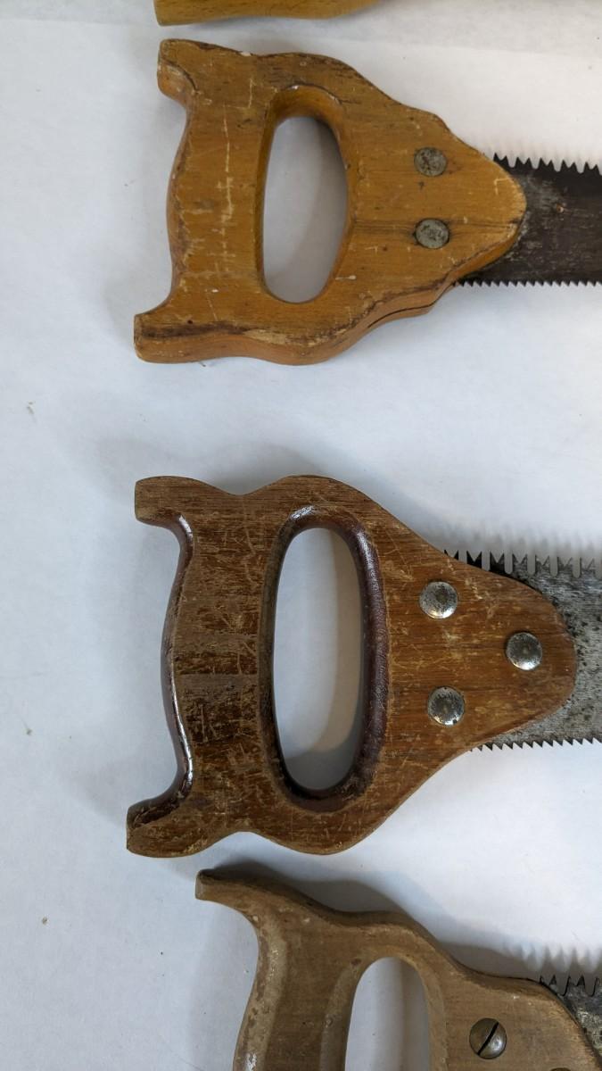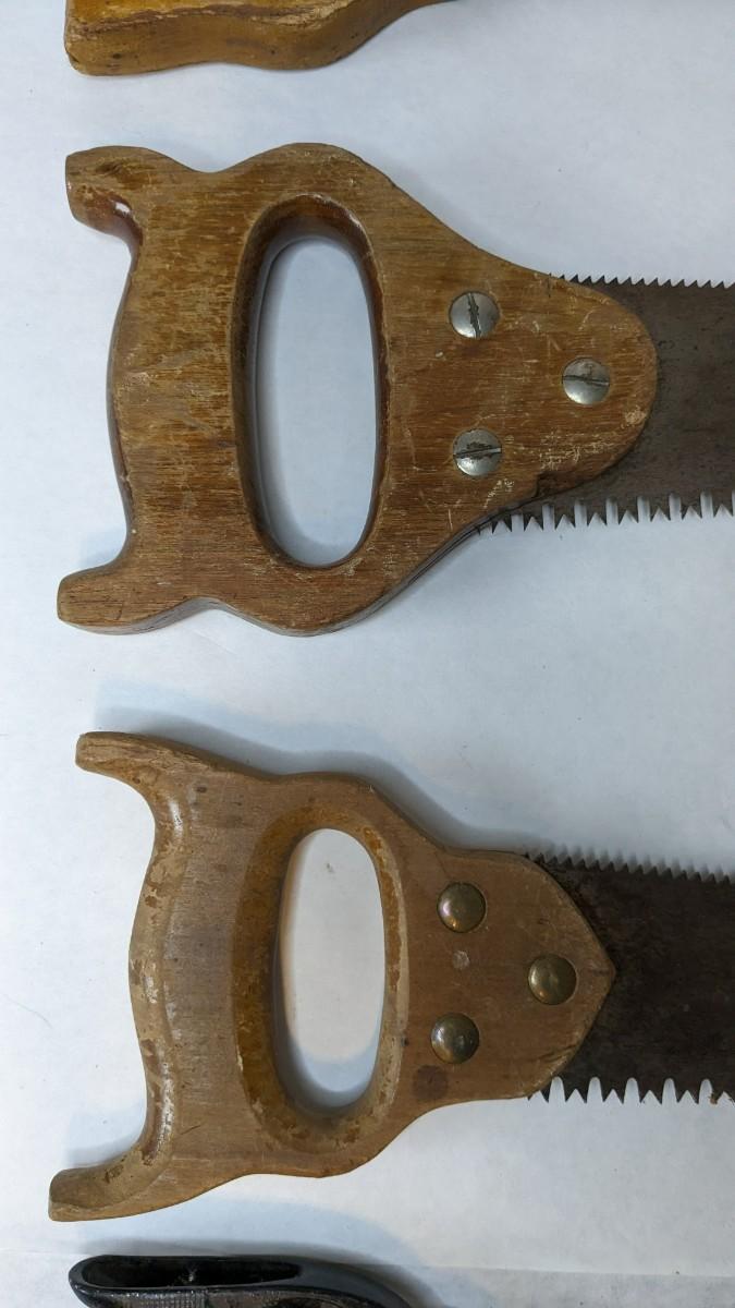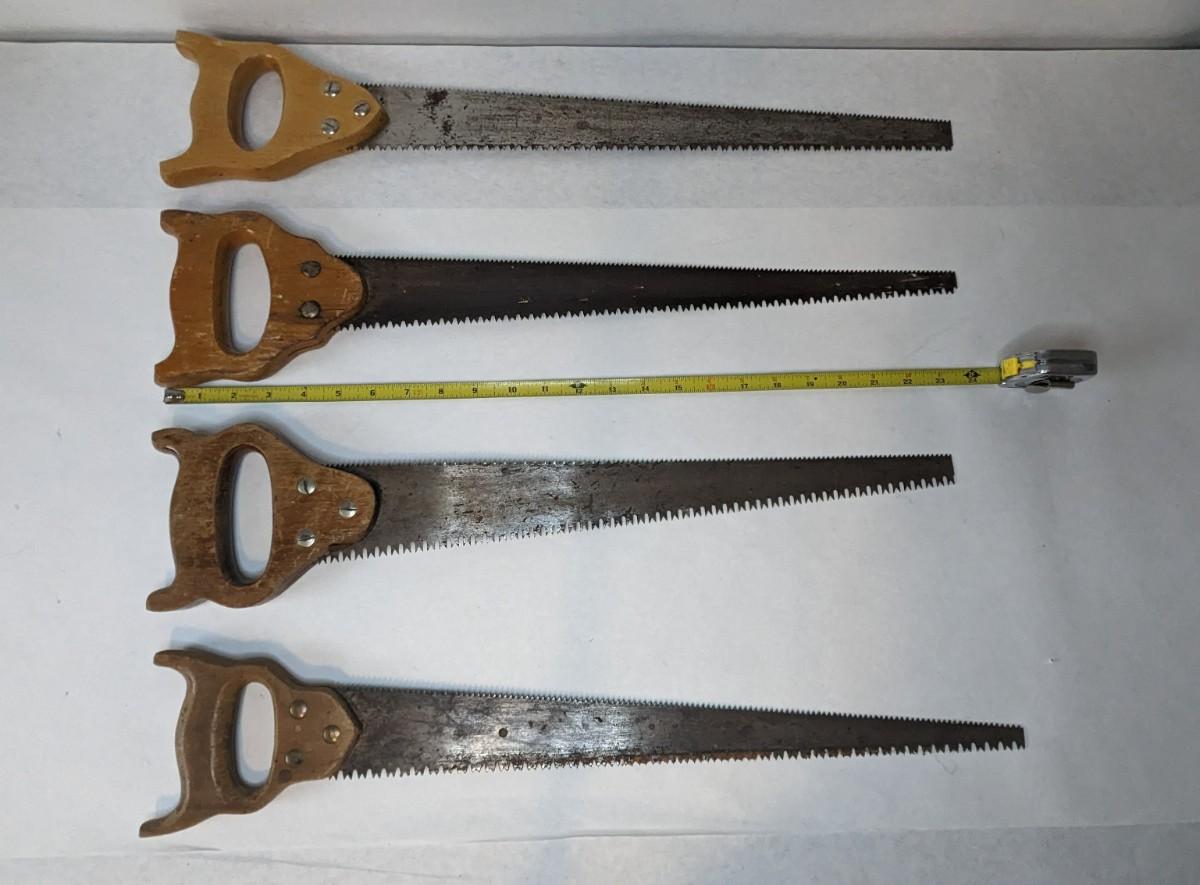 (5) approx. 24" double edged hand saws with 1 plastic handle saw. Each blade and handle show wear, but are neat pieces and still sharp!