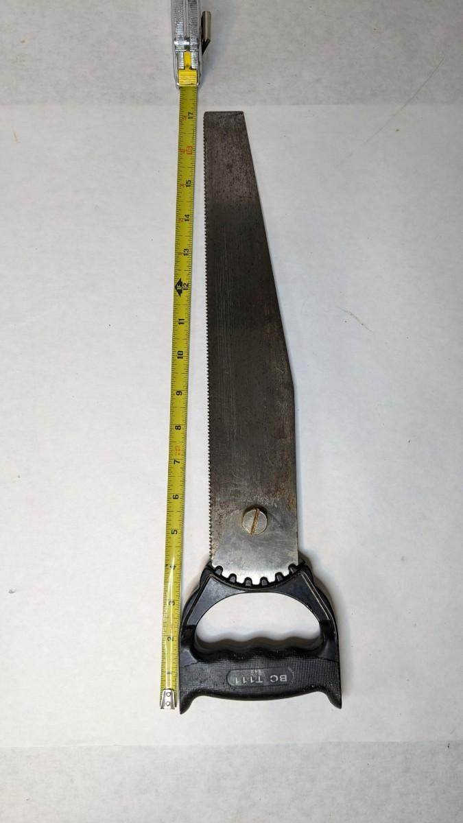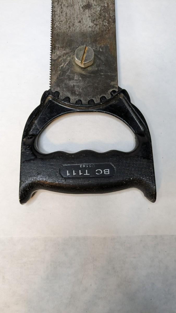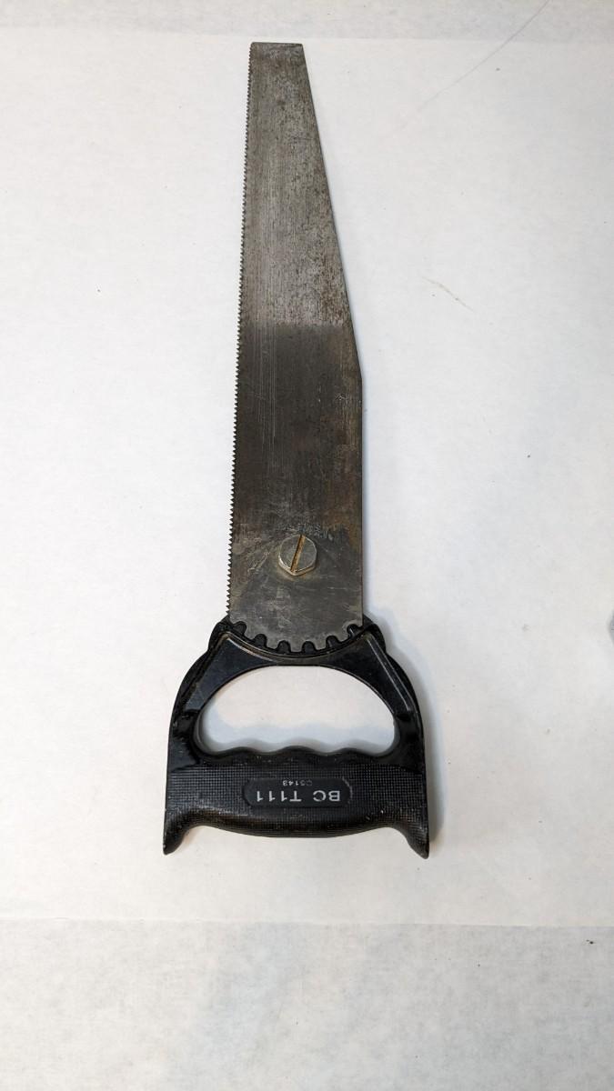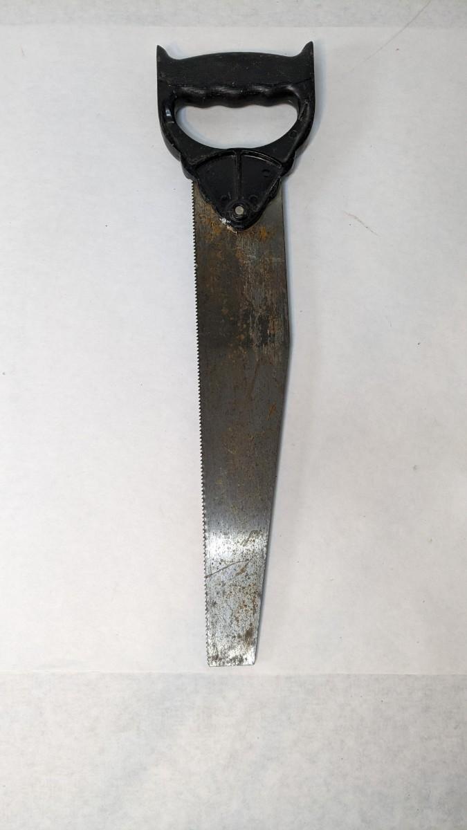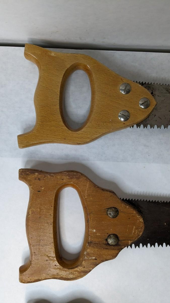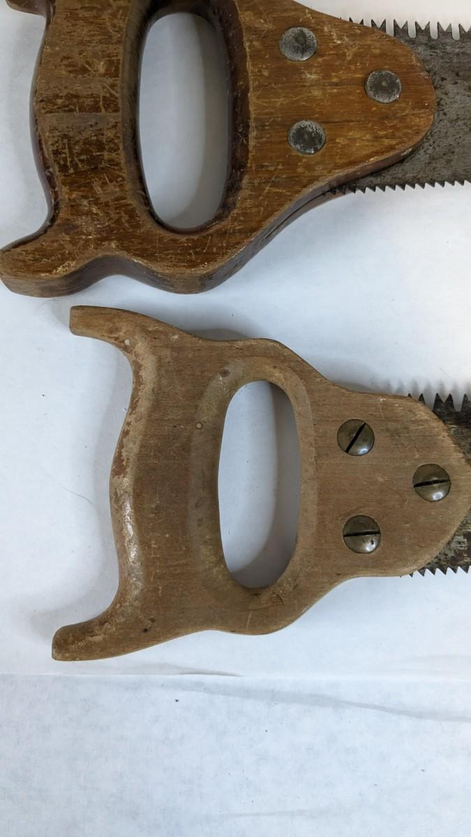 (5) approx. 24" double edged hand saws with 1 plastic handle saw. Each blade and handle show wear, but are neat pieces and still sharp!