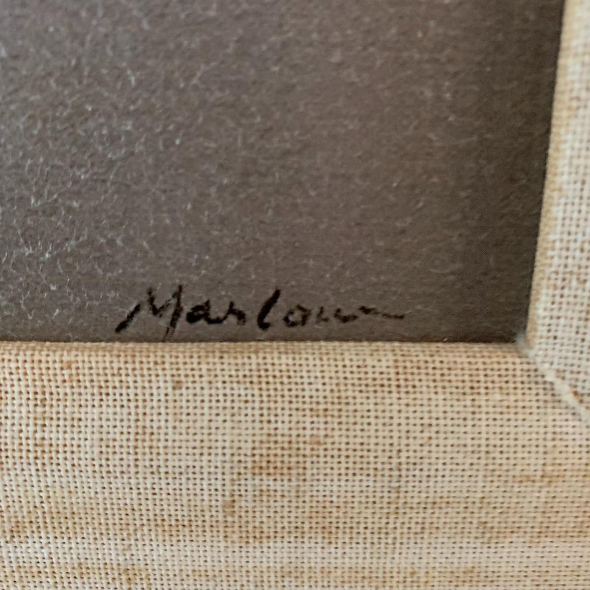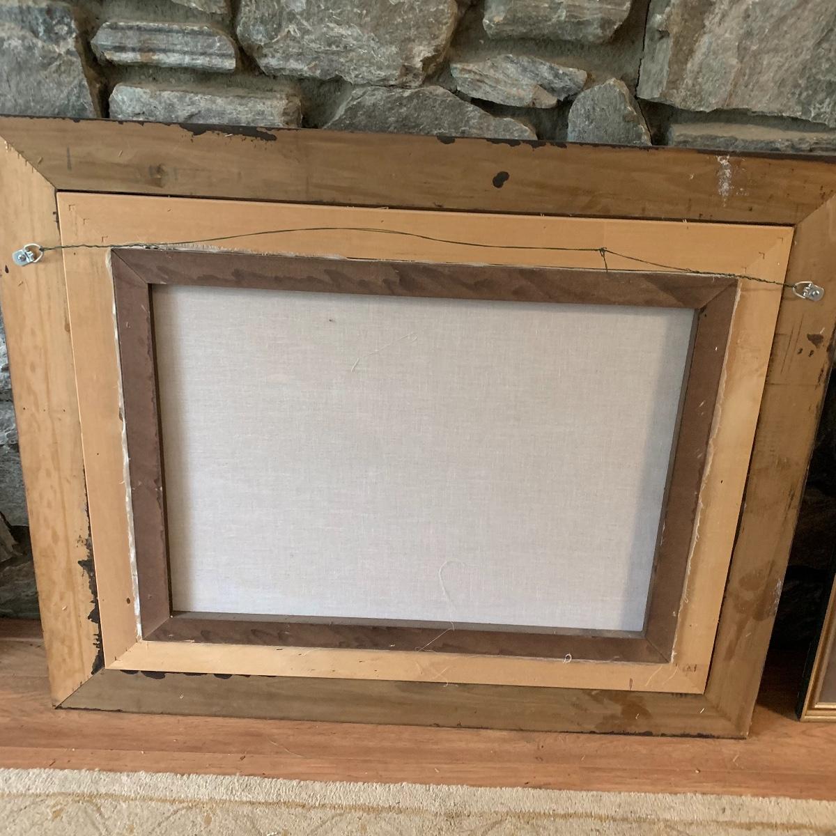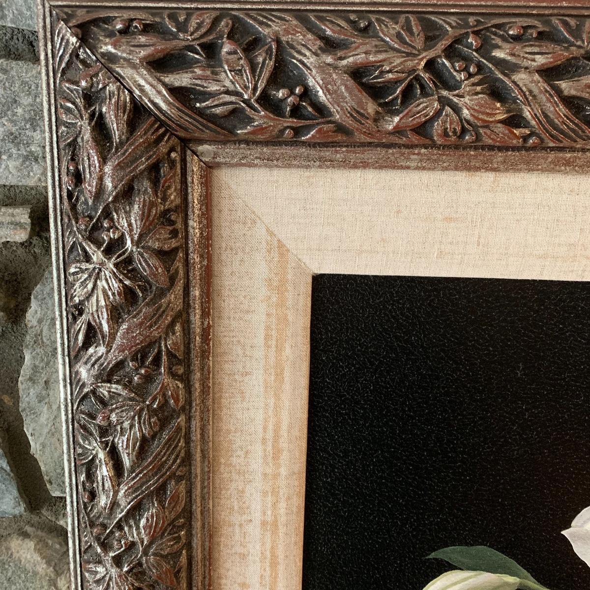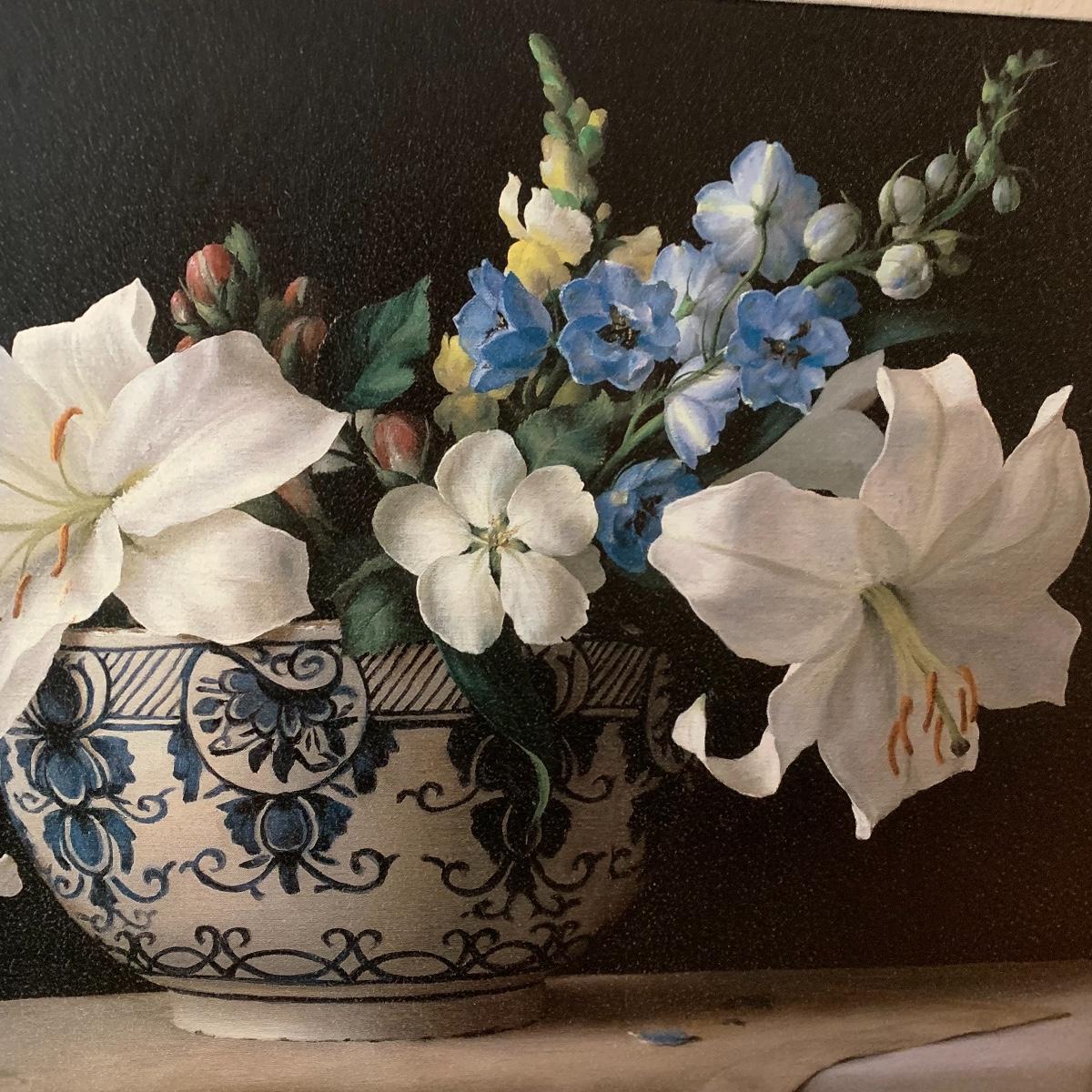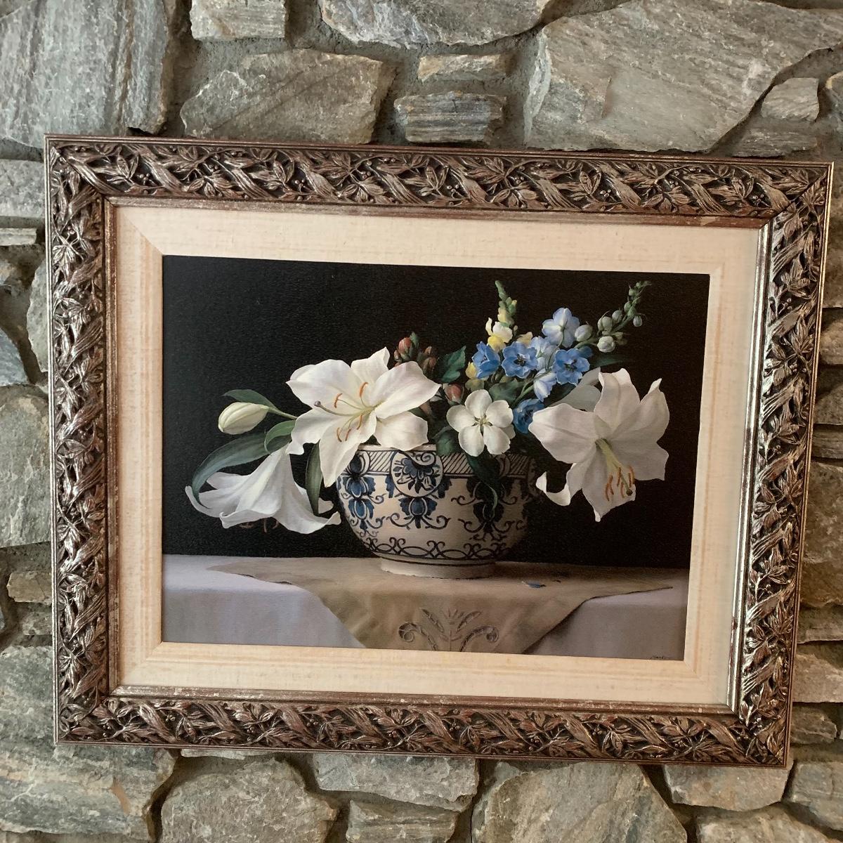This beautifully double framed art print of Ken Marlow’s “˜Lilies in Delf’ measures 39” x31.5”. Outer frame is a distressed silver on wood and the interior is a canvas wrapped frame. Looks like the actual painting. Shipping available. Please note shipping art can be costly. You can call UPS for an estimate with dimensions.