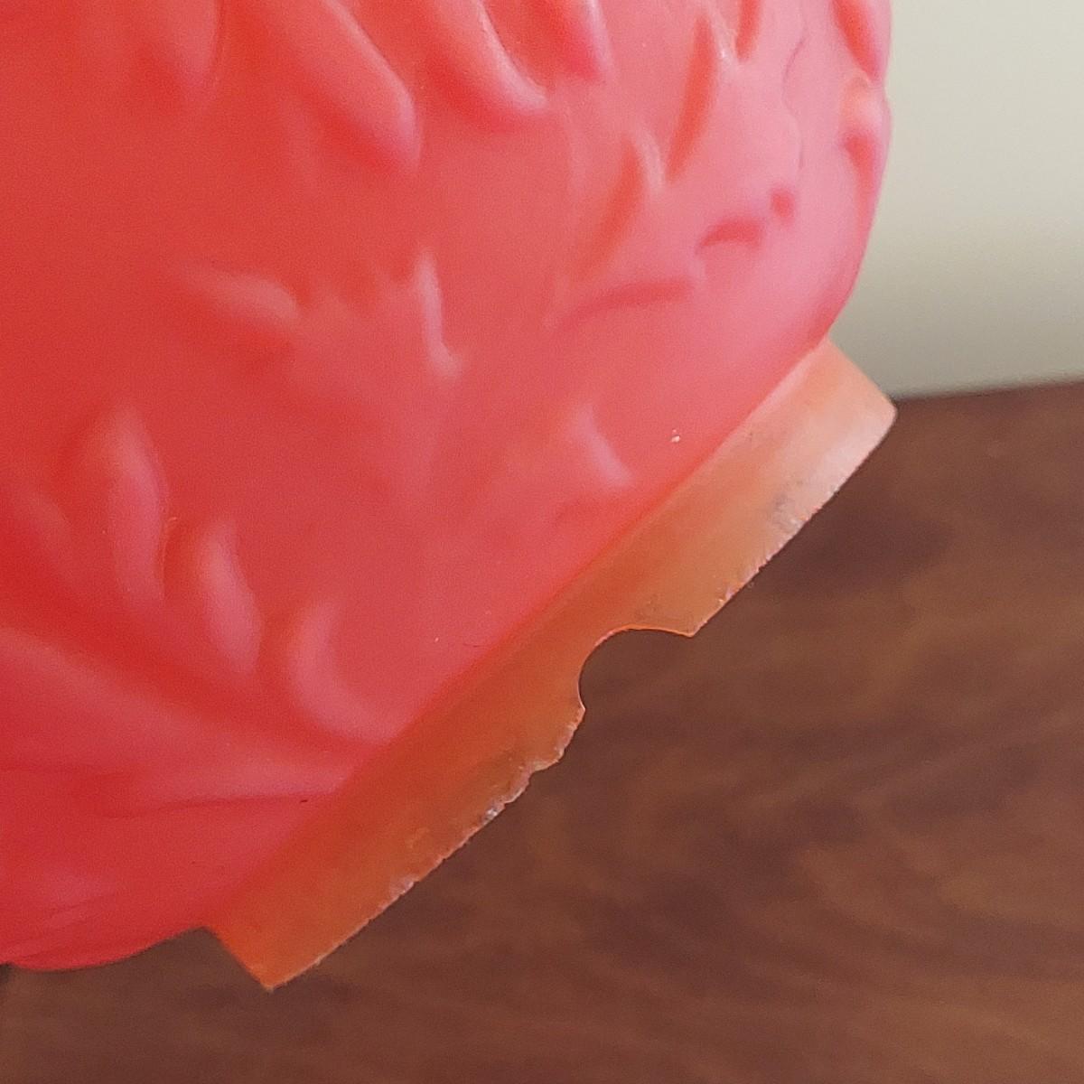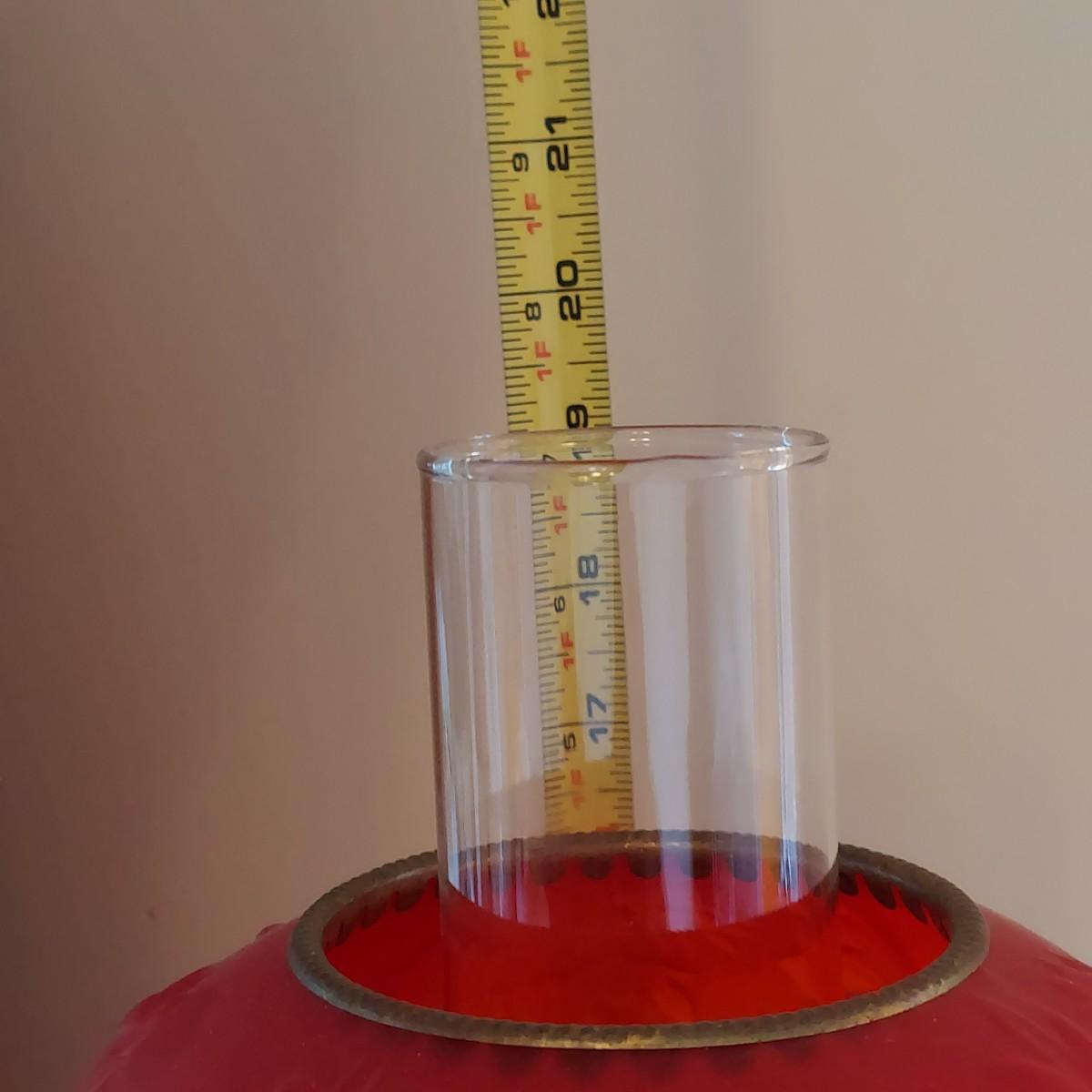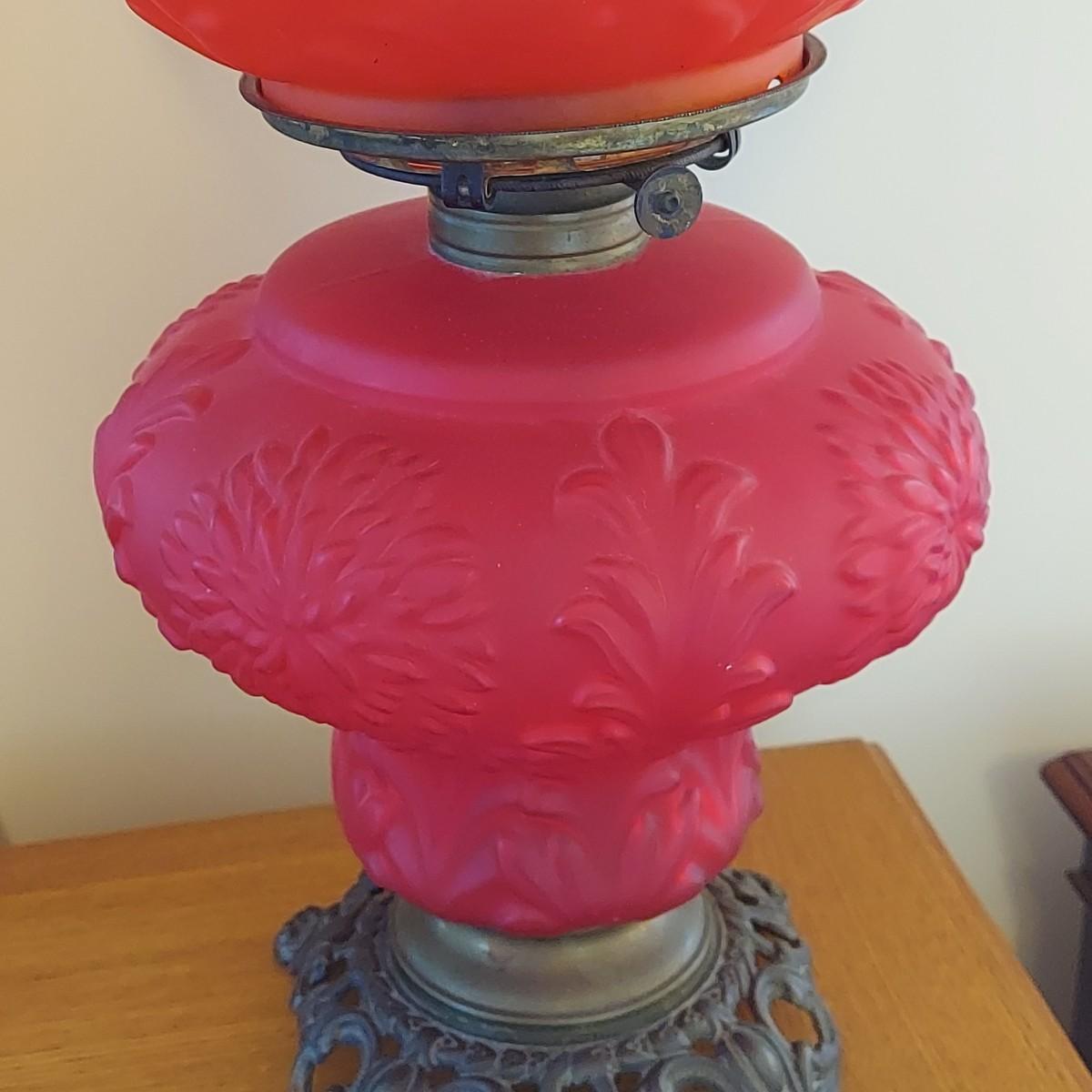 Oil lamp with brass base has Double red glass globes. One small chip around the rim of the top globe. Measures approximately 19"H. Please see photos for details. Shipping available