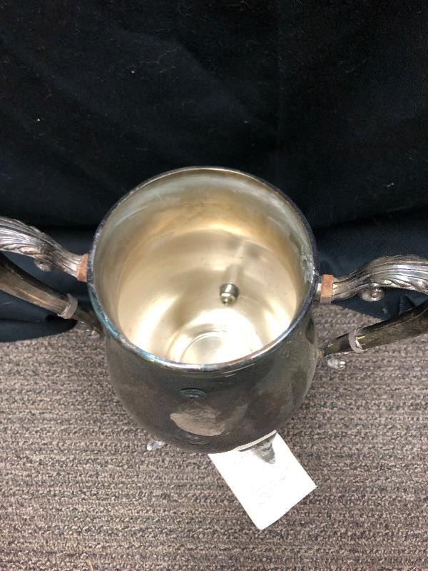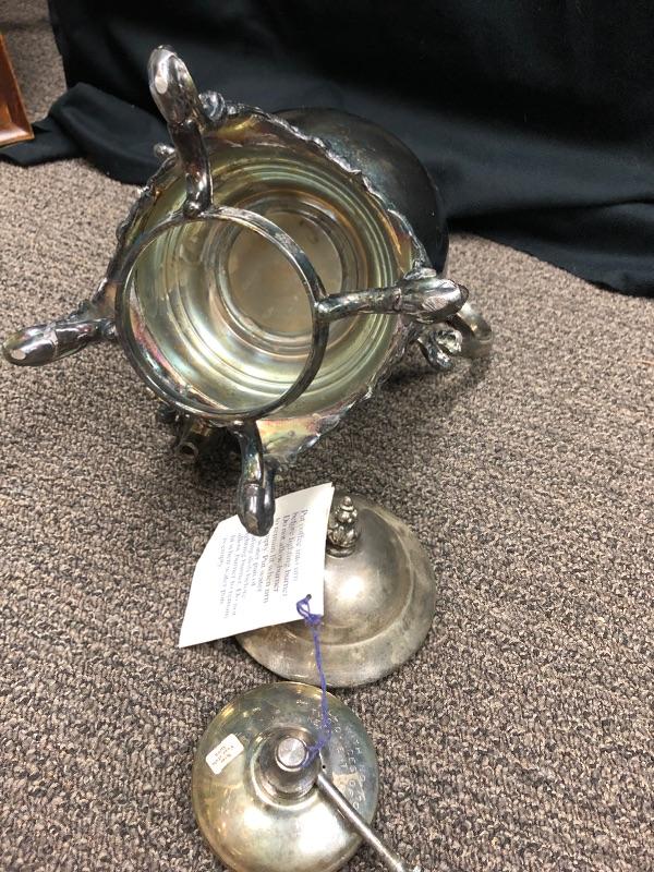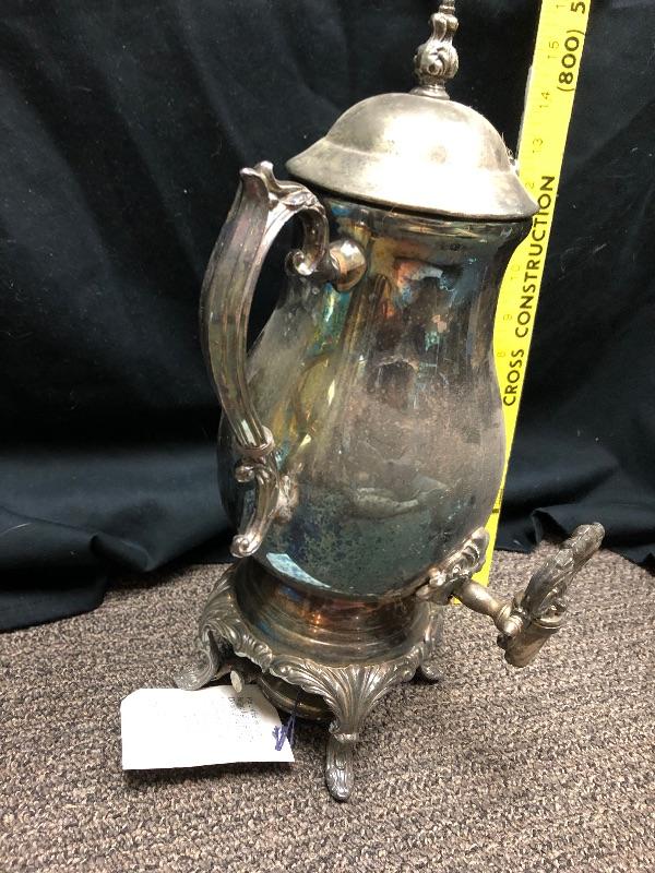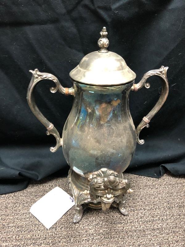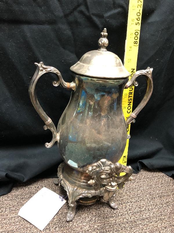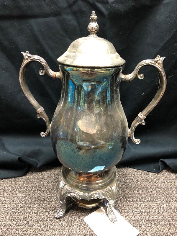 Double handle coffee urn. Silverplate, needs to be polished. Good Condition. Has burner underneath to keep coffee warm. Very clean inside.