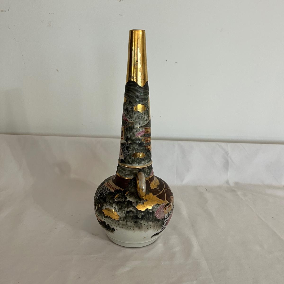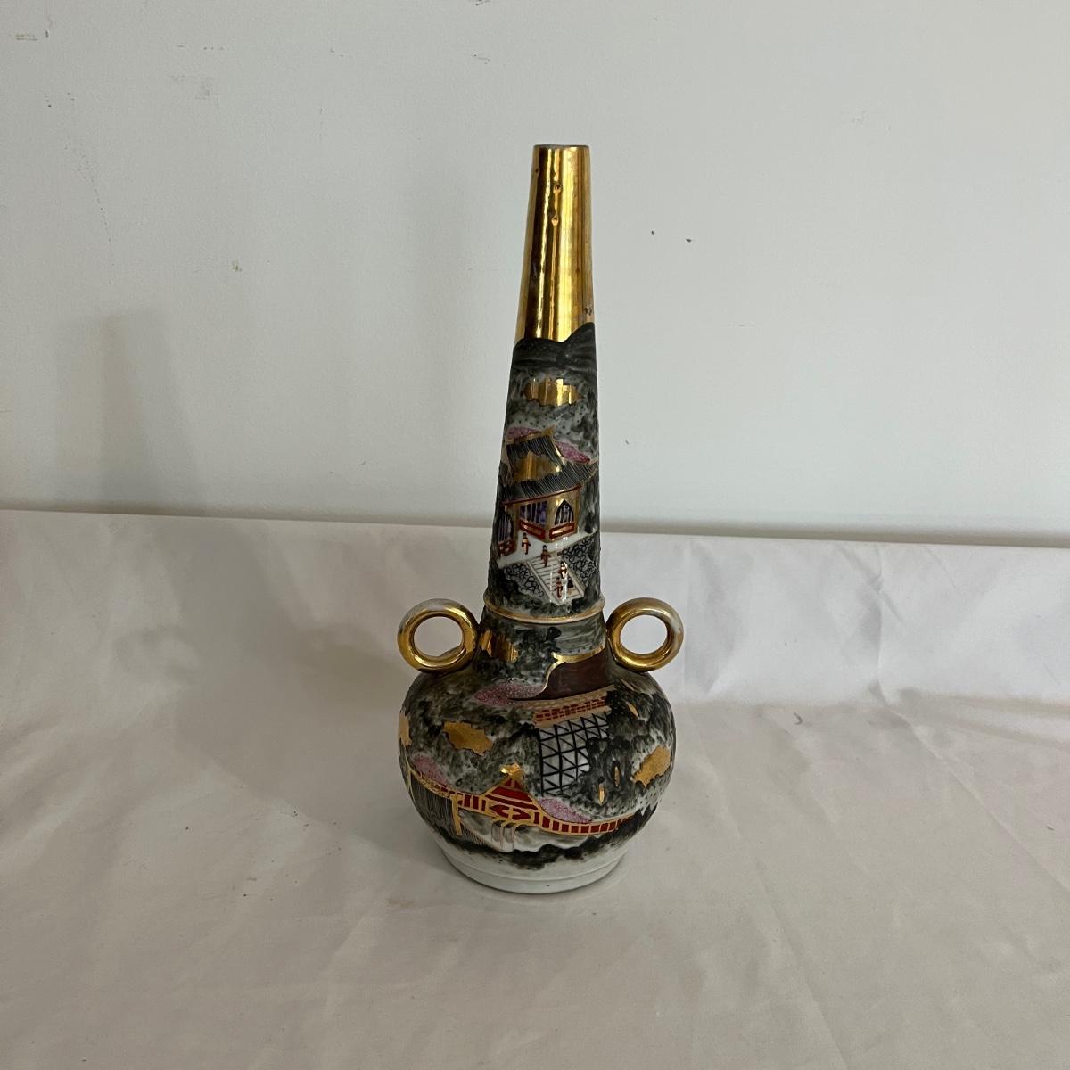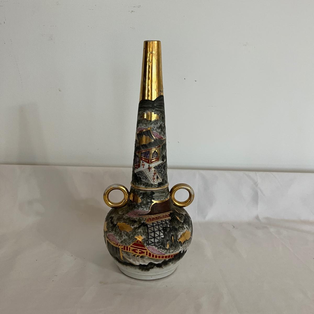Lot includes a ceramic double handled vase that appears to be in a Satsuma style. It measures 5”D x 12.25”H. Please see photos for details.