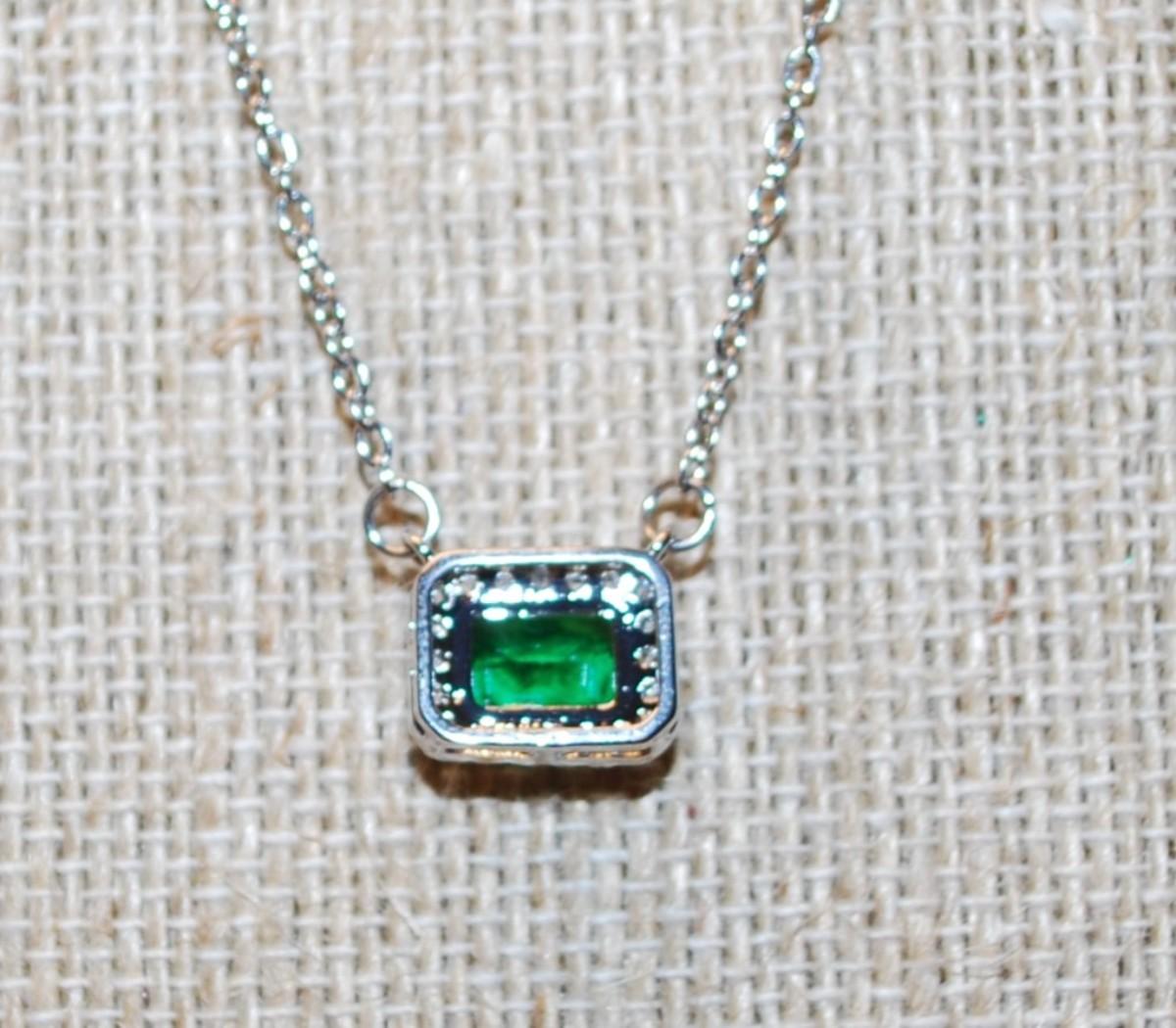 Double Hooked Green Rectangle Stone PENDANT (½" x ¼") with Full Clear Stone Surround on a Silver Tone Necklace Chain 17" L