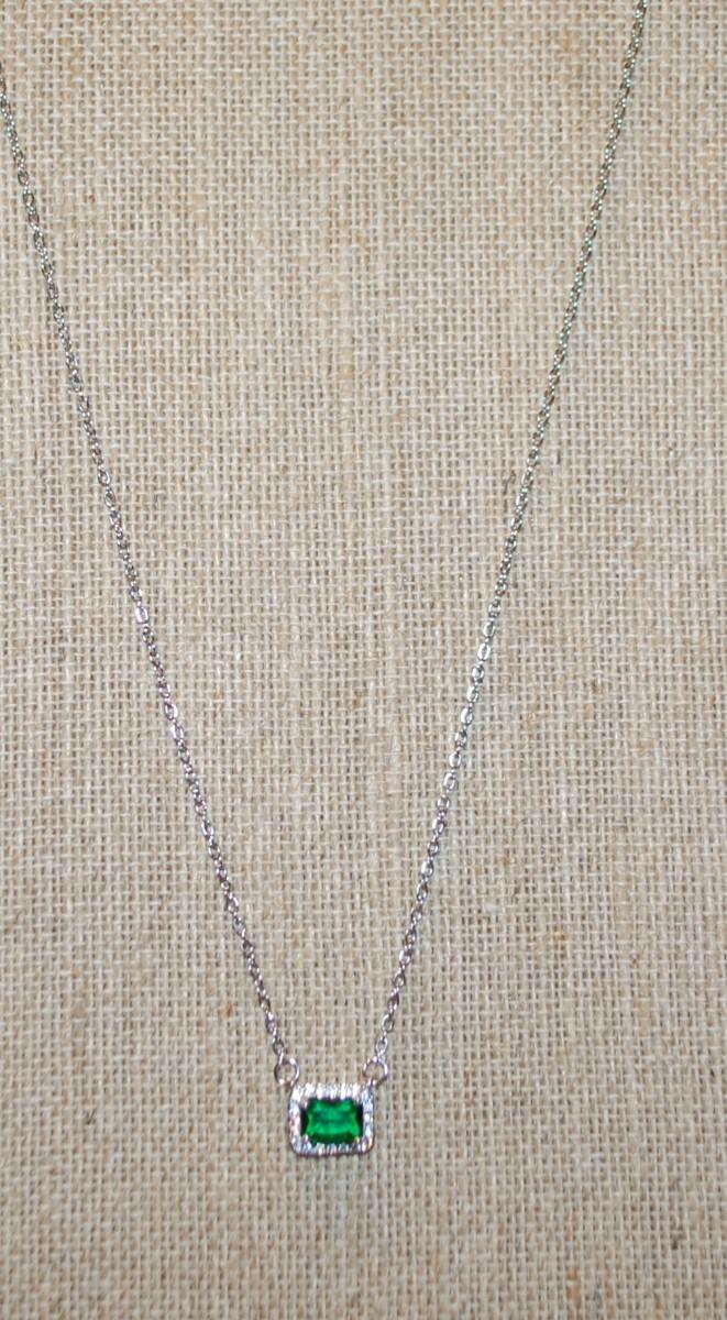 Double Hooked Green Rectangle Stone PENDANT (½" x ¼") with Full Clear Stone Surround on a Silver Tone Necklace Chain 17" L