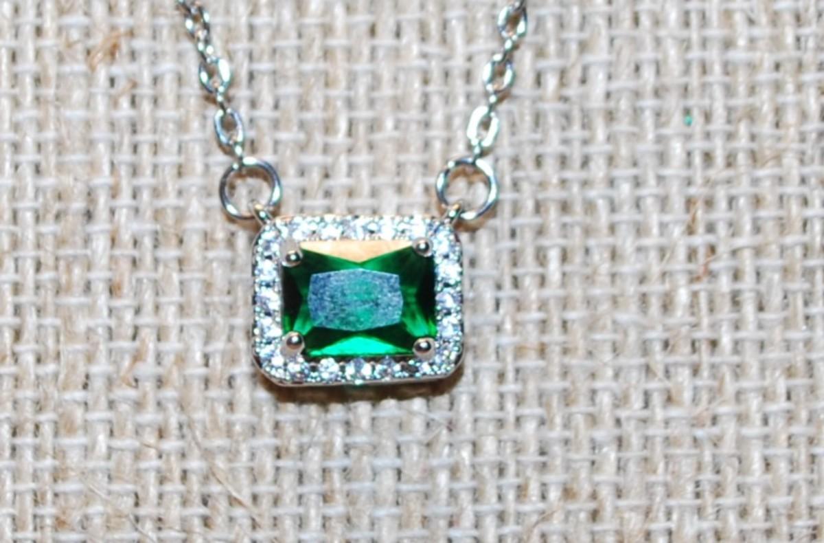 Double Hooked Green Rectangle Stone PENDANT (½" x ¼") with Full Clear Stone Surround on a Silver Tone Necklace Chain 17" L