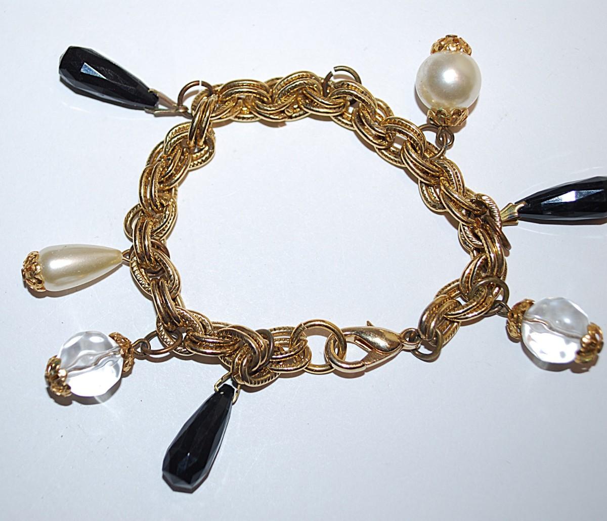 Double Looped CHAIN LINKS BRACELET (2¼" Opening) with Black Prism Beads and Clear/Pearl Style Accent Beads + Lobster Clasp