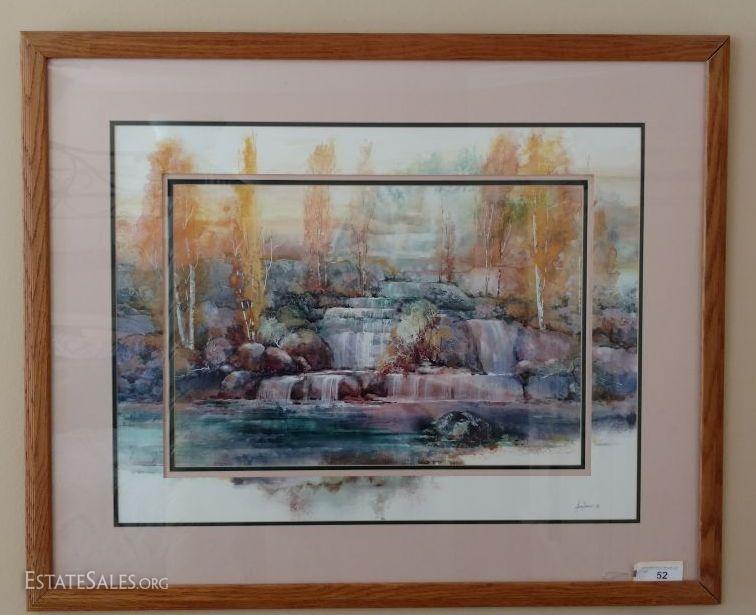 Double Matted Oak Framed Water Color with glass cover. Scene of a stream flowing over rocks. Signed Adin Shade