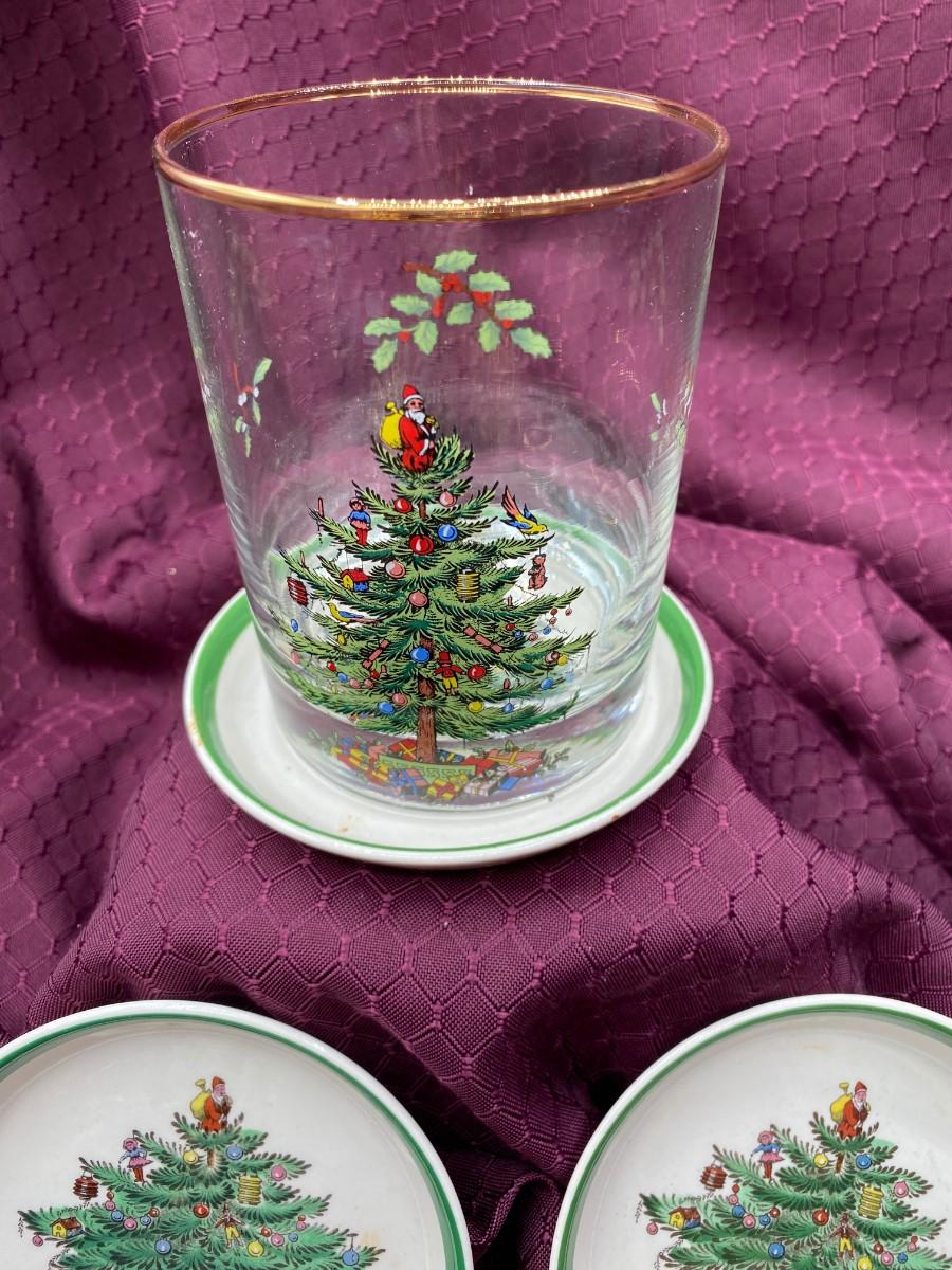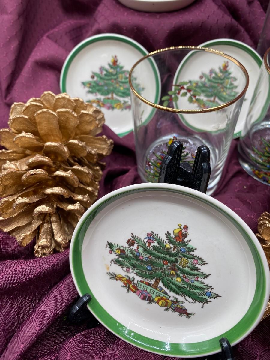 Glasses have gold rims and Christmas Tree design, coasters as pictured.