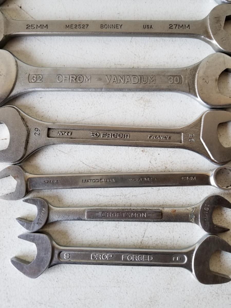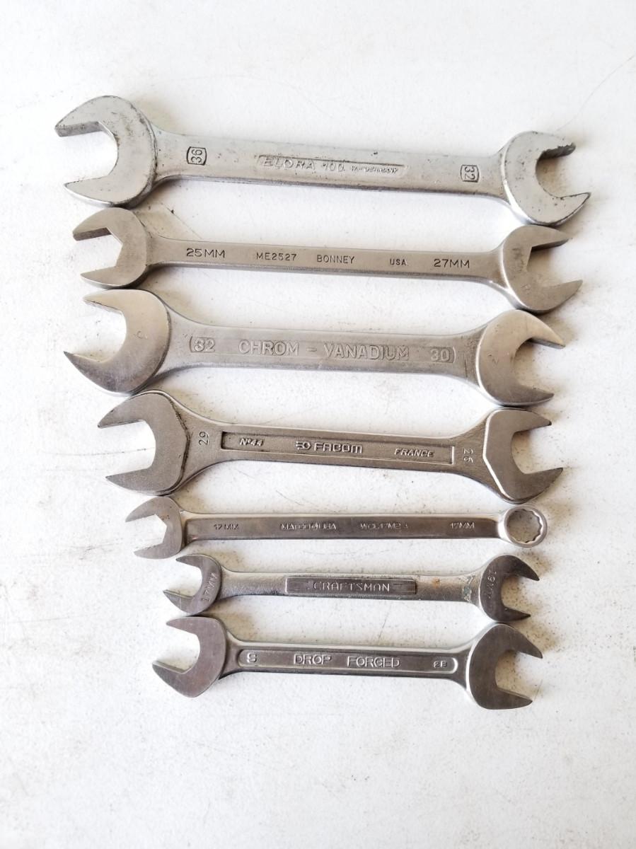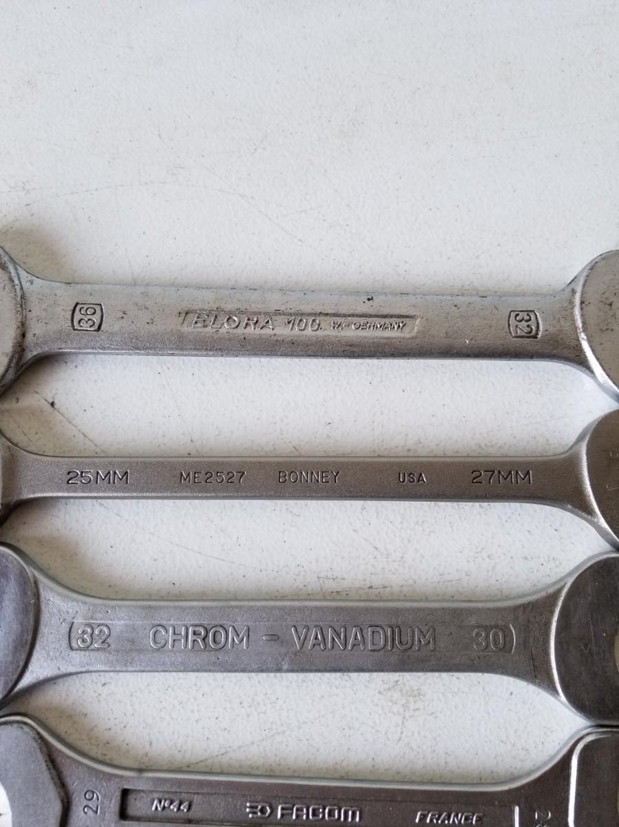 Wrenches are from various manufacturers. The combo wrench is in 12mm. The double end box wrenches are in sizes 36mm/32mm, 27mm/25mm, 32mm/30mm, 29mm/26mm, 17mm/19mm, and the other is in 28mm.