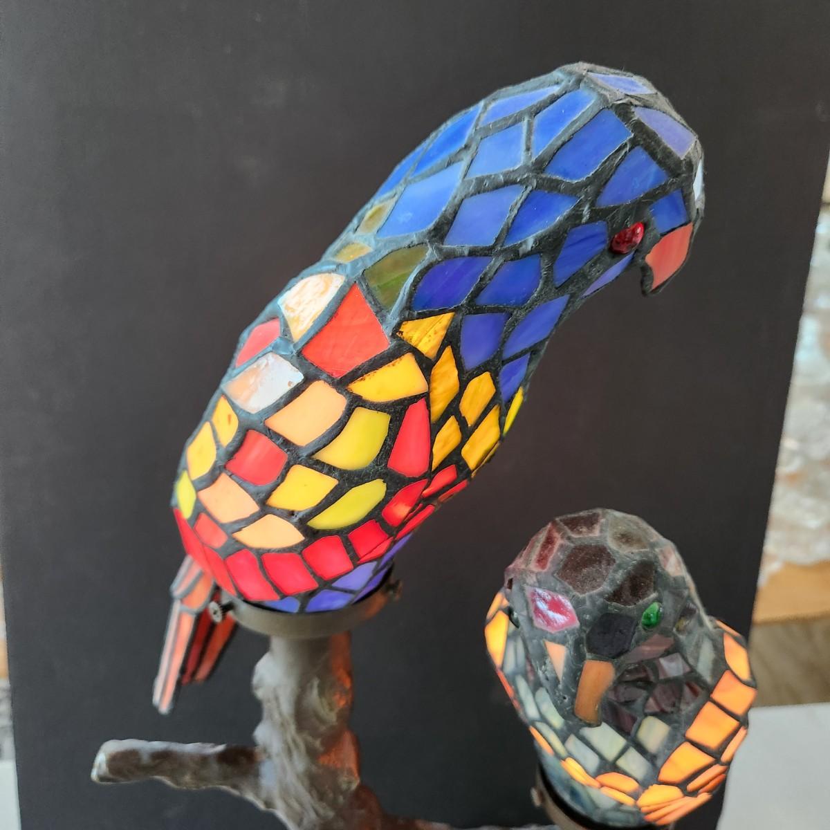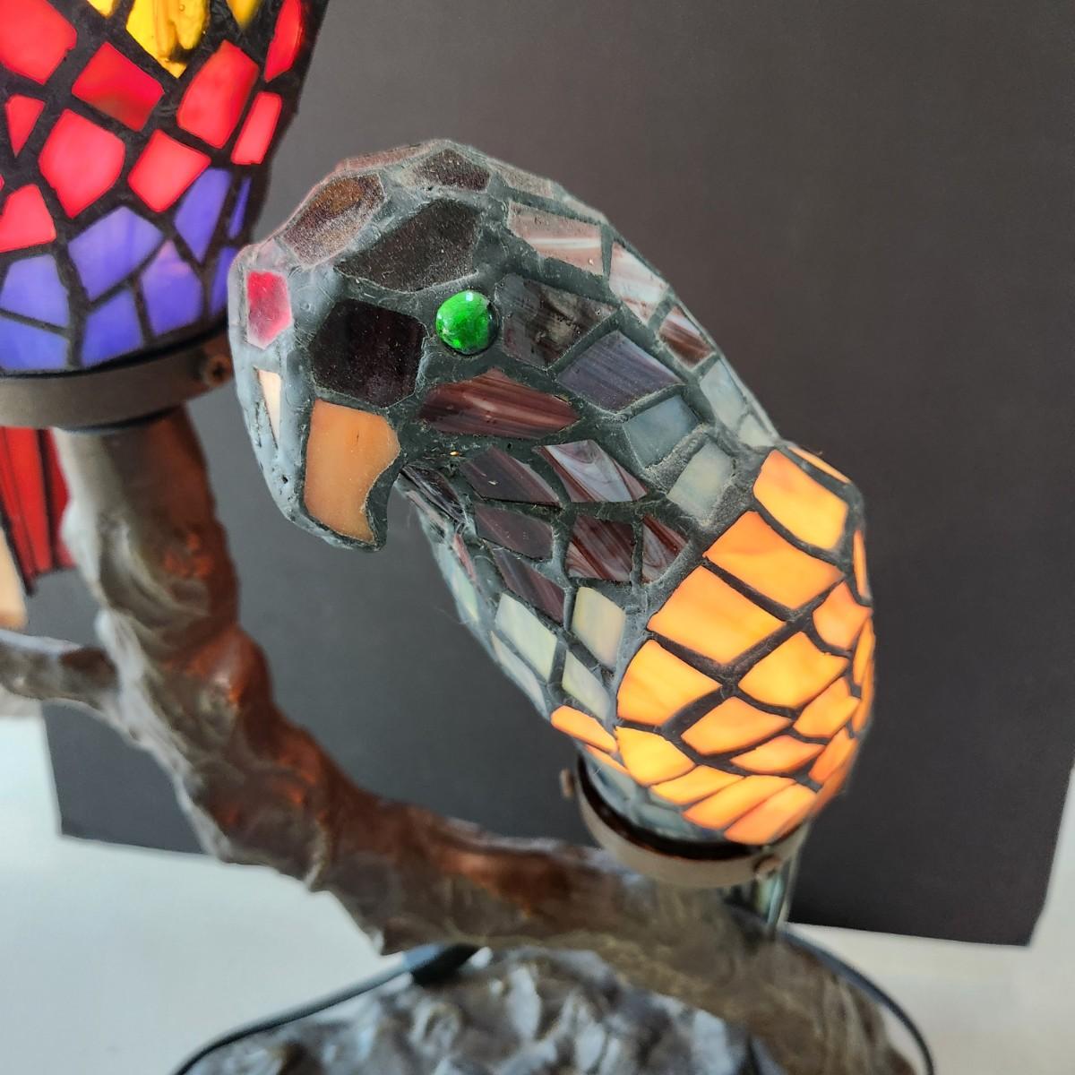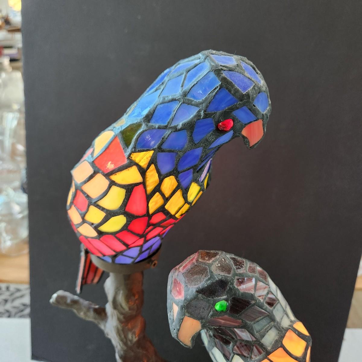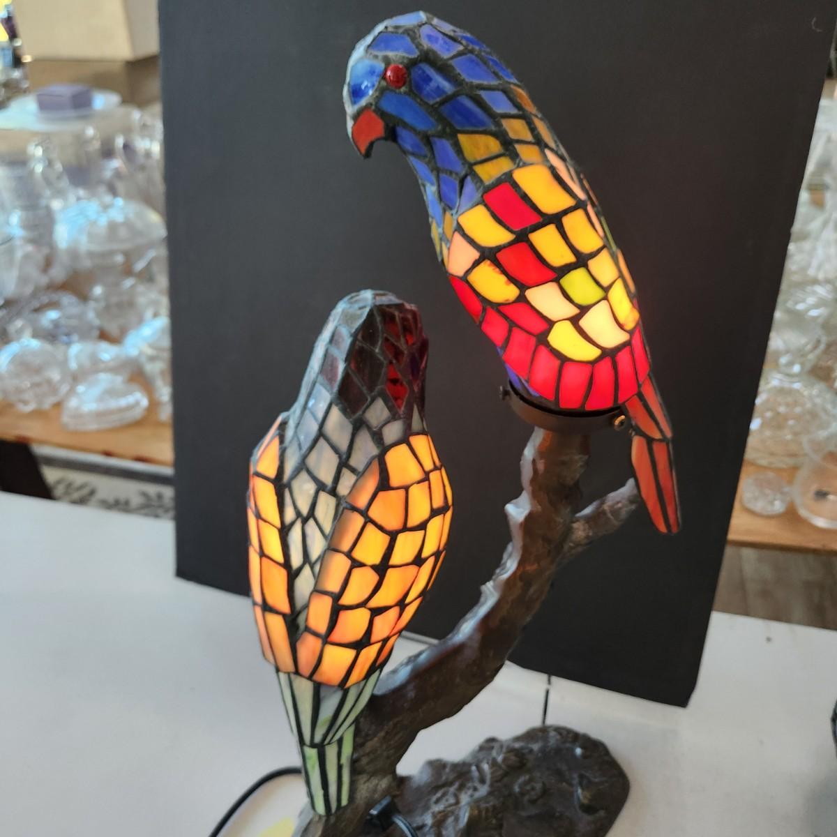 Double Parrot Stained Glass Table Lamp on Metal Branch