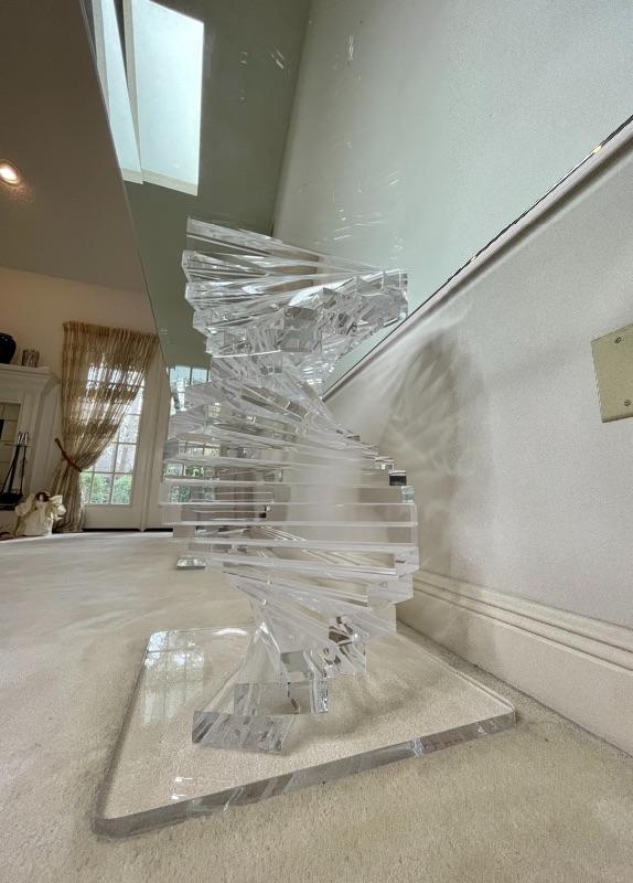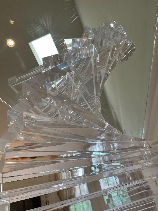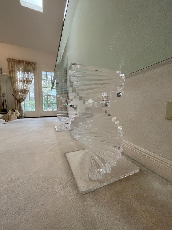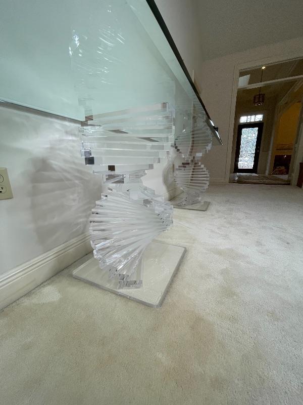 Sleek stacked acrylic base pedestals (2). 3/4” thick beveled glass top.