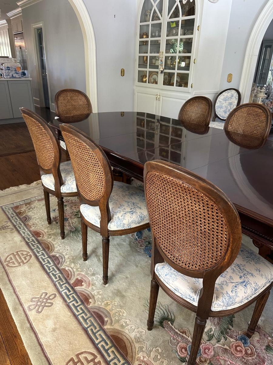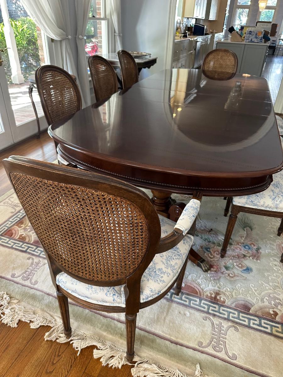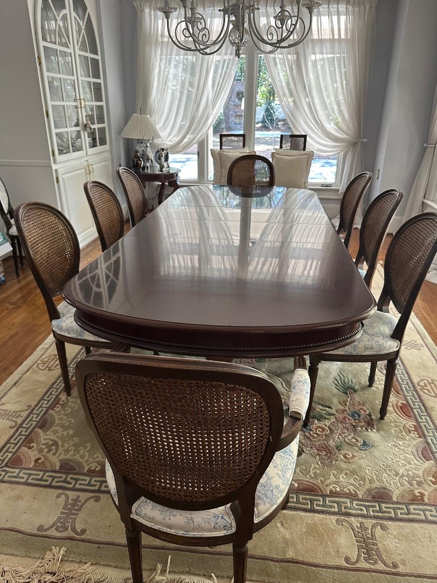 DOUBBLE PEDESTAL DINING TABLE 99X42X29 HAS ONE HEAT MARK(SEE PHOTOS) 8CANE BACK UPHOLSTERED SEAT CHAIRS