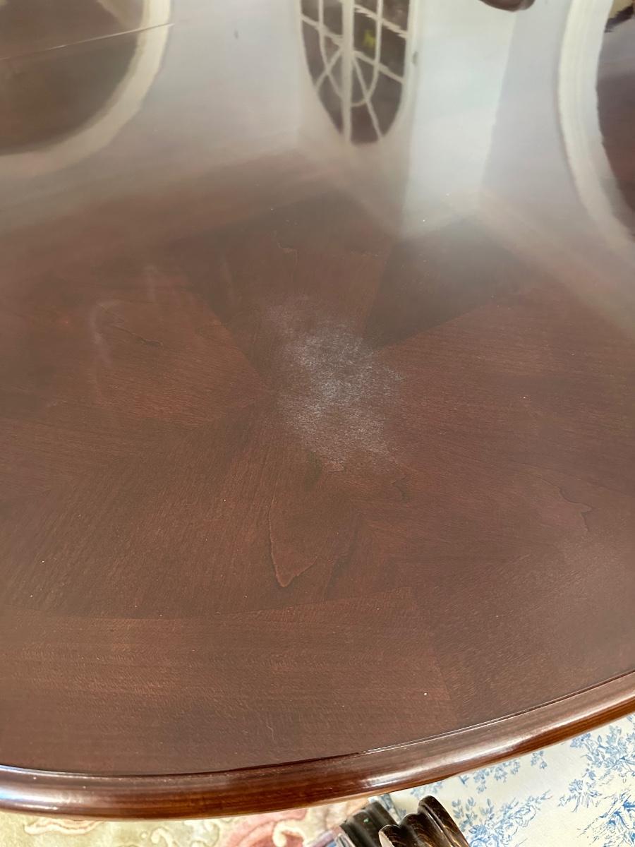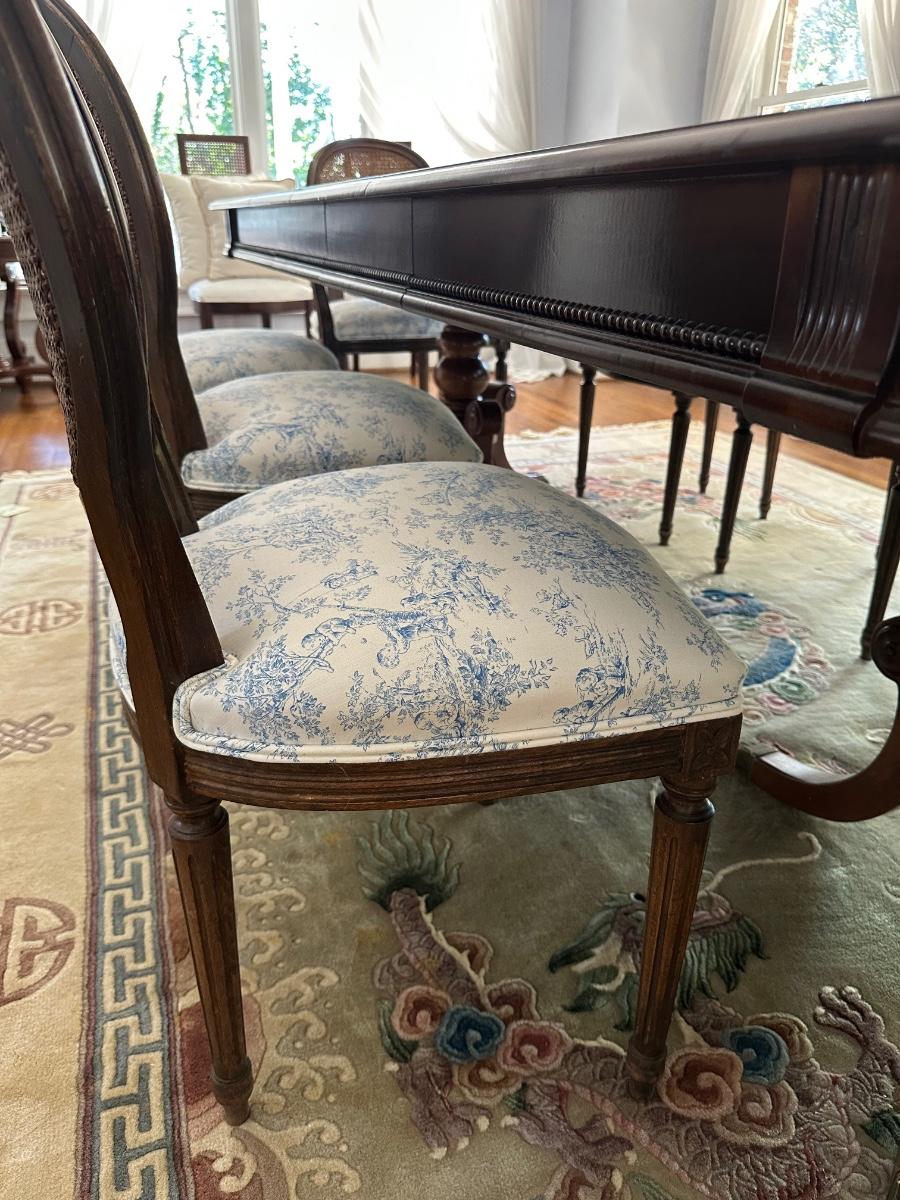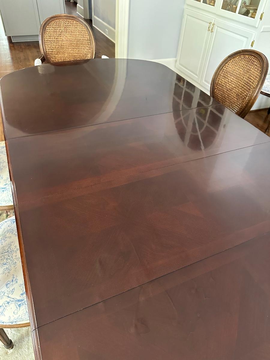 DOUBBLE PEDESTAL DINING TABLE 99X42X29 HAS ONE HEAT MARK(SEE PHOTOS) 8CANE BACK UPHOLSTERED SEAT CHAIRS