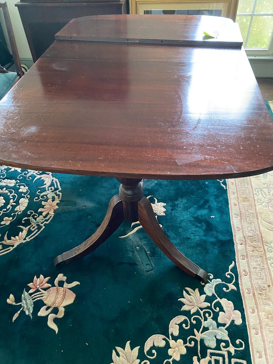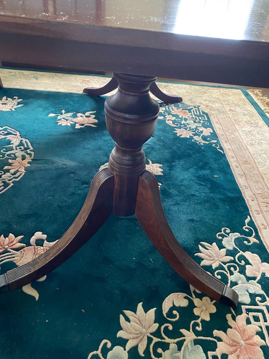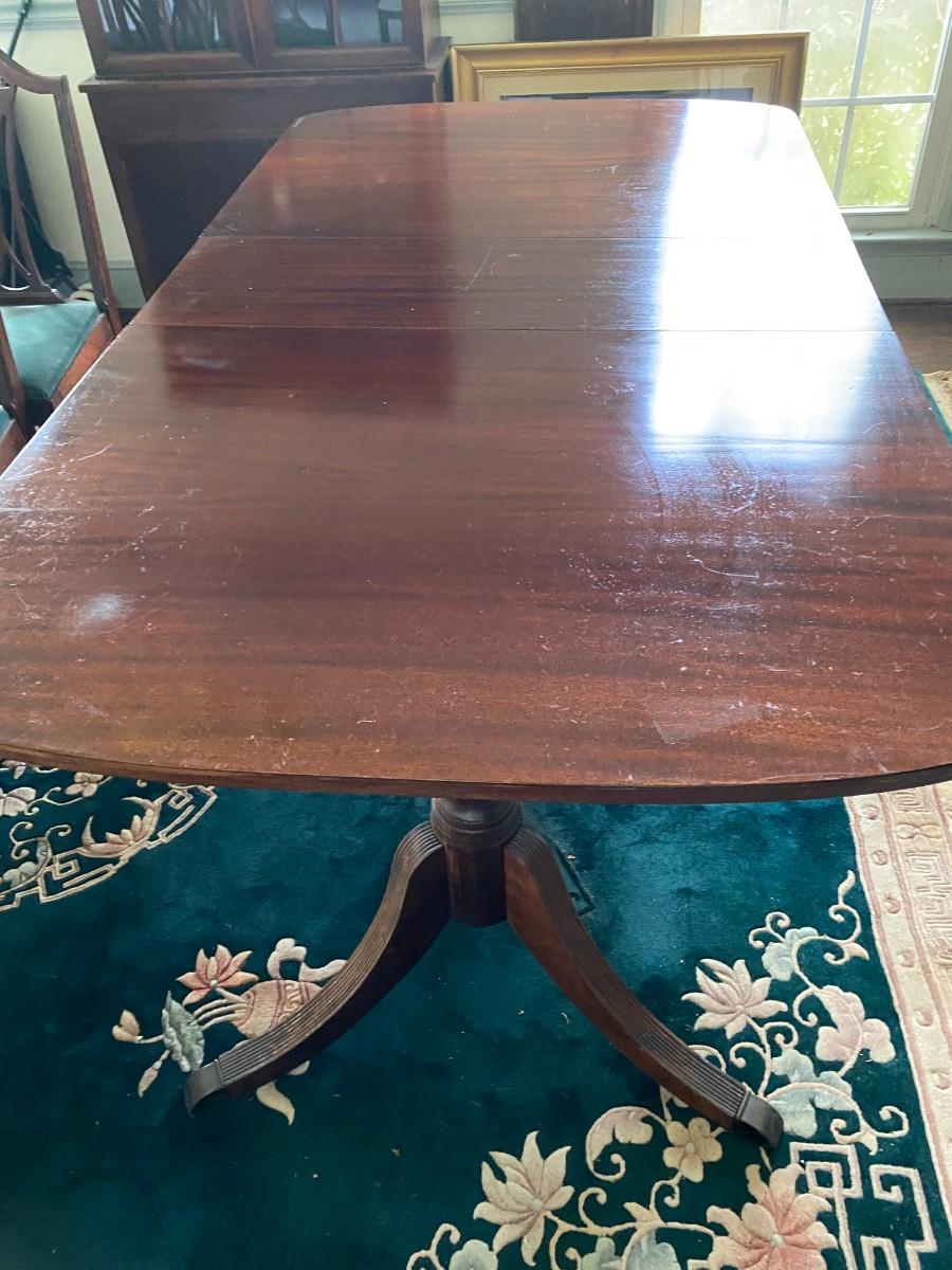 Double Pedestal Mahogany Dining Table, 38x70 w/ 12 in. Leaf Inserted, Some Scratches on Top