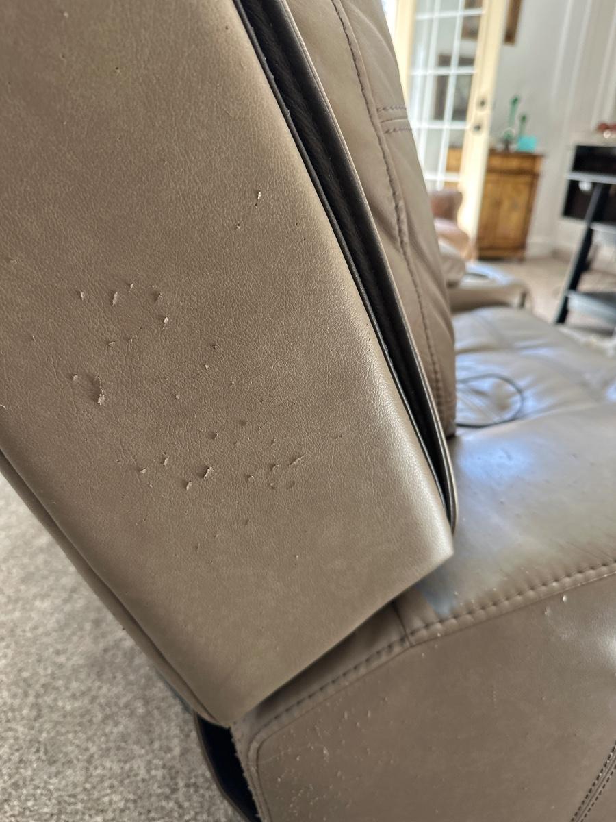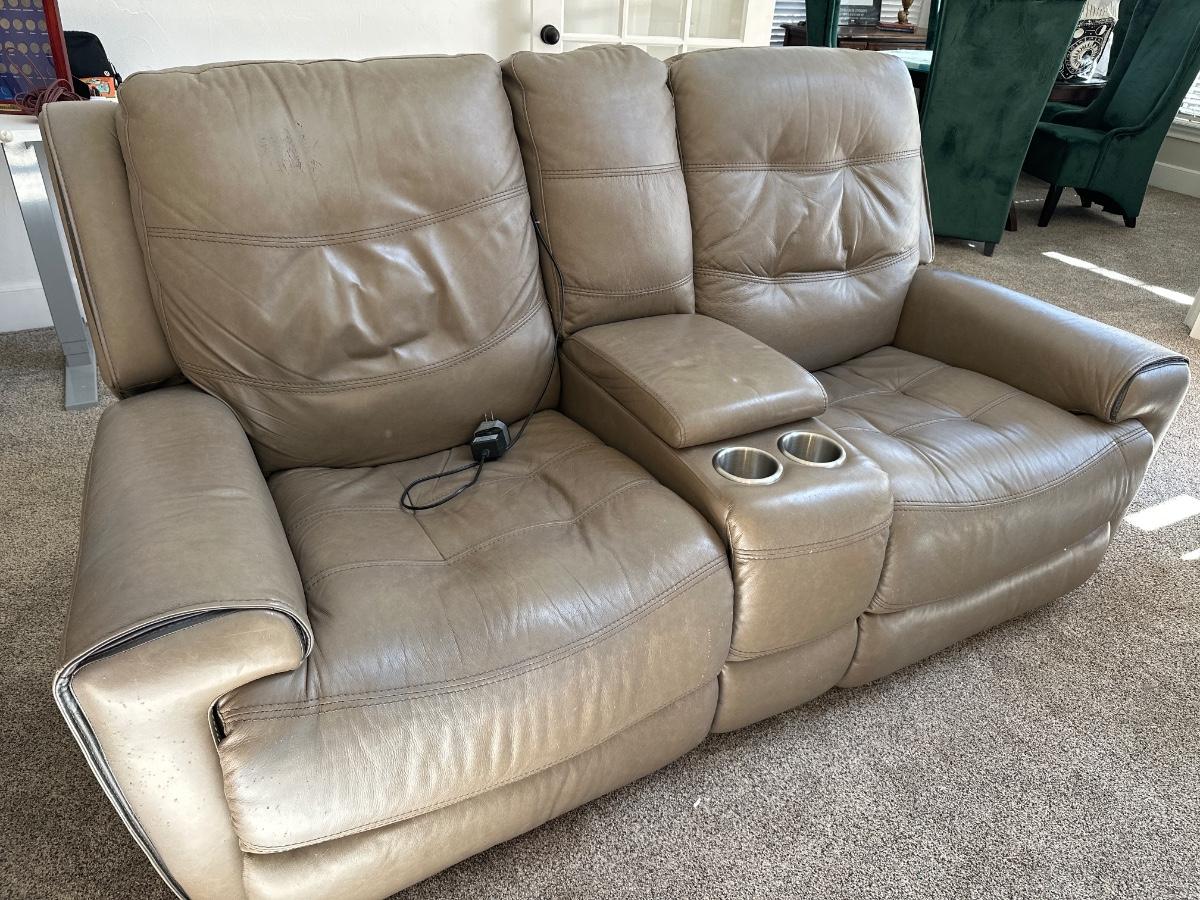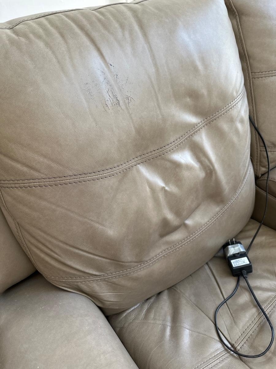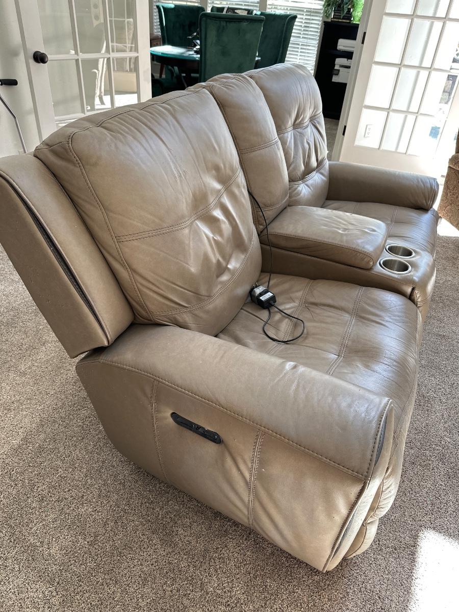 Leather double reclining sofa. full recline, metal cup holders. There’s discoloration to the leather some cat scratches. Small scratches on the leather .