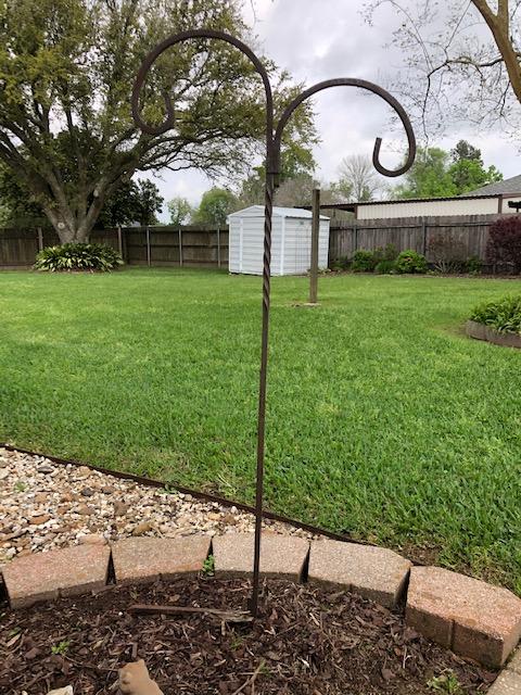 Solid wrought iron. Total height is 51 1/2” tall. Tallest hook is at 44” and lower hook is at 41”.