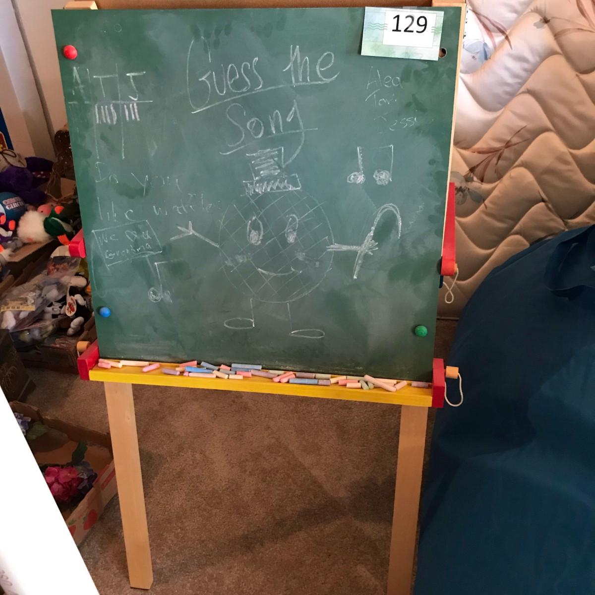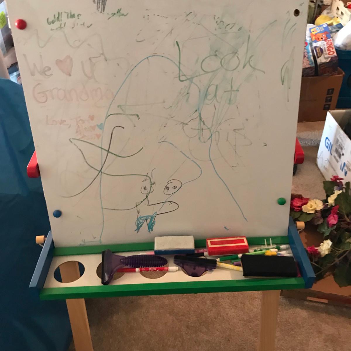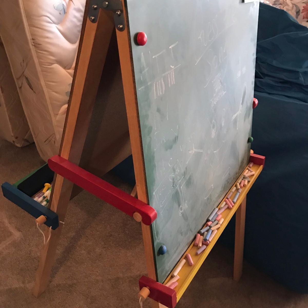 Double sided activity easel. One side chalk board, one side white board. I love white boards...they're remarkable!