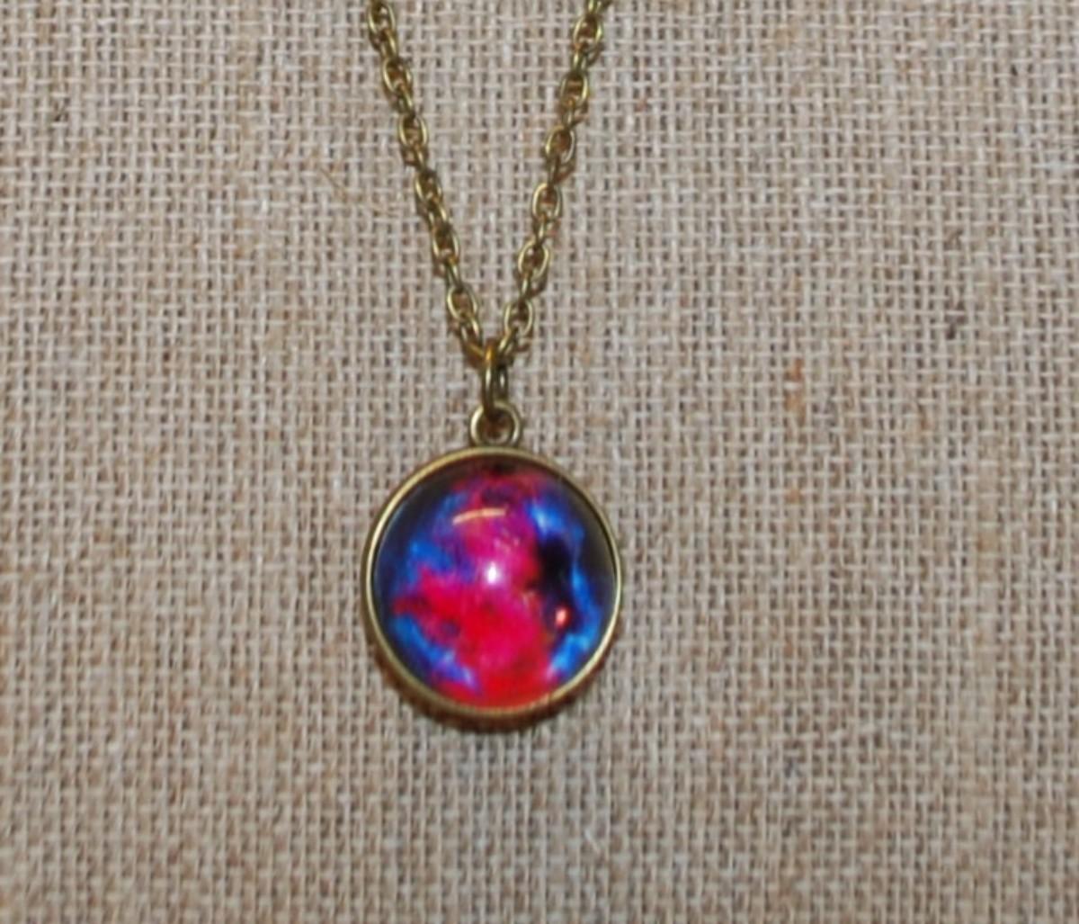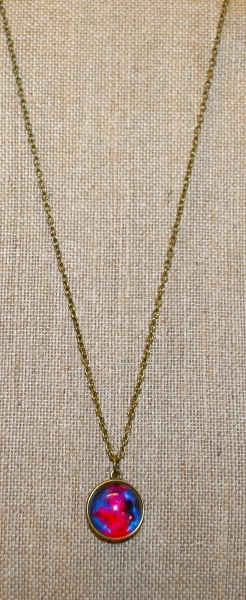 Double Sided Red & Blue "Fiery" Globe PENDANT (1" Circumference) on a Brass-Styled Necklace Chain 20" L