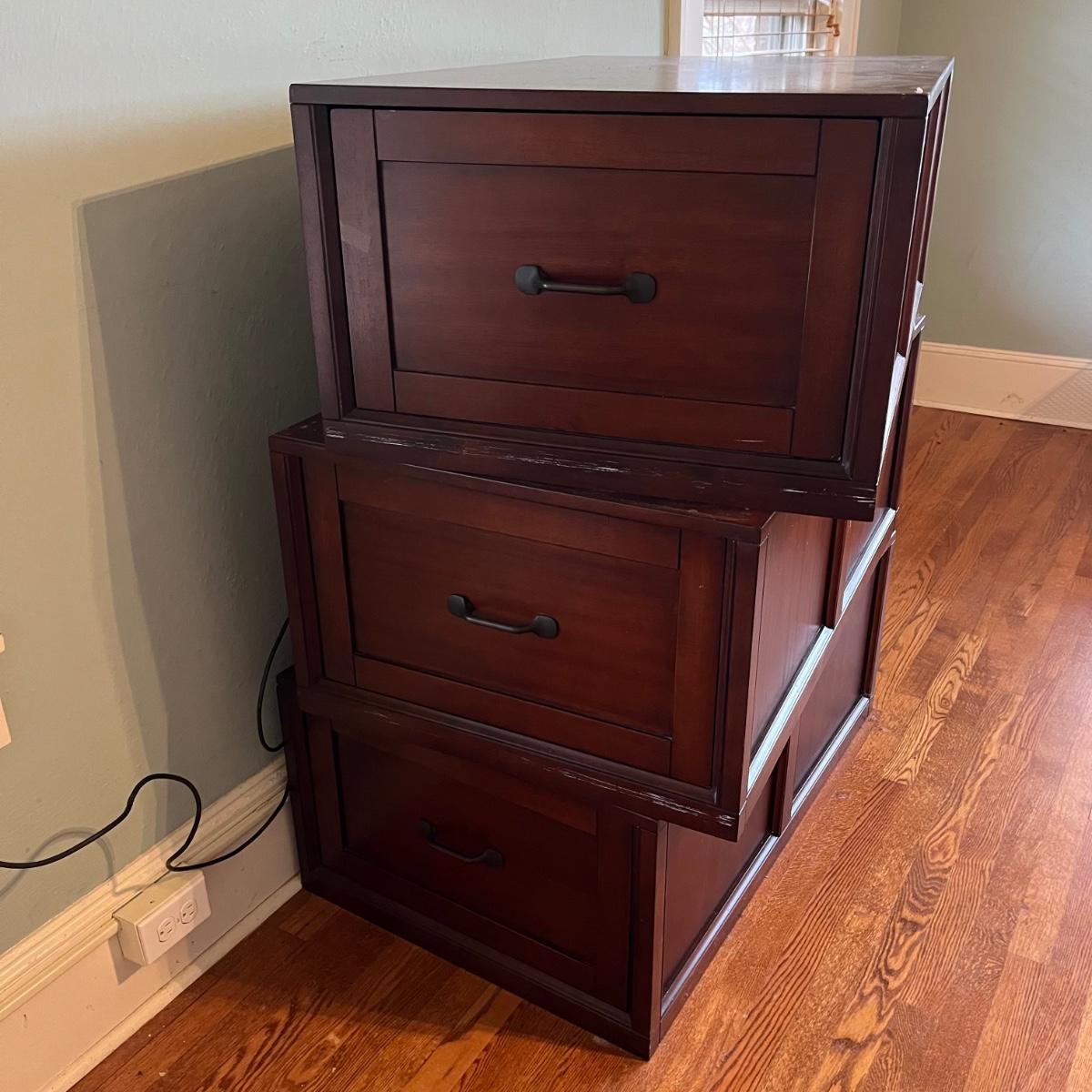 Appears to be one piece but is actually three units stacked. The six drawers are dovetailed. Overall measures 25” x 39” x 48”H. Each cube measures 25” x 39 x 16”H. Signs of wear.