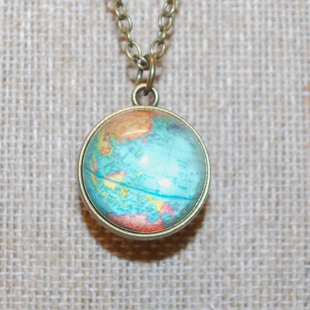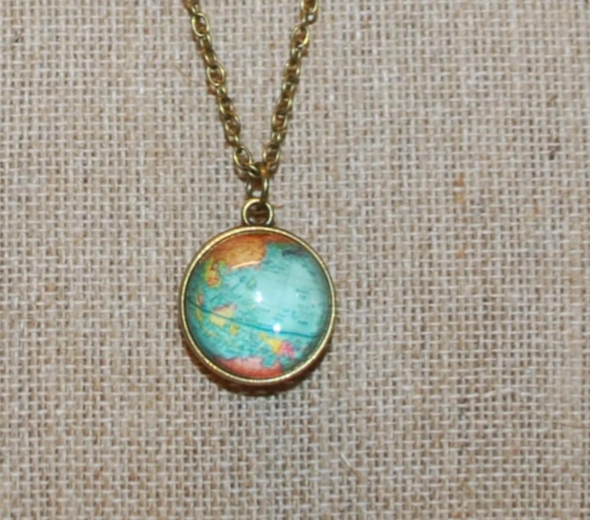 Double Sided World Globe PENDANT (1" Circumference) on a Brass-Styled Necklace Chain 20" L