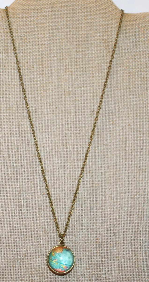 Double Sided World Globe PENDANT (1" Circumference) on a Brass-Styled Necklace Chain 20" L