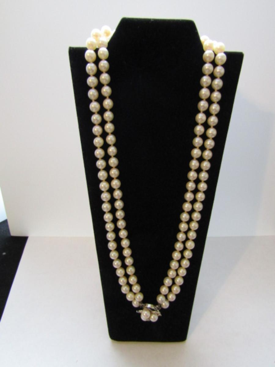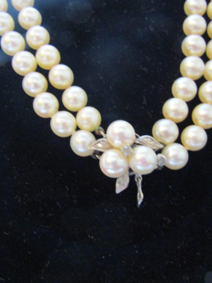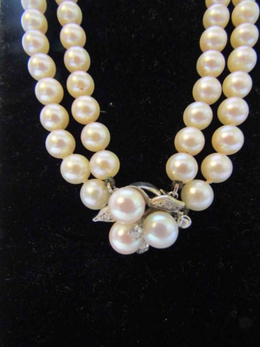 Double Strand Pearl Necklace with 14 Karat White Gold Clasp and Diamond Accents