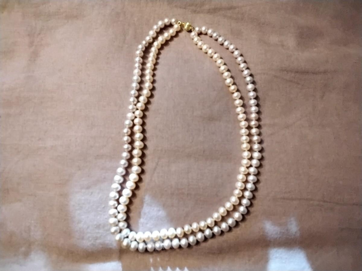 Double strand of Lavender and pink akoyas with an eye appealing high iridescent sheen. The Lavender is 18" and pale pink is 16". Absolutely stunning set of pearls each individually knotted on double silk strands, these really are quite beautiful and unique as I special ordered this pair.