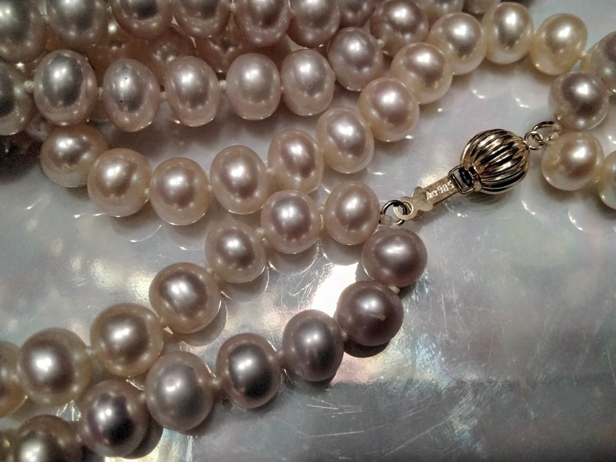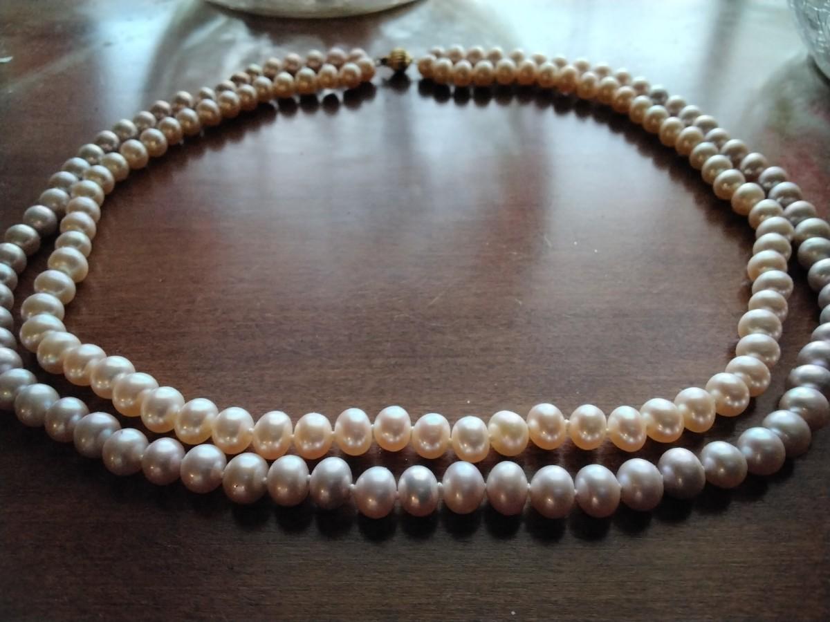 Double strand of Lavender and pink akoyas with an eye appealing high iridescent sheen. The Lavender is 18" and pale pink is 16". Absolutely stunning set of pearls each individually knotted on double silk strands, these really are quite beautiful and unique as I special ordered this pair.