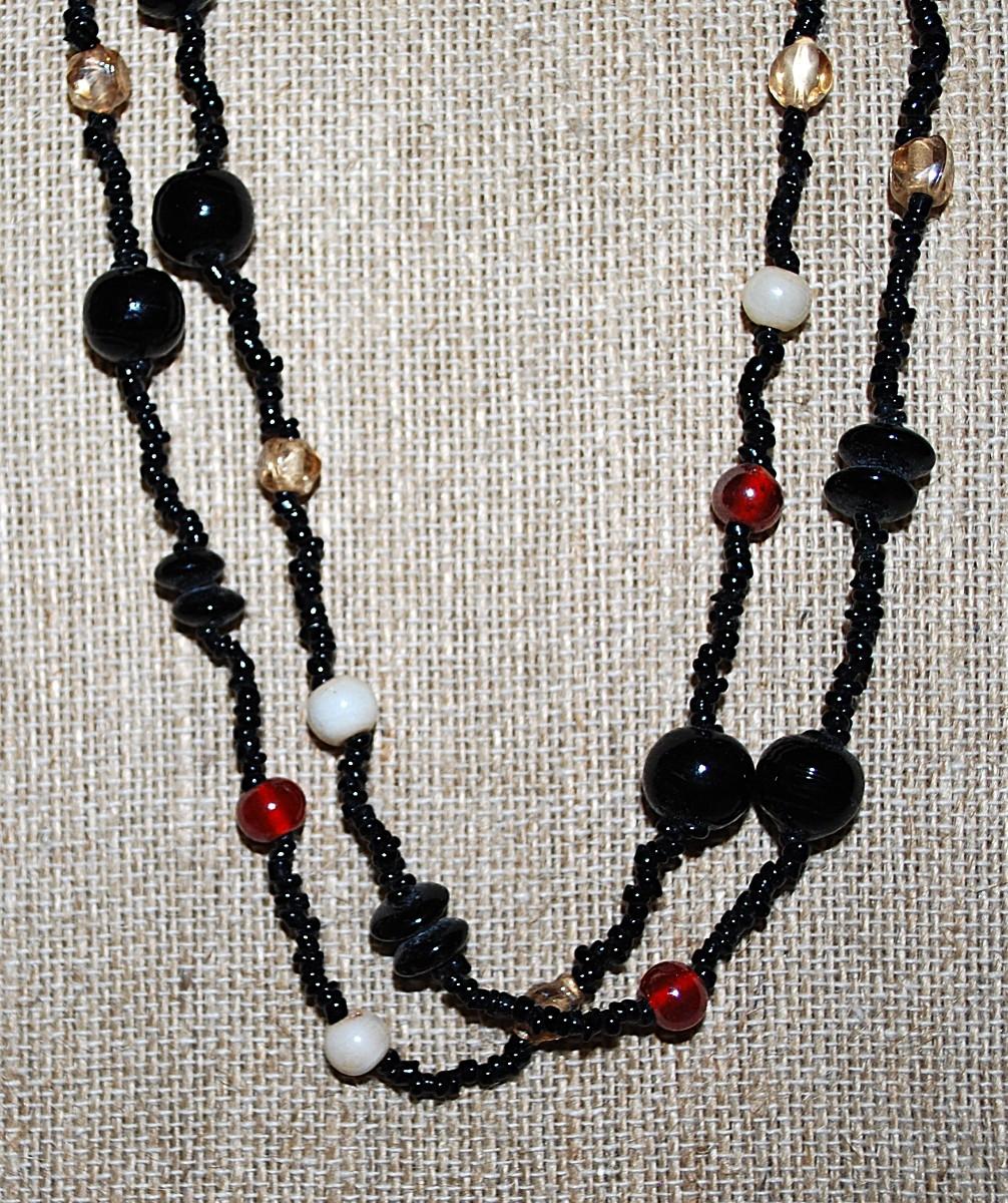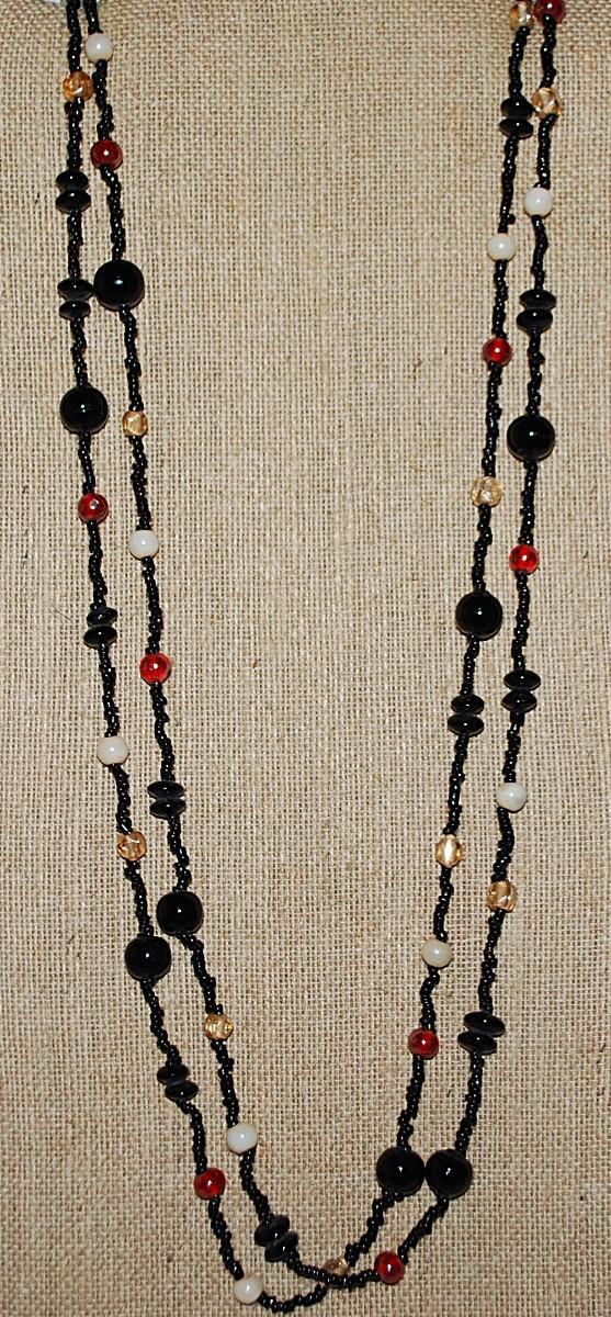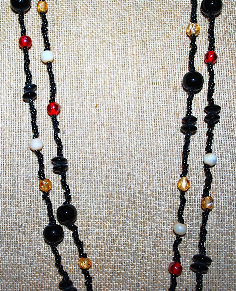 Double Strands Wrap-Around NECKLACE with Black, Amber, White & Beige Stones on a Continuous Black Beaded String 44" L