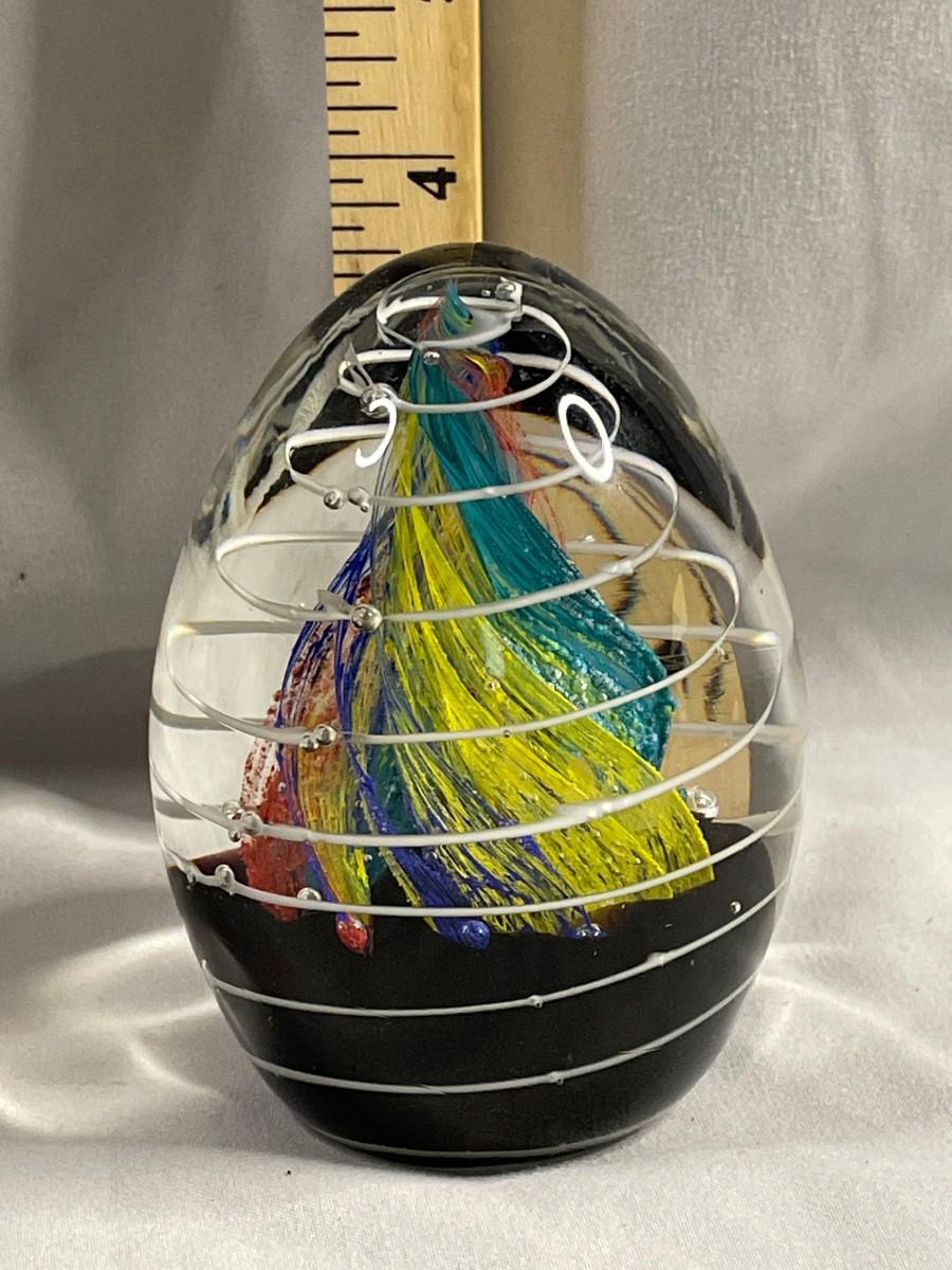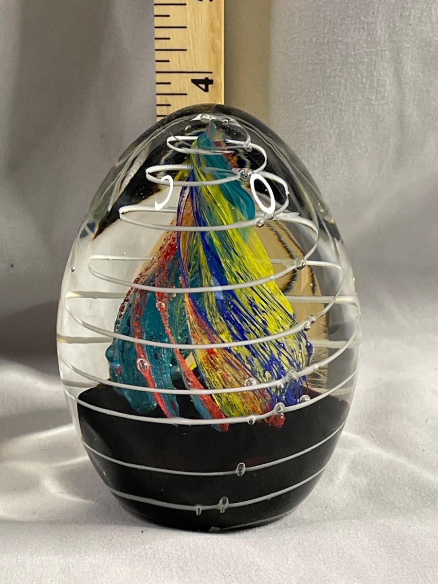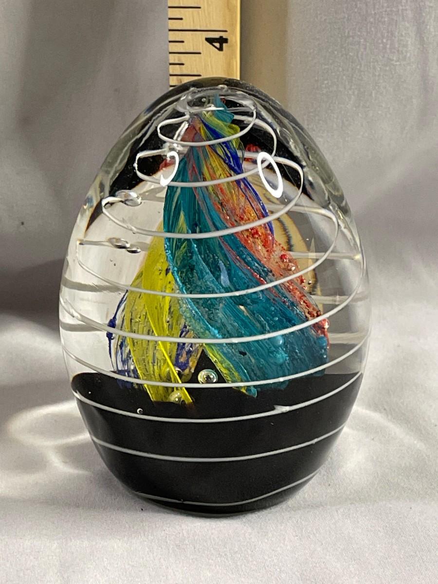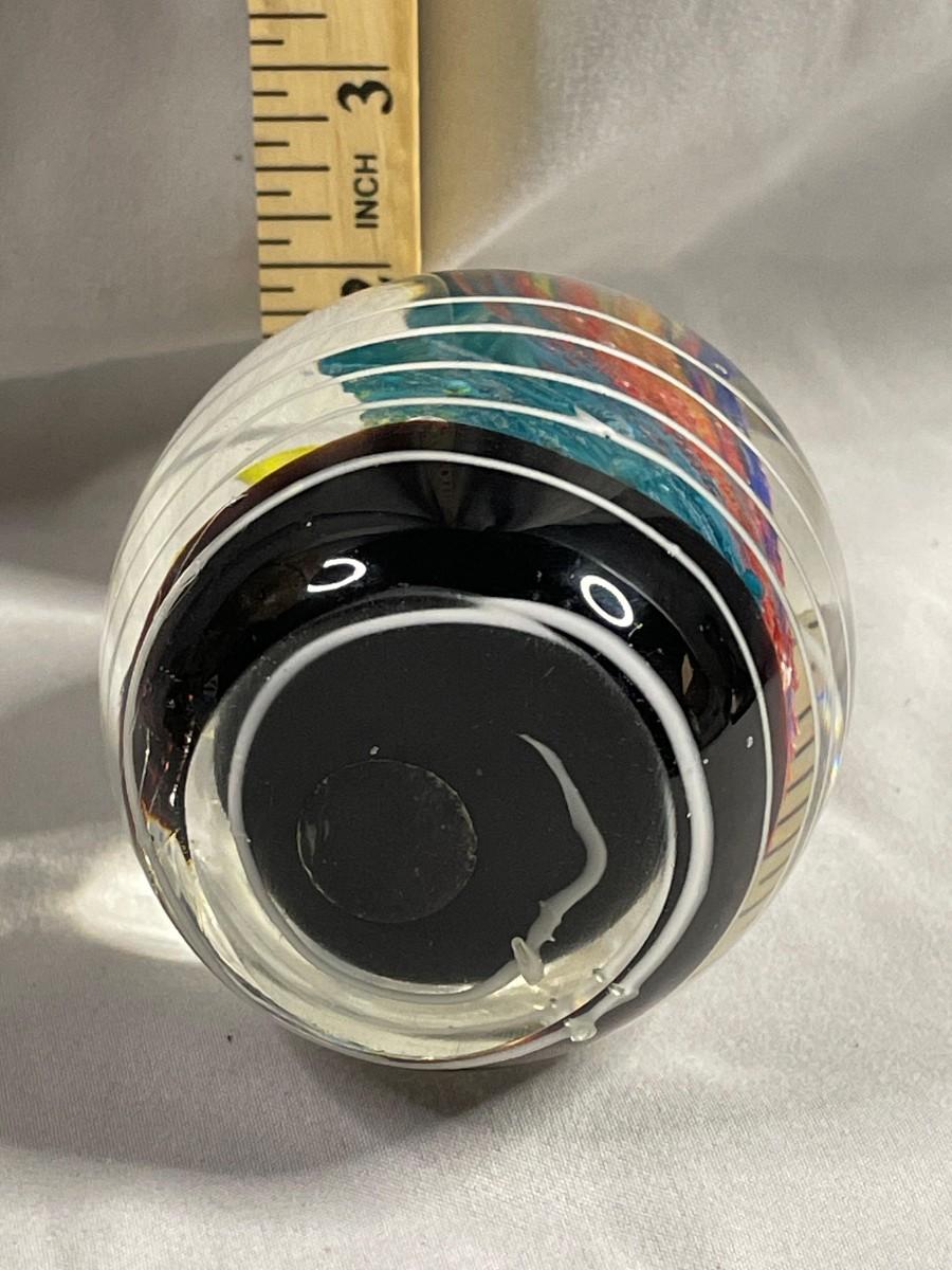 The white band swirl is going in the opposite direction of the multi color swirl. This paperweight is in excellent condition with no issues found.<br />