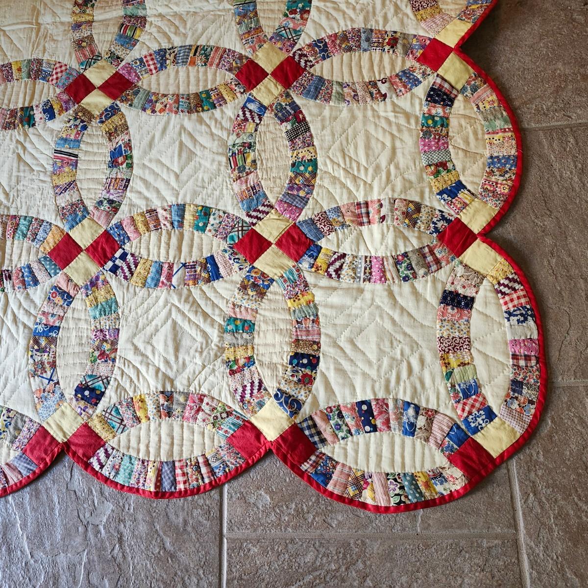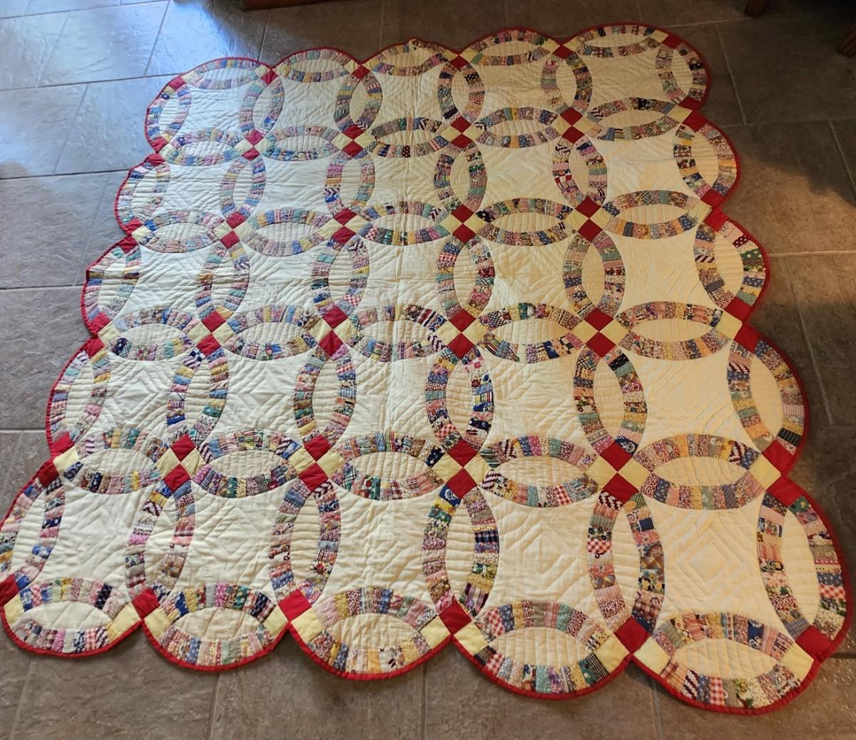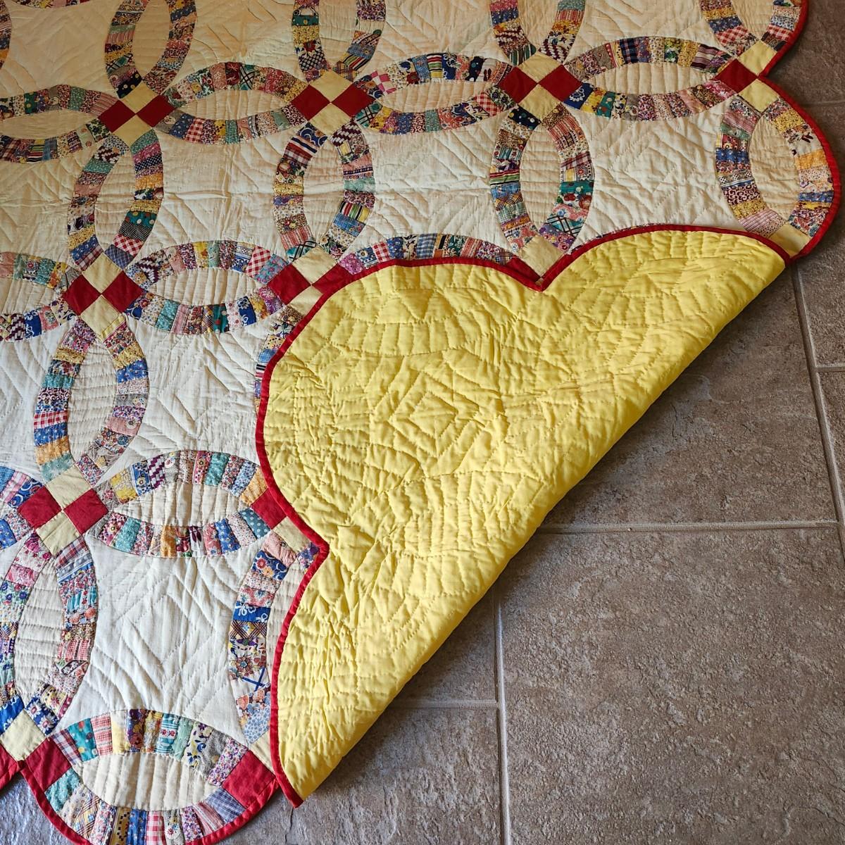 Beautiful handmade quilt , scalloped edge, yellow backing. Thee are a few spots on the backing, otherwise very nice condition. 76 x 78 inches.