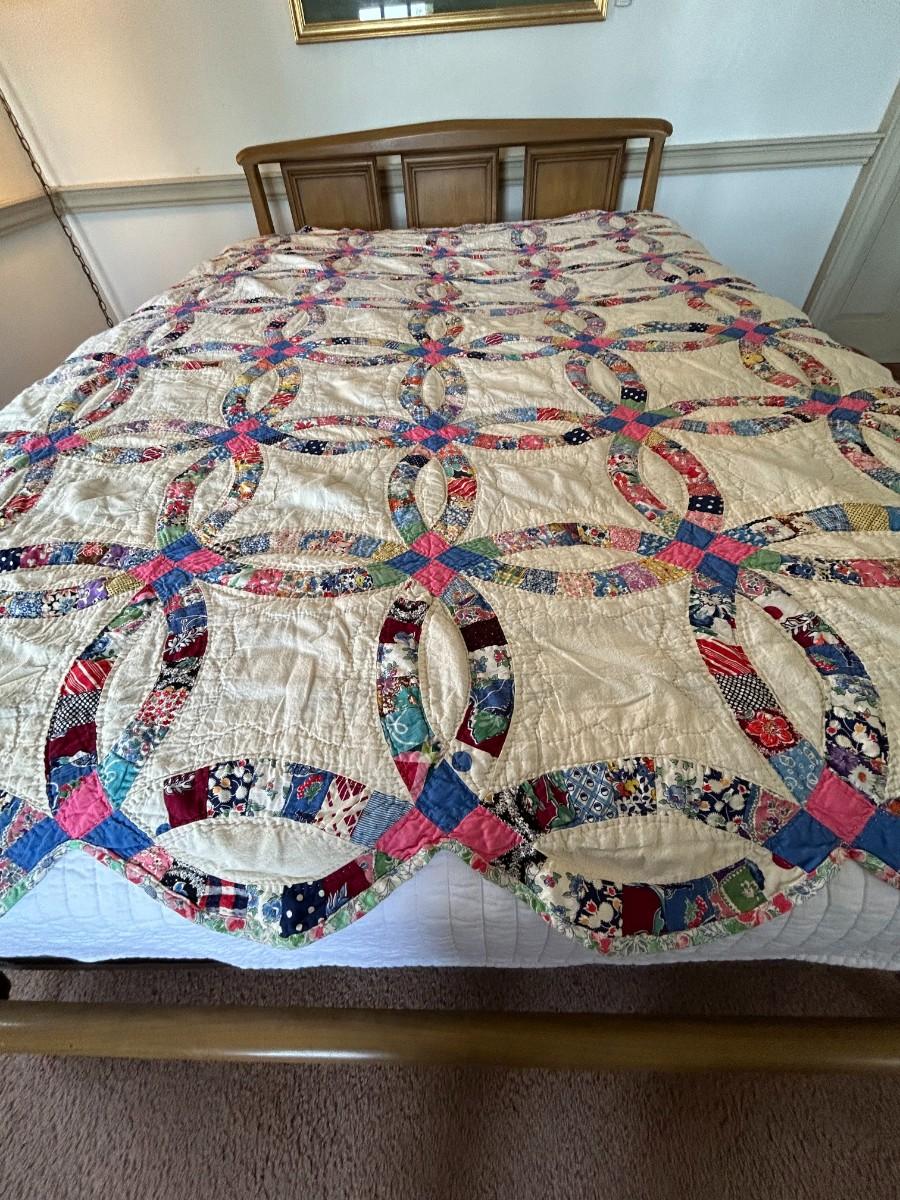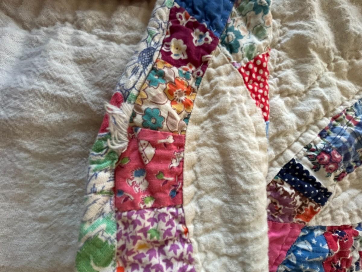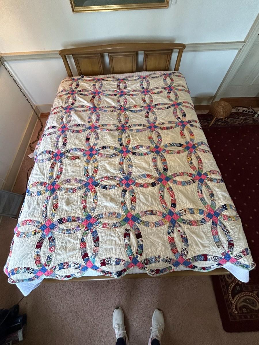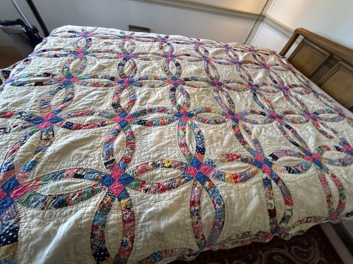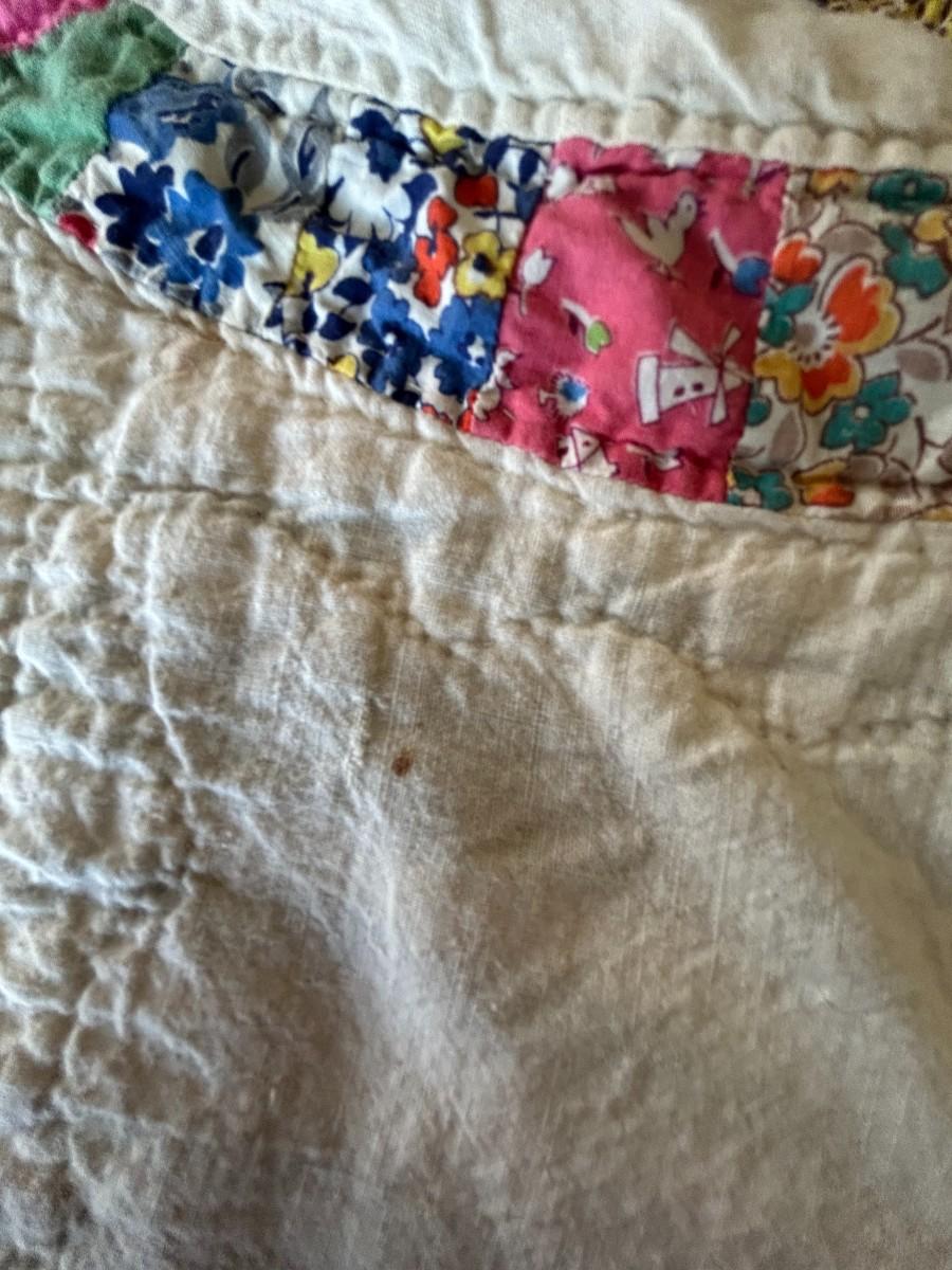 Beautifully crafted quilt with one small stain, otherwise no issues. Laying on queen size bed.