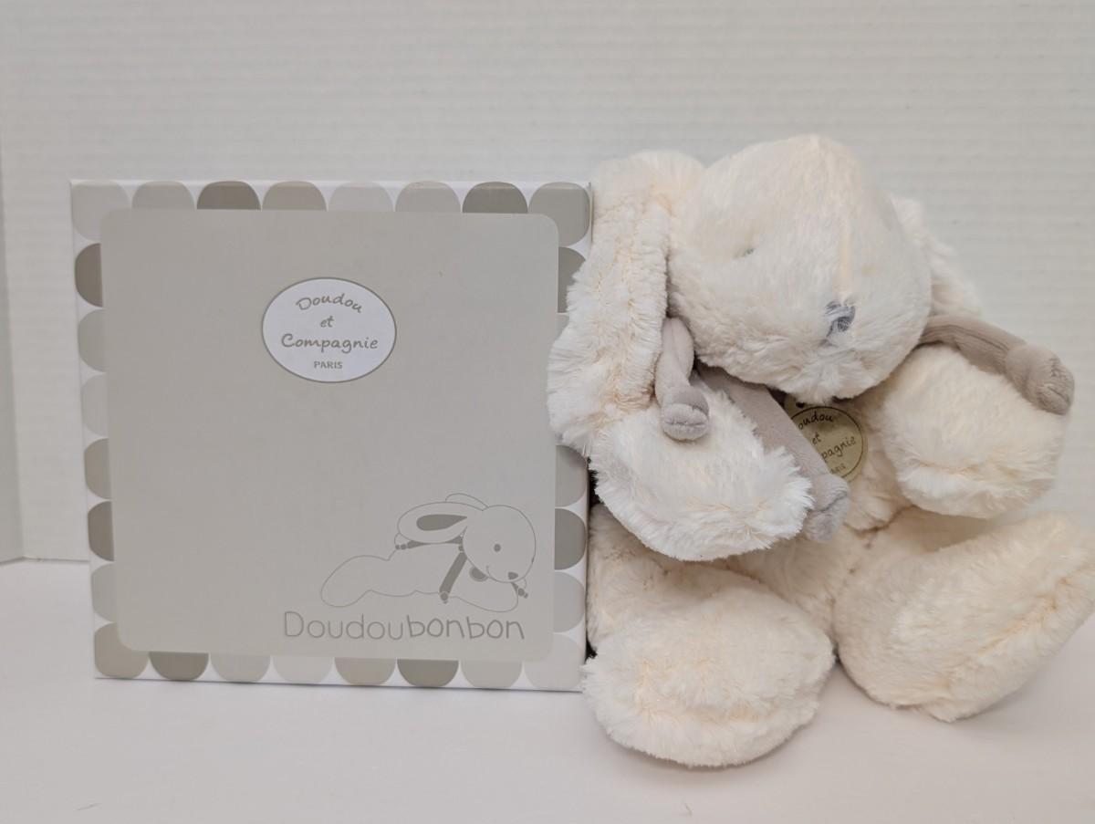 Adorable Doudou et Compagnie Doudoubonbon plush bunny from Paris, featuring ultra soft cream fur and taupe details. Comes in its original gift box, making it perfect for a newborn present, nursery décor, or collectible plush. French-made luxury known for its quality and charm.