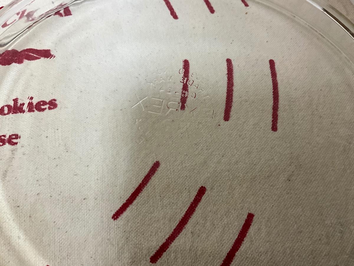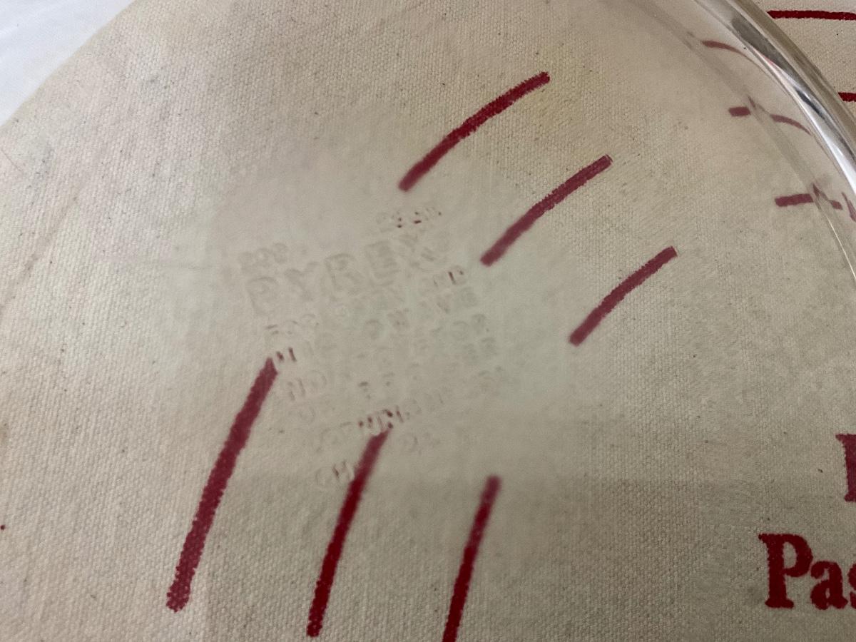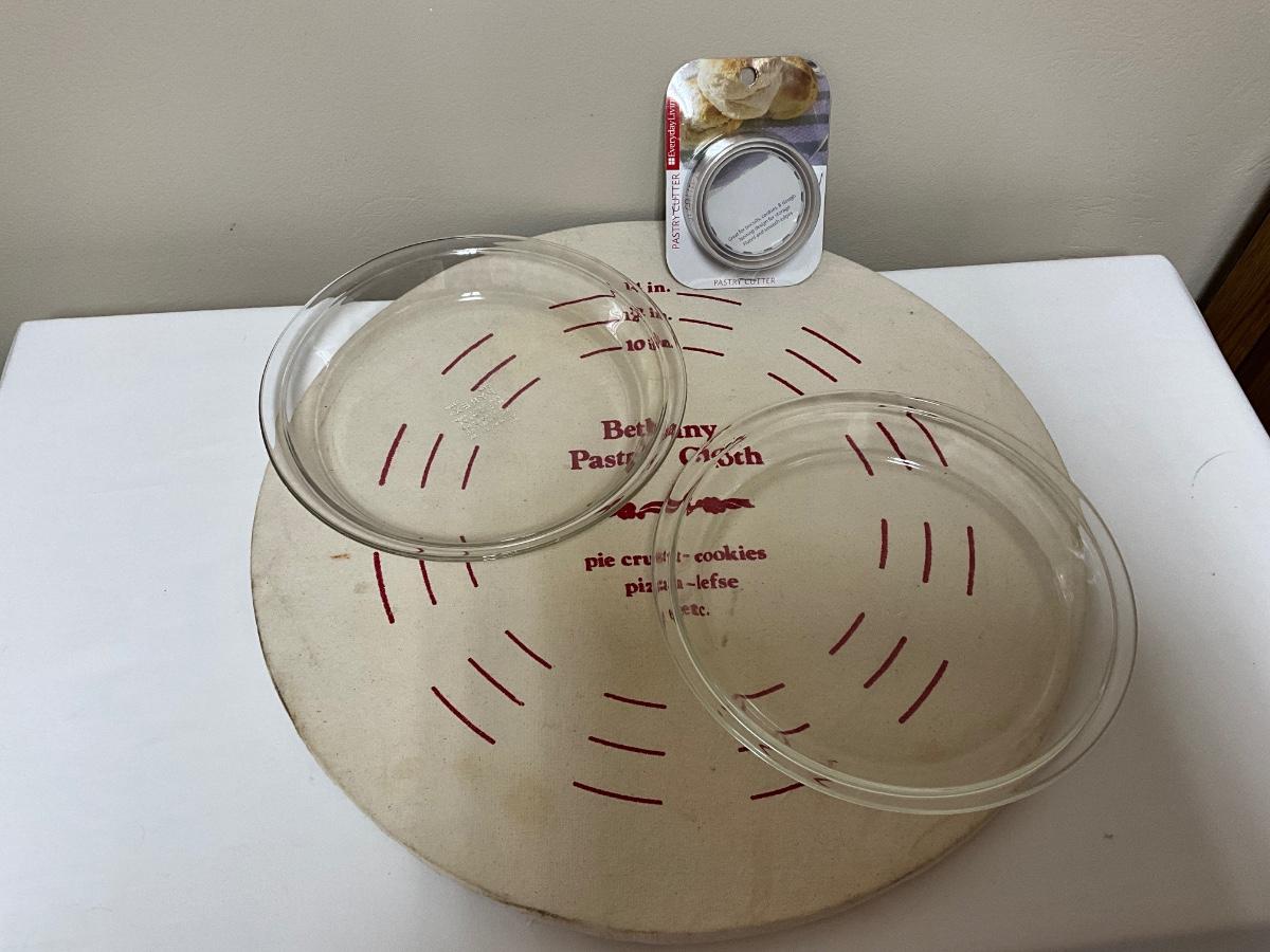 Pasty cloth w/board, 2 Pyrex pie plates, biscuit cutters