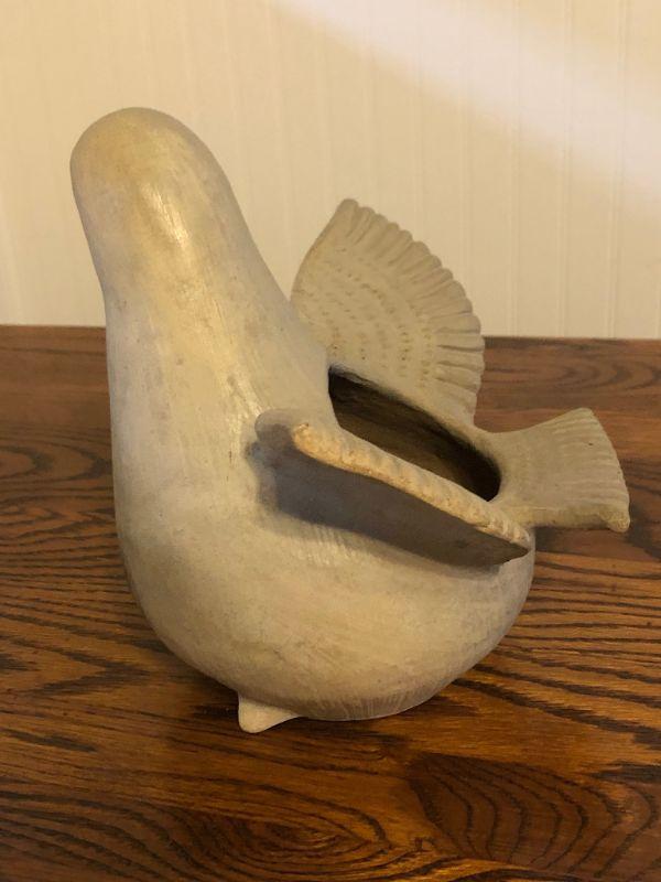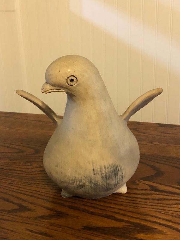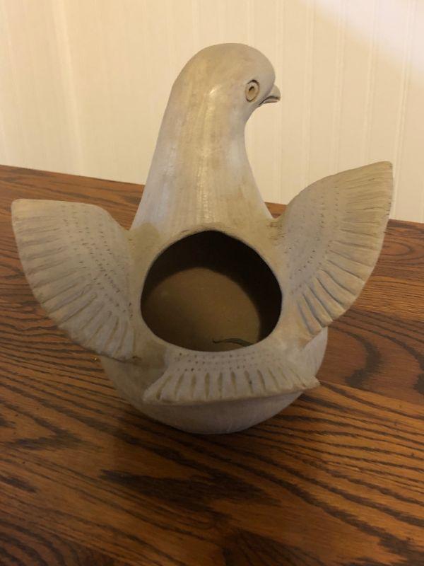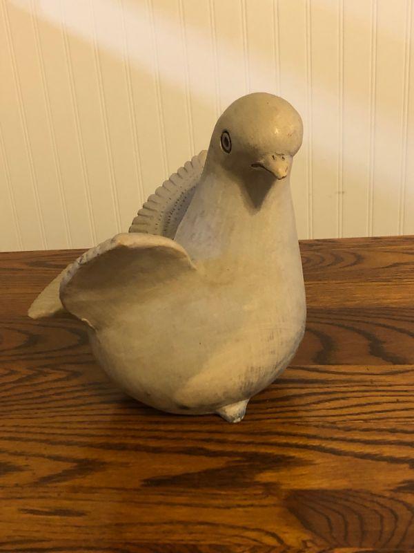 Vintage bird planter. Looks like a dove or pigeon. Open wings. Has a chipped beak.